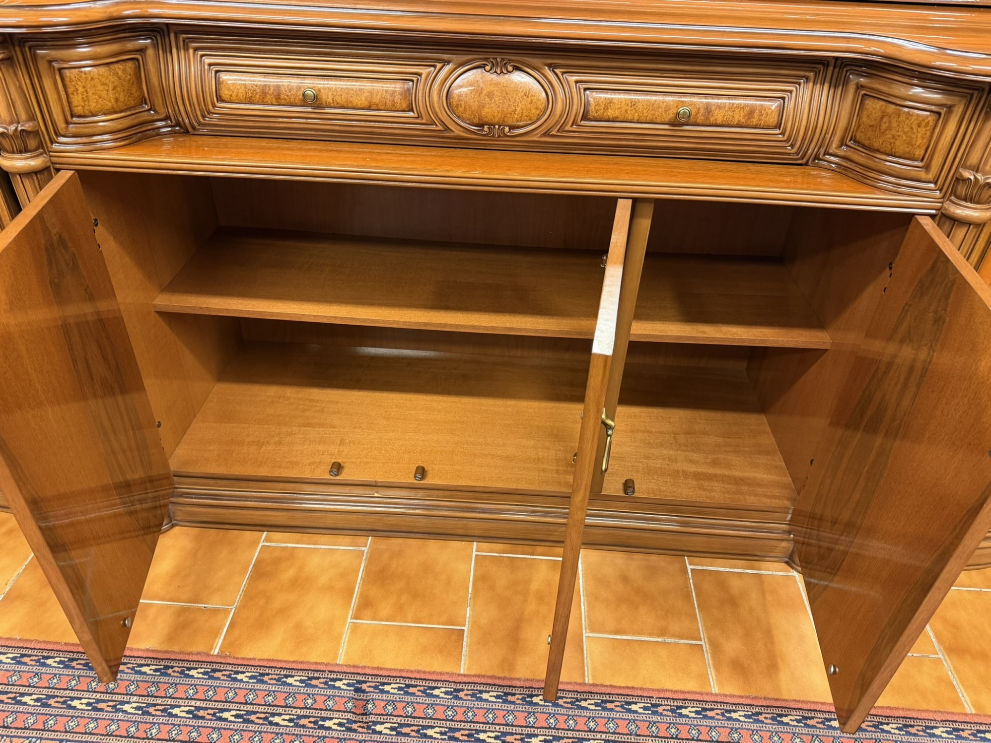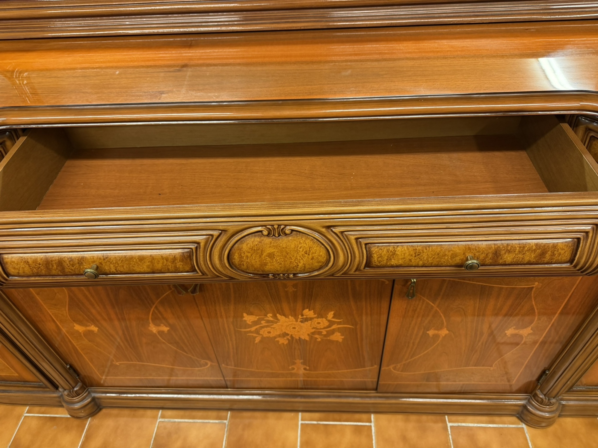Intarzovaný příborník s bohatou řezbou