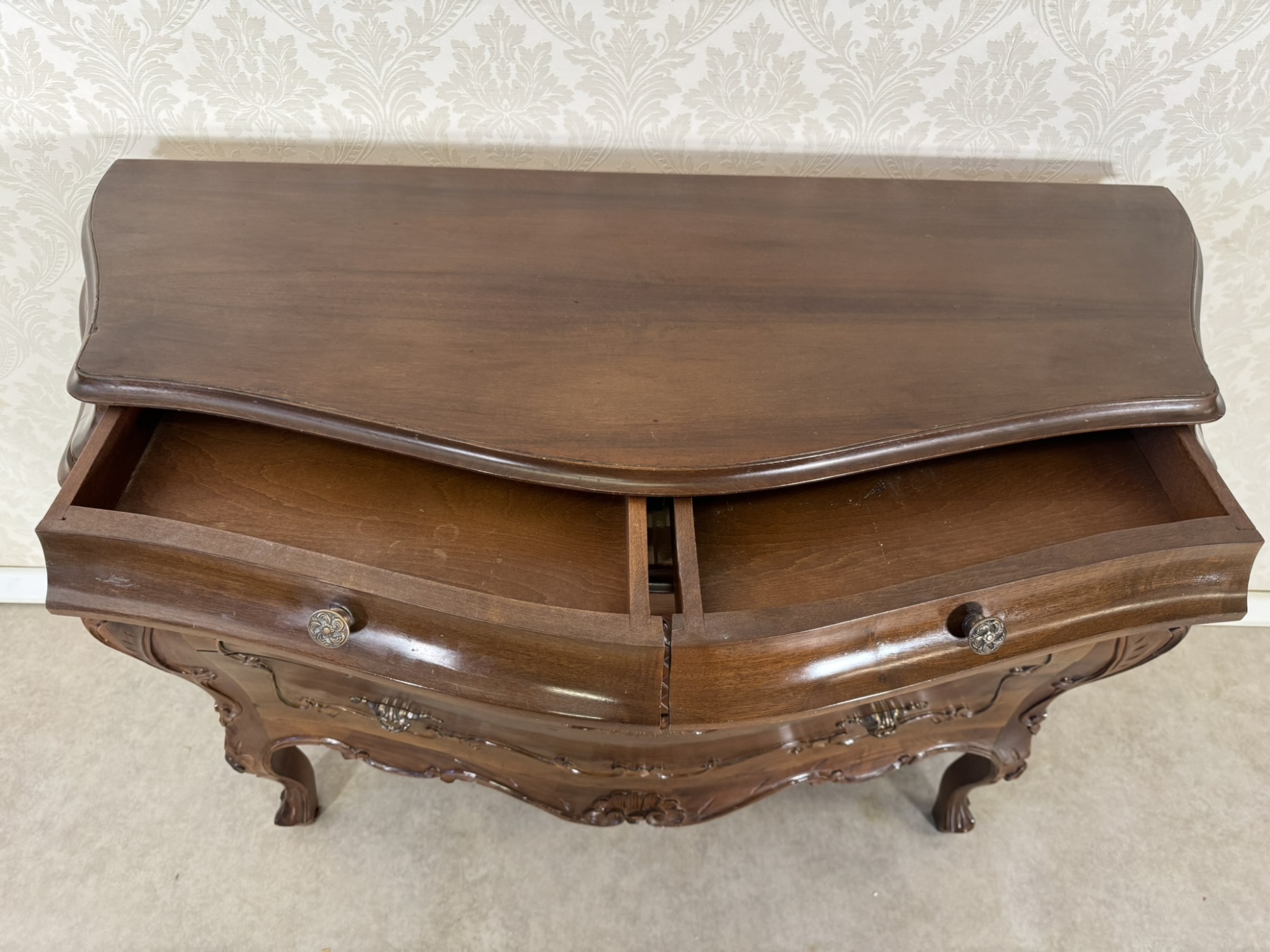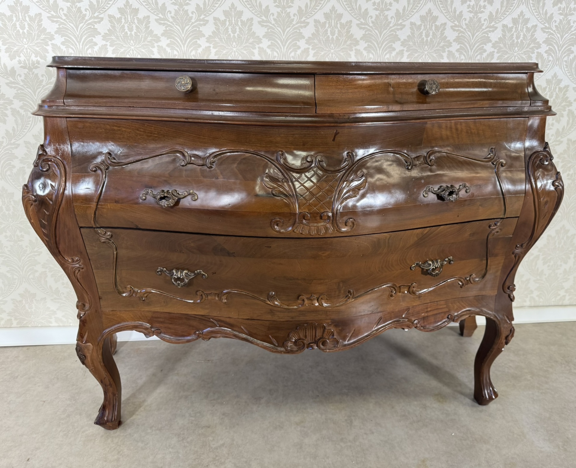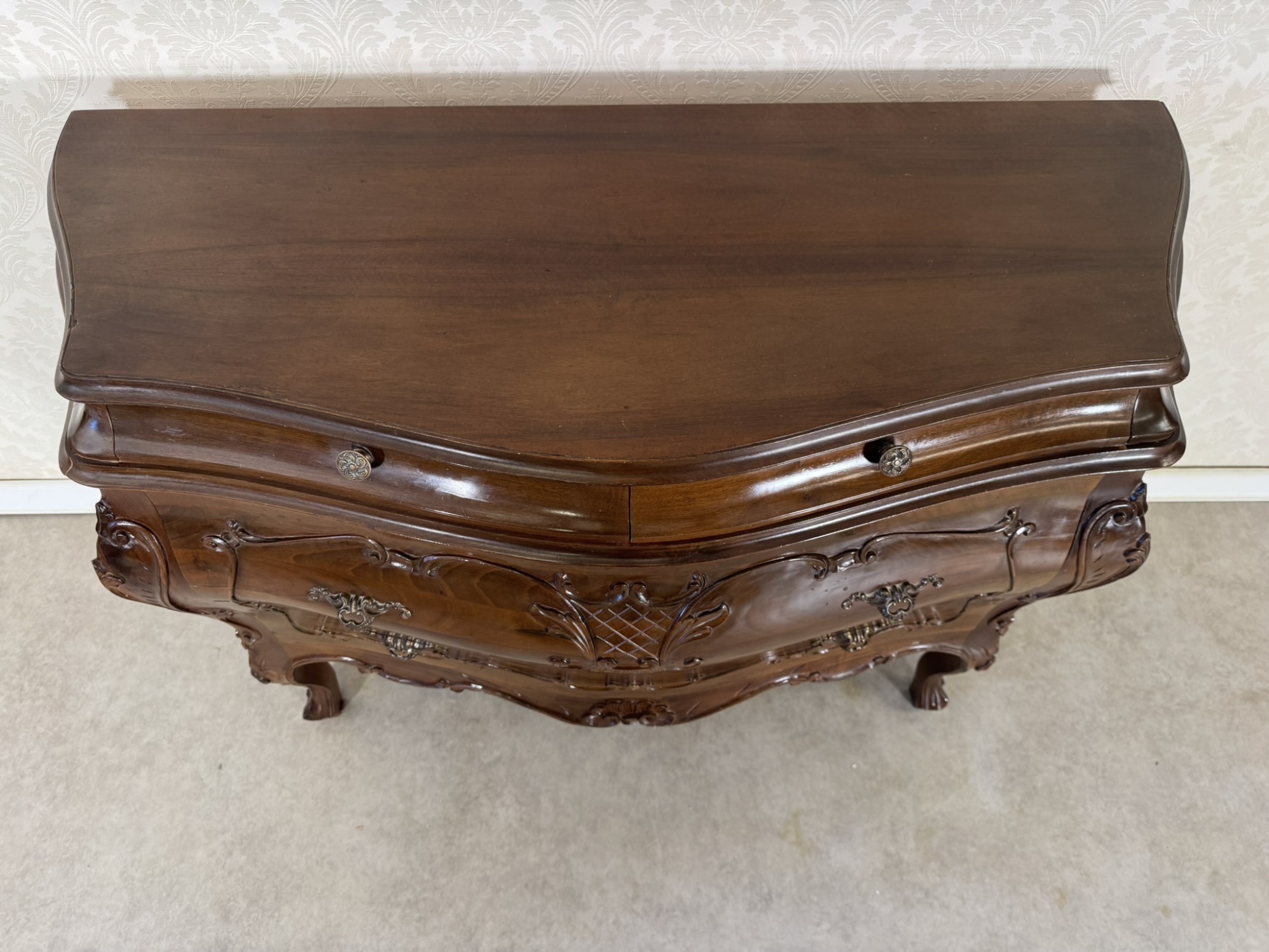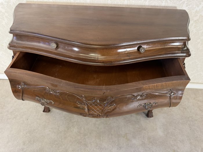 Přední část břichatky zdobí jemné ornamenty a elegantní kovové úchyty, které podtrhují její noblesní charakter. Komoda disponuje prostornými zásuvkami, ideálními pro uložení drobných předmětů. Stojí na křivkovitě tvarovaných nohách, které dodávají celku lehkost a harmonii.17 980 Kč