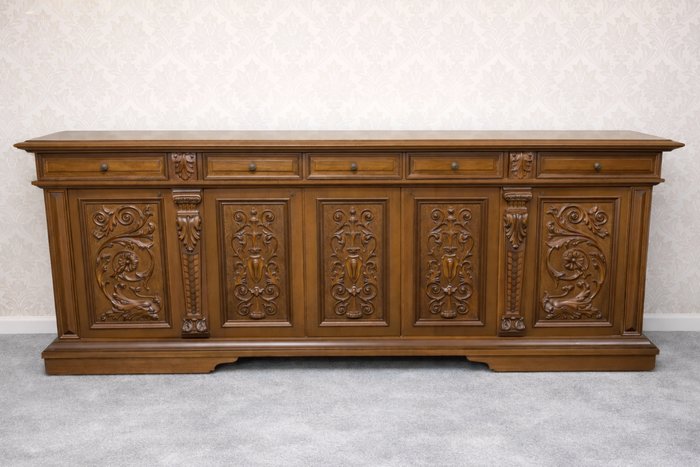 Elegantní komoda, zdobená výraznou řezbou v historizujícím stylu. Pět dvířek, členěných do kazet, vnitřní úložné sekce s policemi, pět praktických zásuvek. Stylové akantové motivy, profilované pilastry a kvalitní řemeslné zpracování. Elegantní, stabilní kus nábytku.22 680 Kč