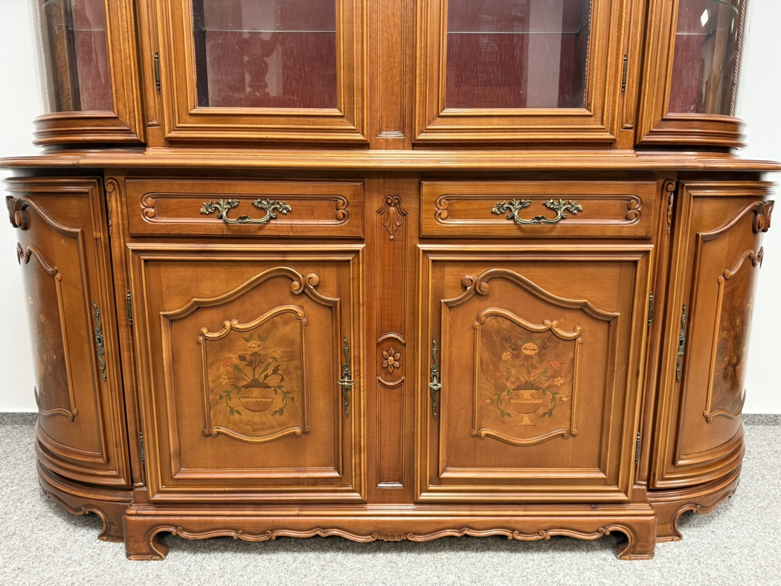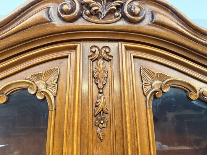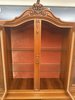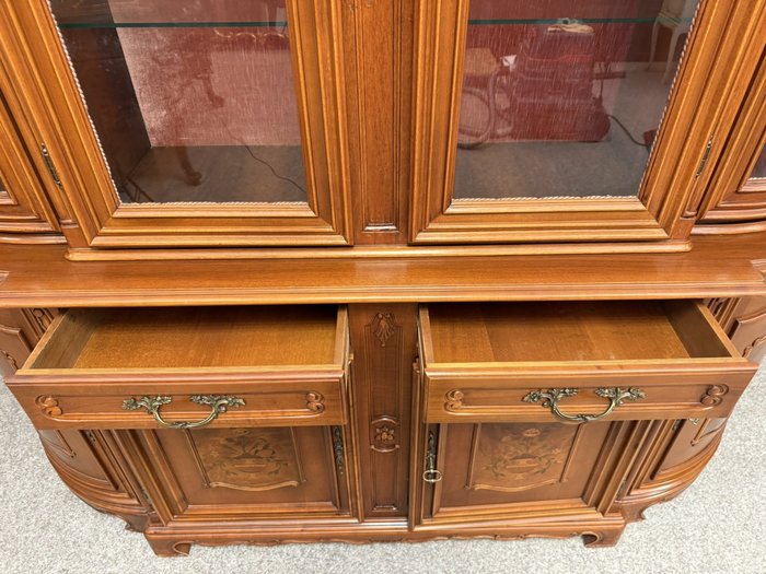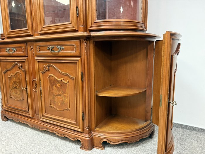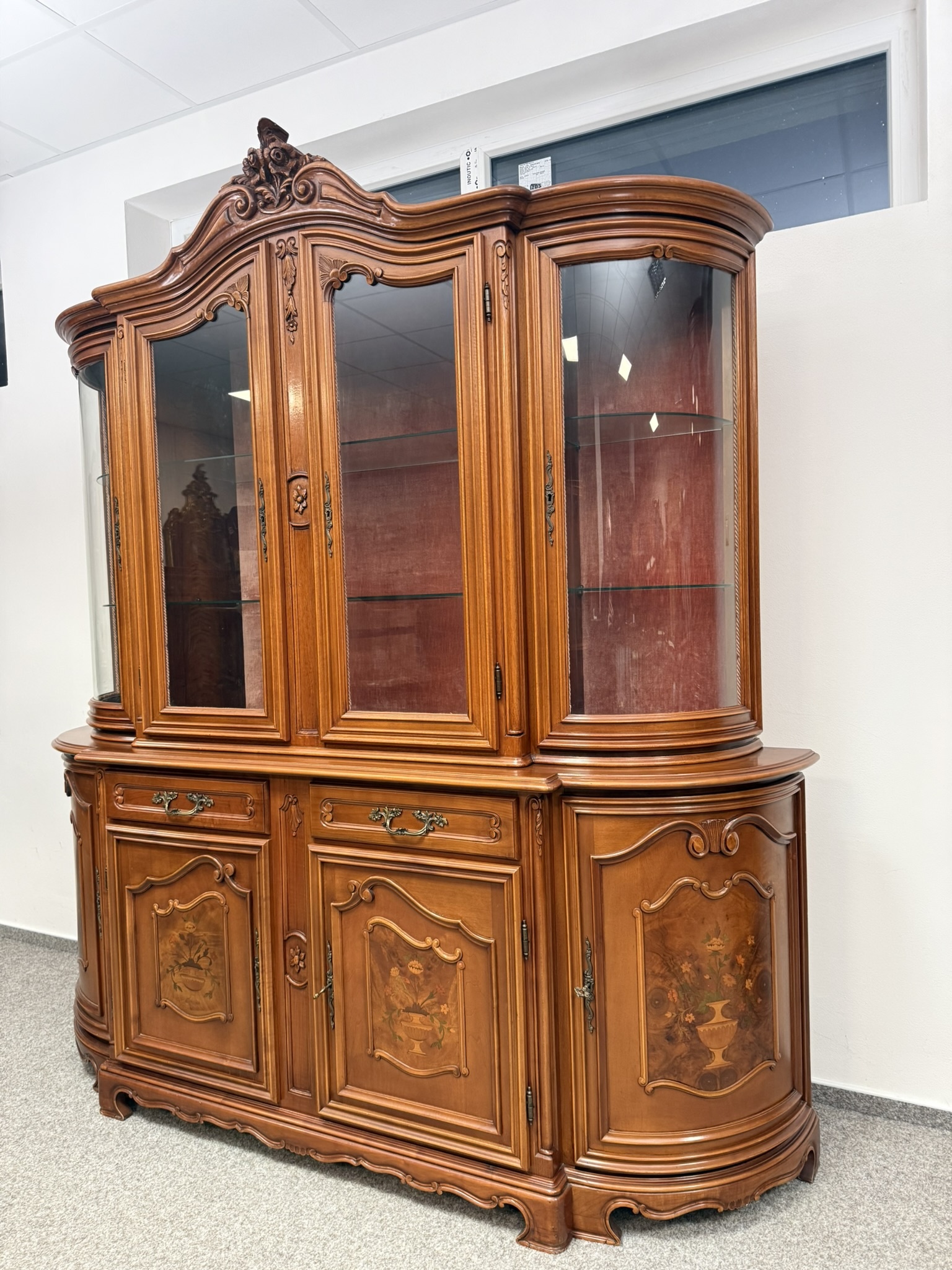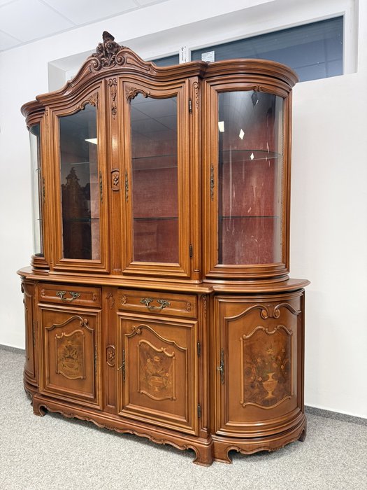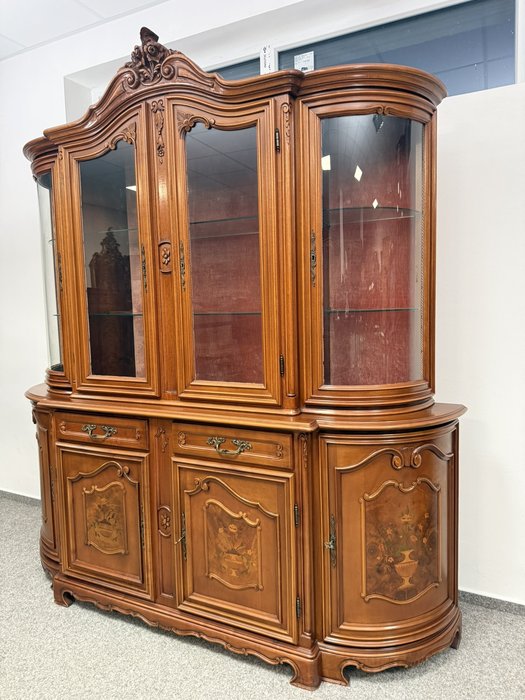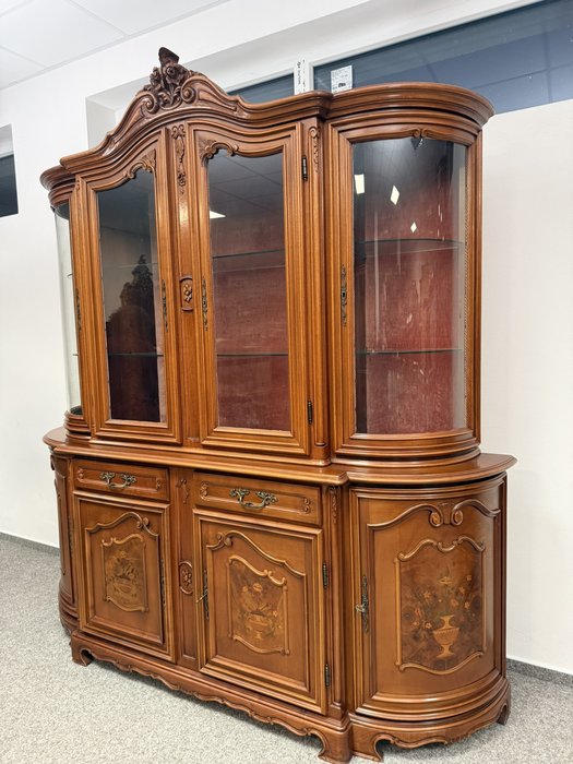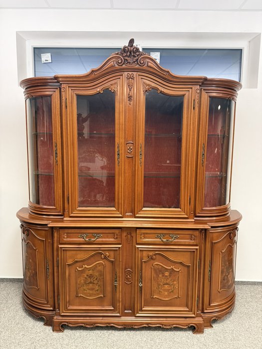 Luxusní vitrína s výrazně tvarovanou korunkou, květinovou řezbou a bohatou intarzií na spodních dvířkách. Vrchní část je prosklená s červeným pozadím a skleněnými policemi. Spodní část nabízí úložný prostor s dřevěnými policemi, dekorativními prvky a kováním.34 970 Kč
