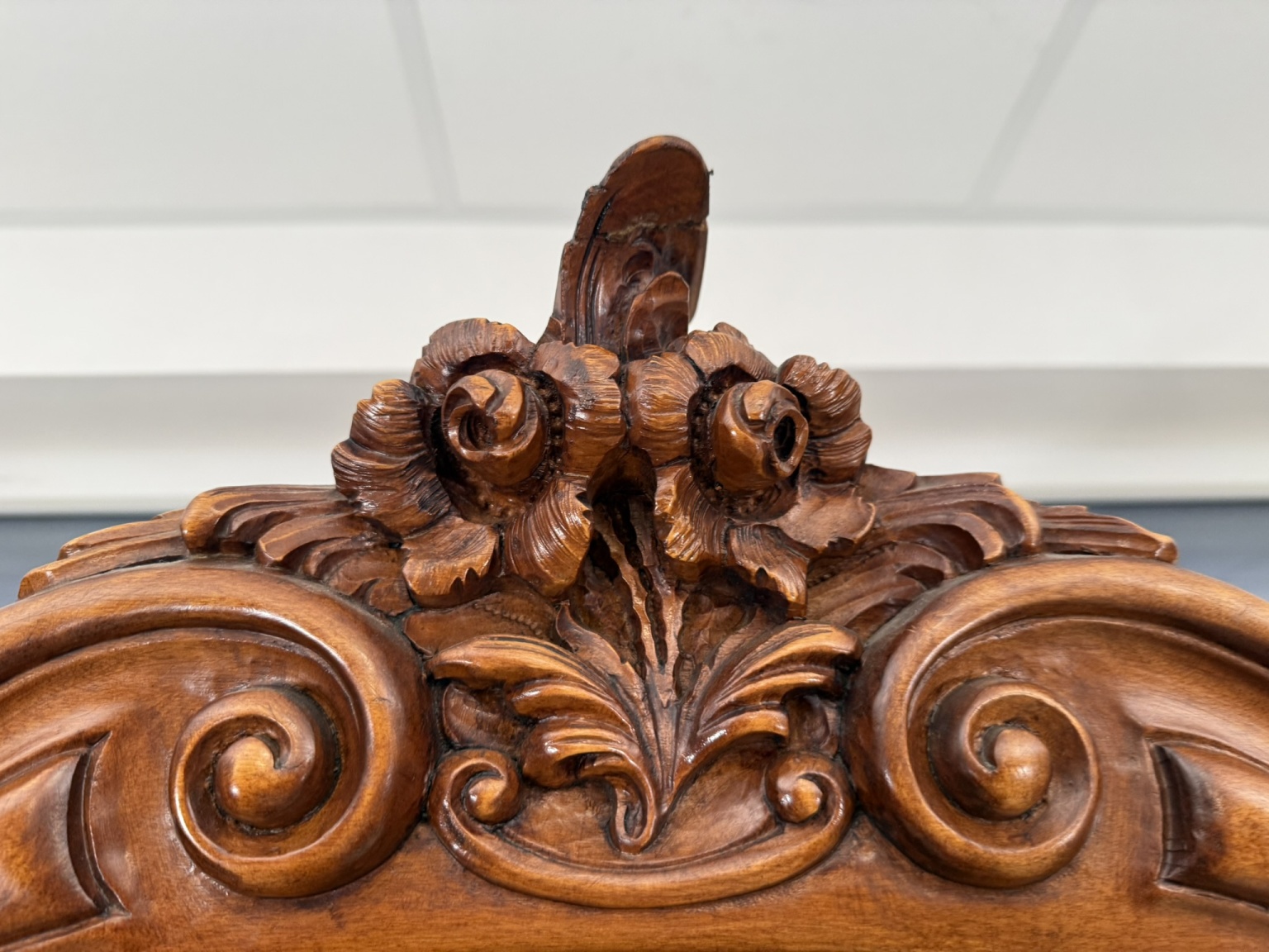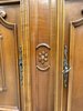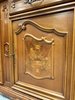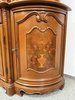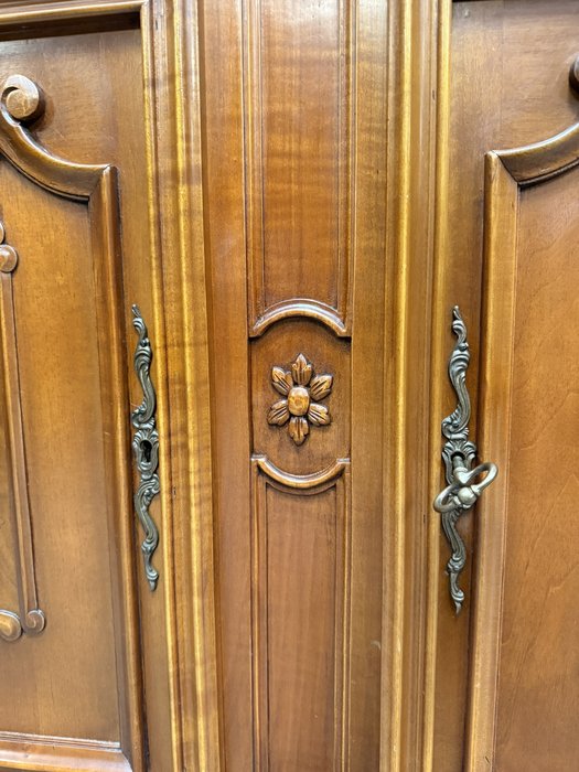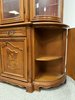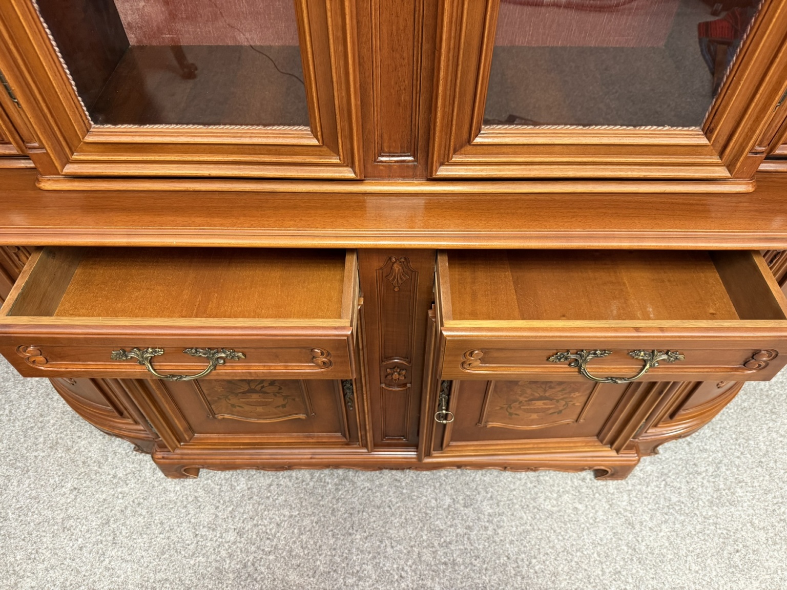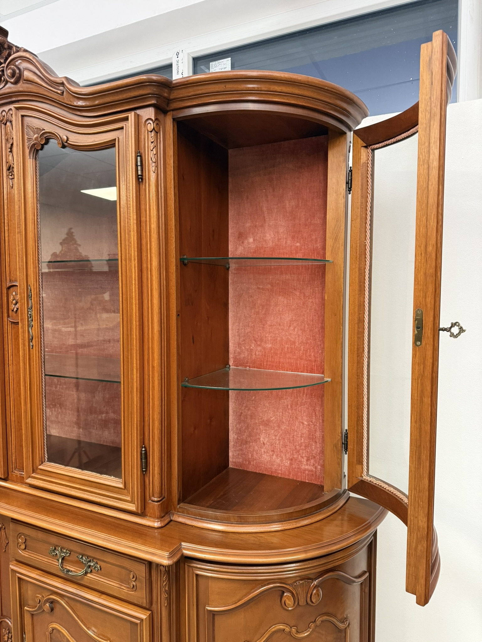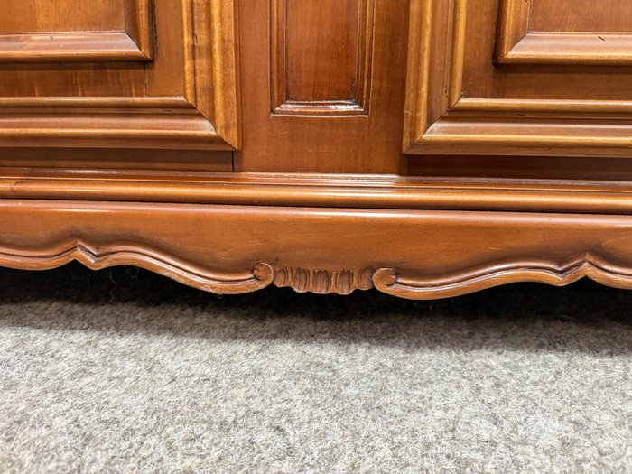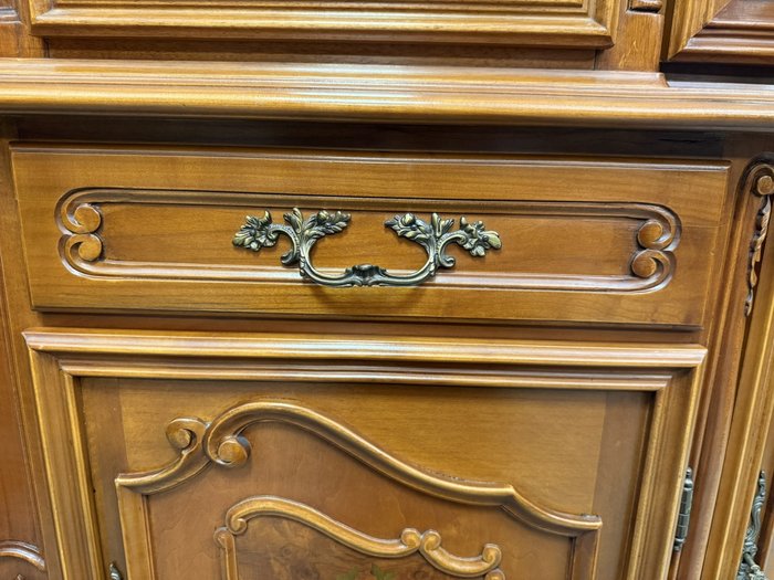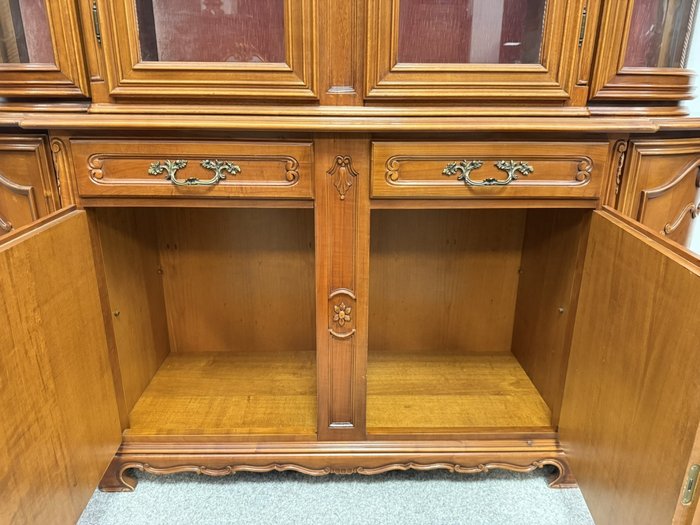 Luxusní vitrína s výrazně tvarovanou korunkou, květinovou řezbou a bohatou intarzií na spodních dvířkách. Vrchní část je prosklená s červeným pozadím a skleněnými policemi. Spodní část nabízí úložný prostor s dřevěnými policemi, dekorativními prvky a kováním.34 970 Kč