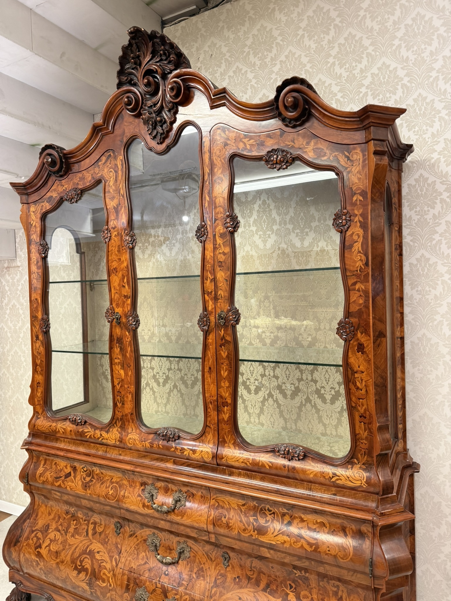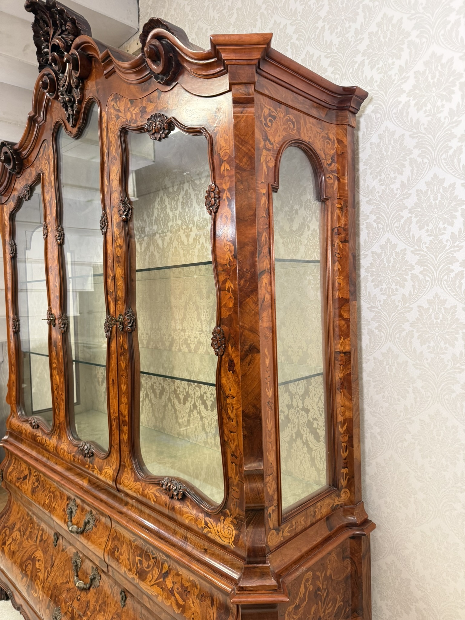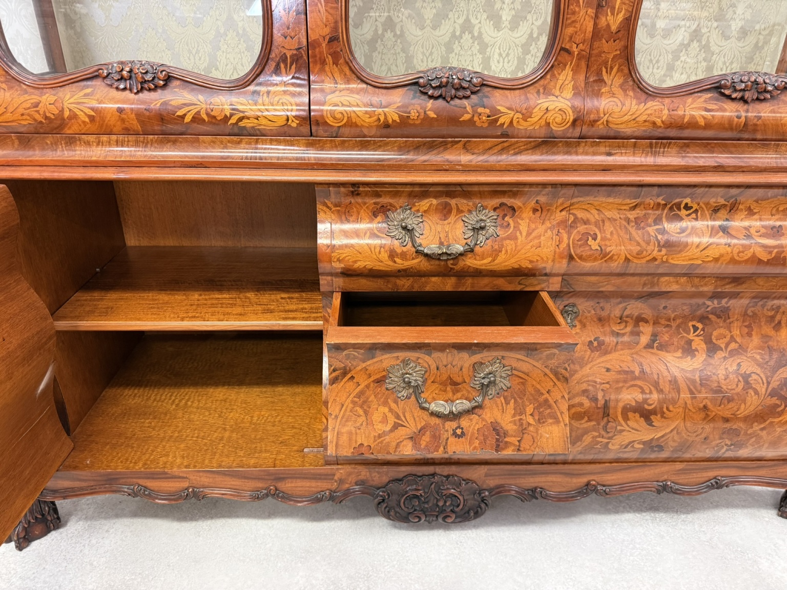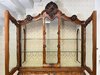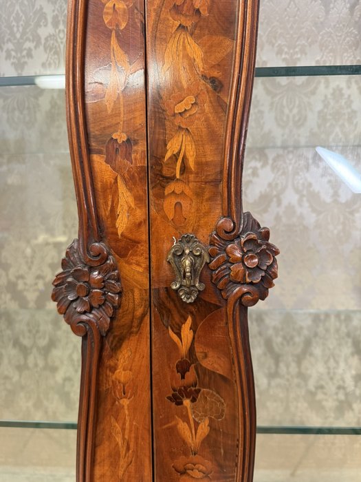 Vitrína s intarzií a výraznou řezbou. Horní část je tvořena prosklenou vitrínou s tvarovanými rámy a skleněnými policemi, spodní část zásuvky s profilovanými čely. Nábytek je zdoben rostlinnými a květinovými intarziemi, doplněnými řezbou kartuší, volut a ornamentů.54 670 Kč