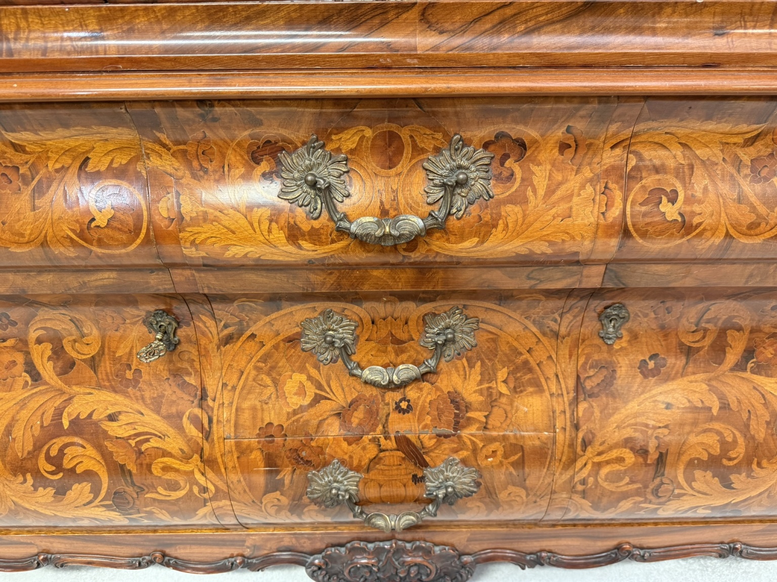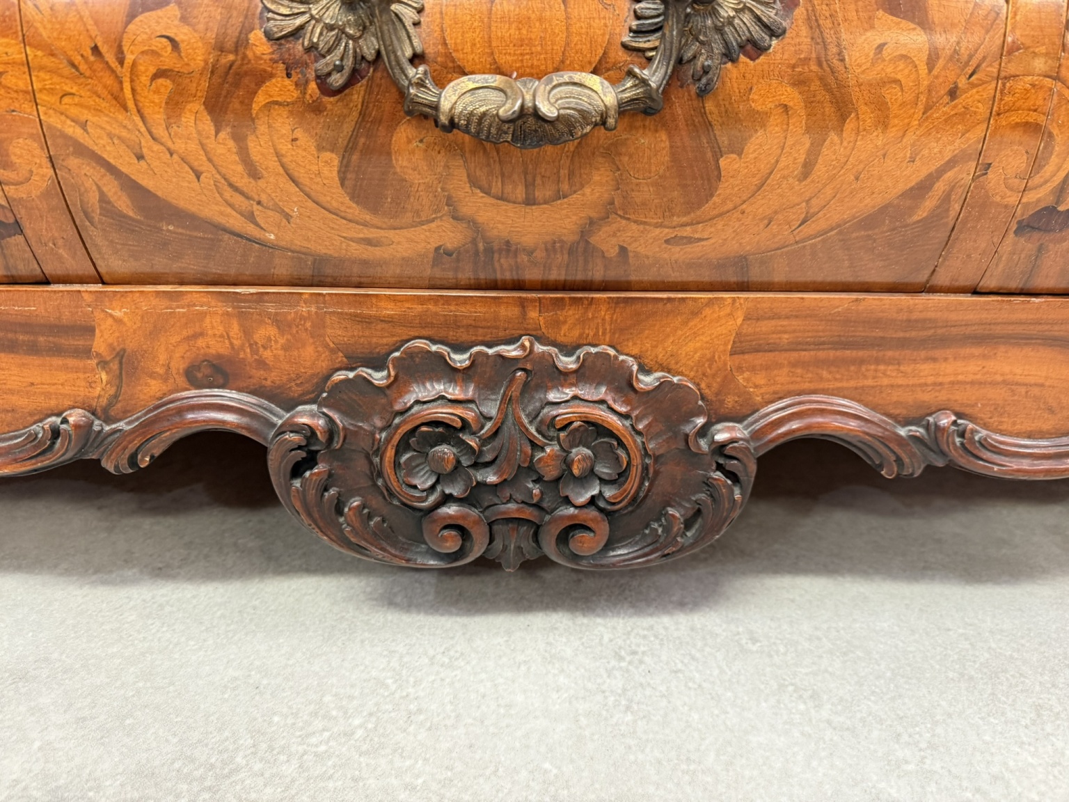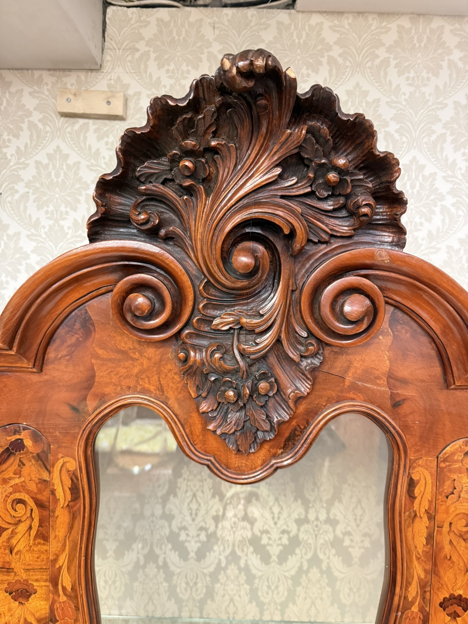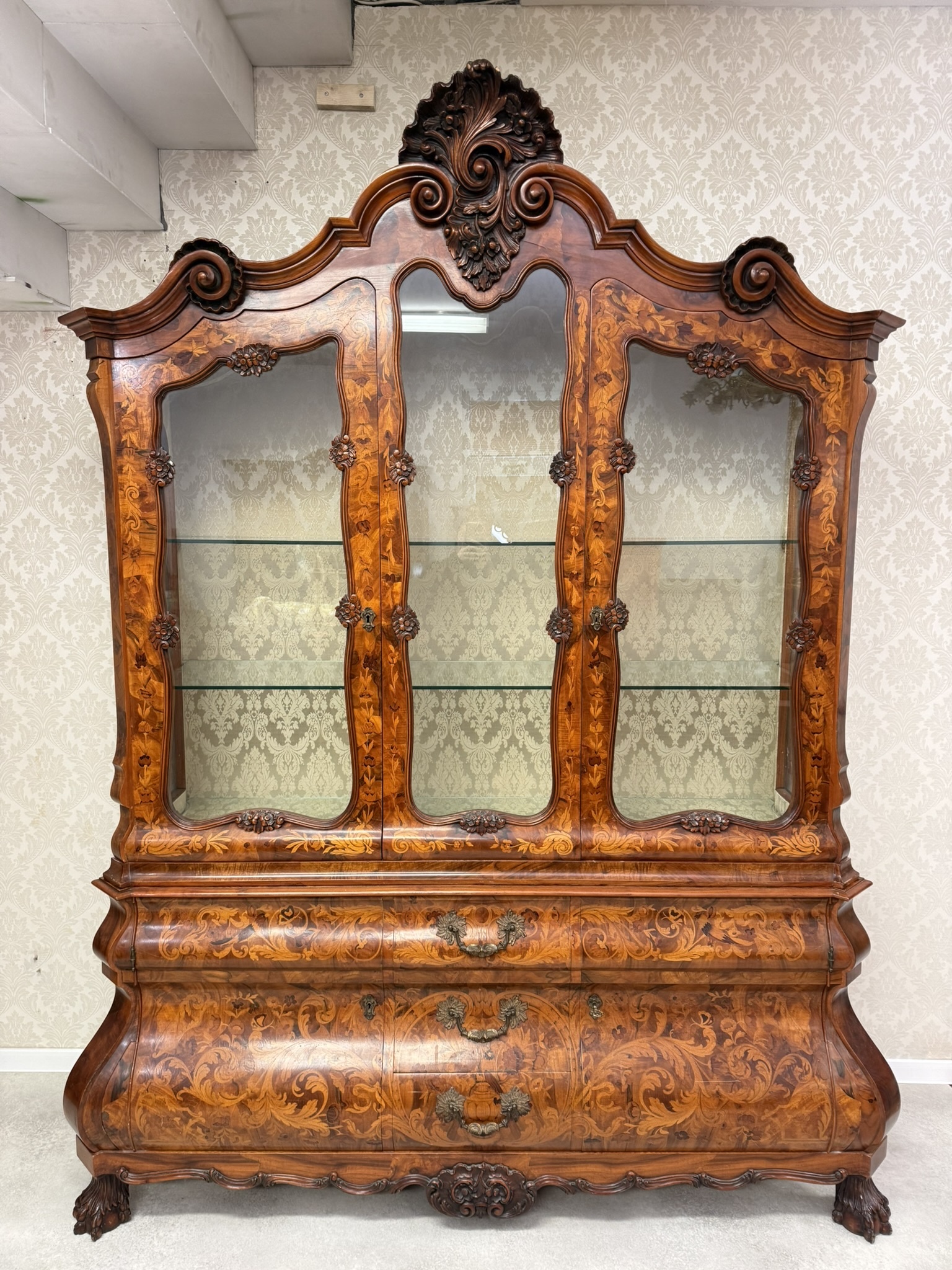 Vitrína s intarzií a výraznou řezbou. Horní část je tvořena prosklenou vitrínou s tvarovanými rámy a skleněnými policemi, spodní část zásuvky s profilovanými čely. Nábytek je zdoben rostlinnými a květinovými intarziemi, doplněnými řezbou kartuší, volut a ornamentů.54 670 Kč