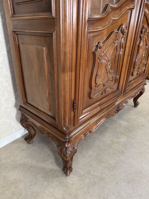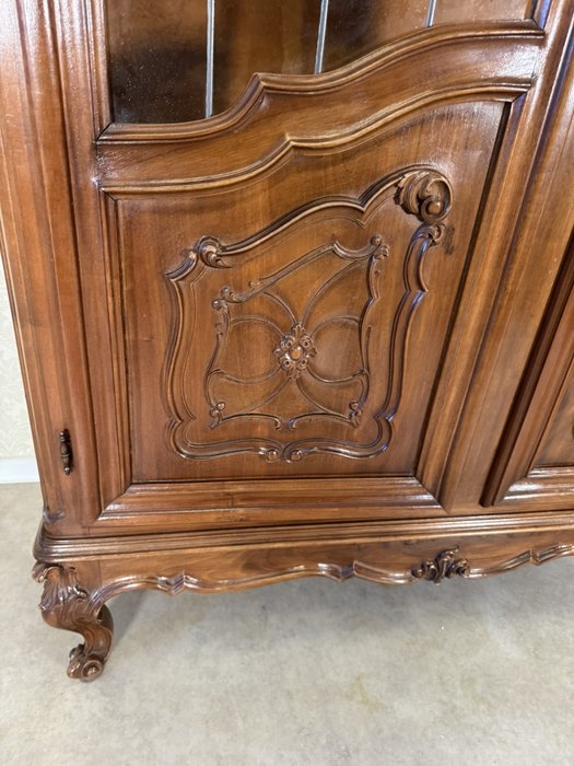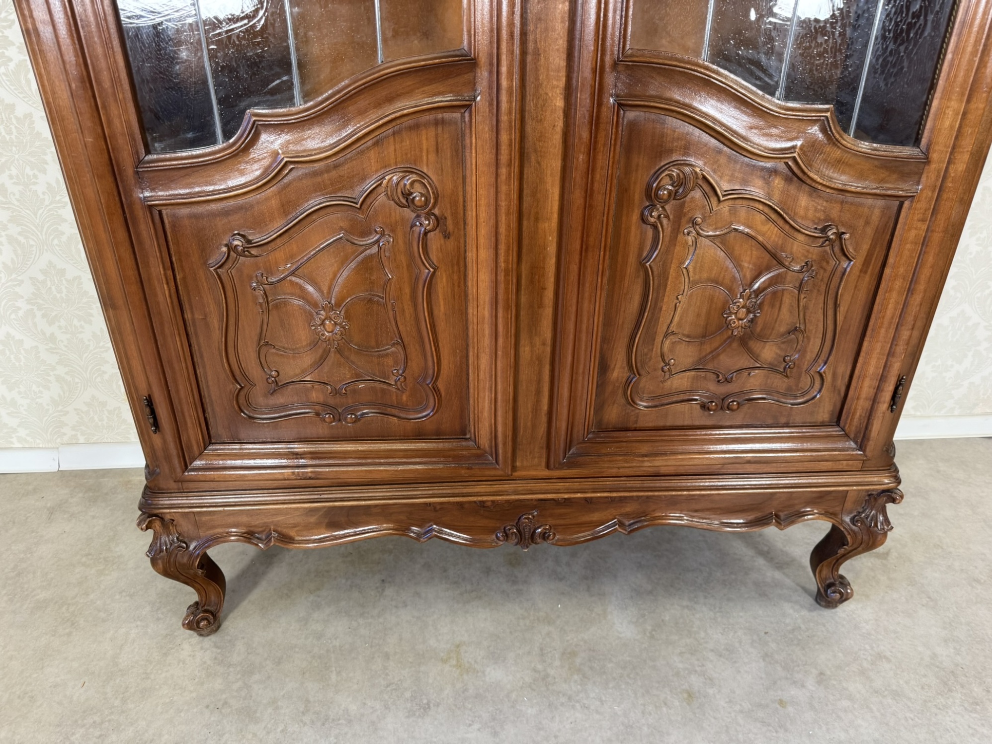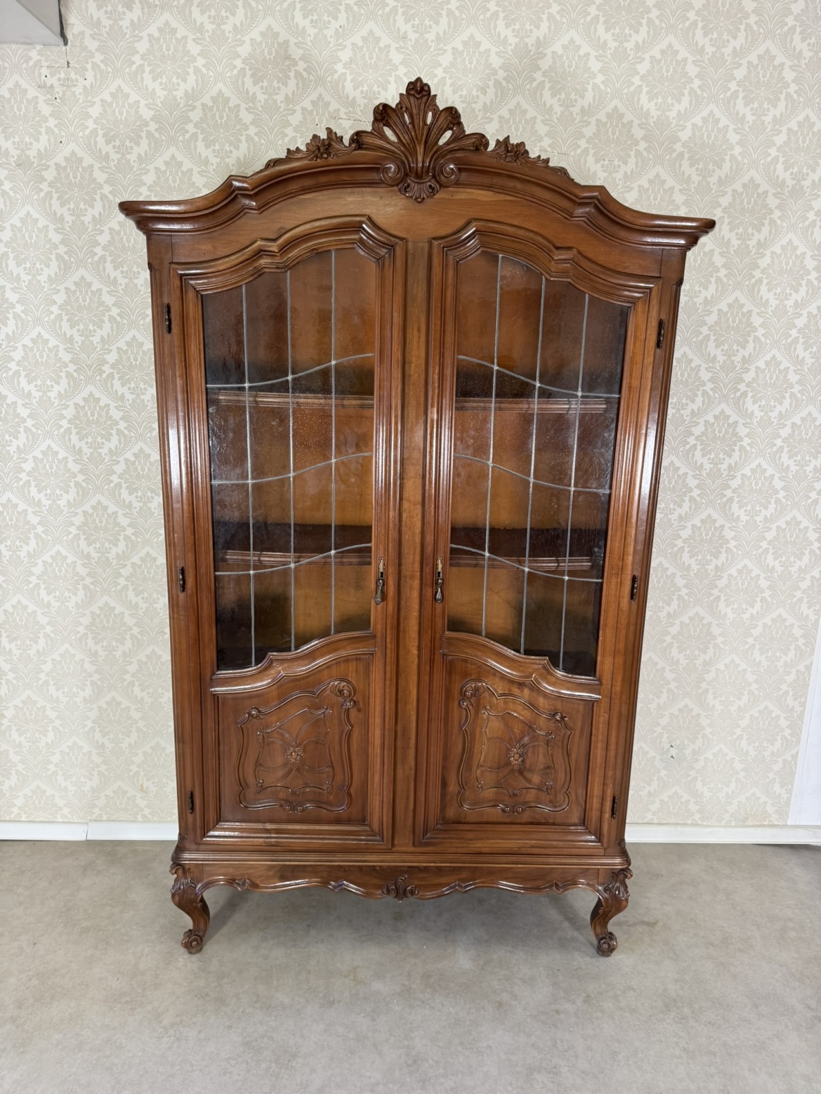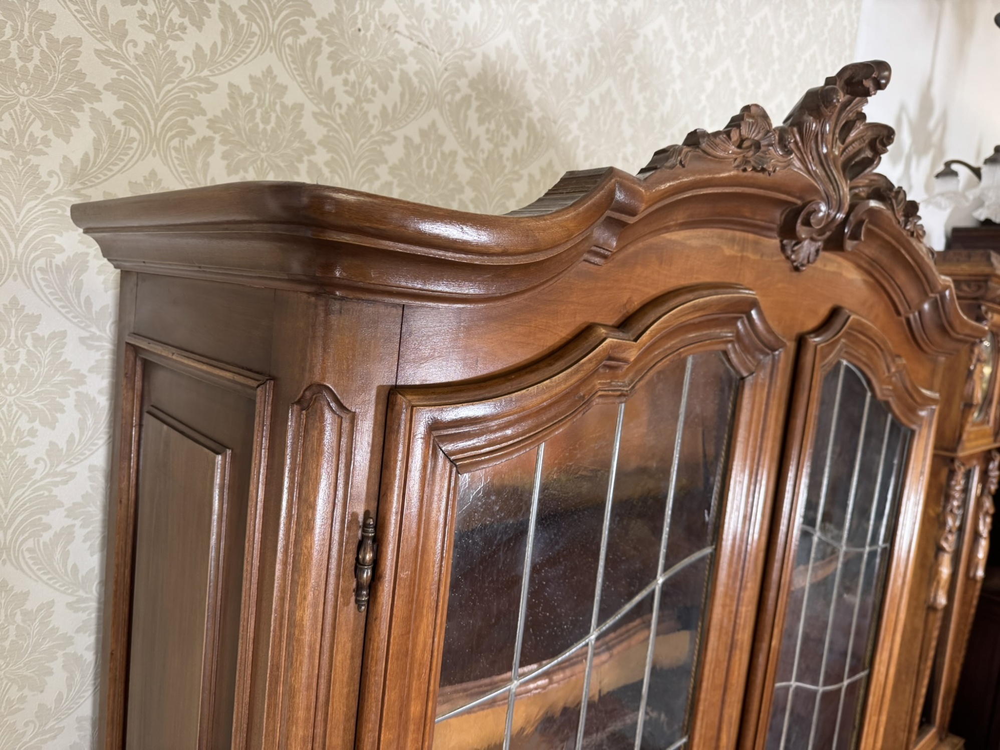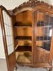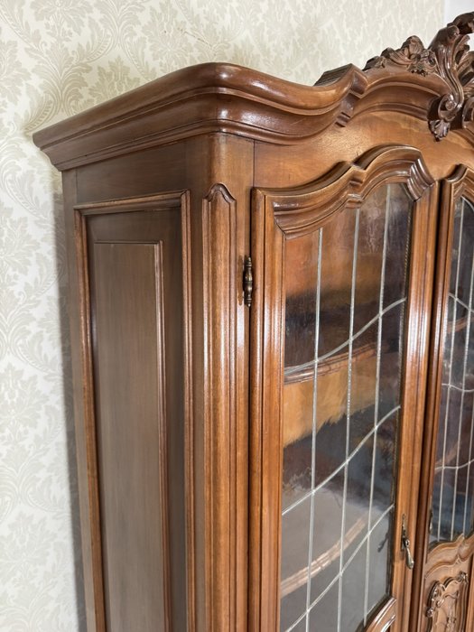 Reprezentativní vitrína s bohatě profilovanou římsou a zdobením v horní části. Dvojitá prosklená dvířka s dělenými skly odhalují tři prostorné police, vhodné pro vystavení porcelánu či dekorací. Spodní panely dvířek zdobí jemné řezbované ornamenty a celá vitrína stojí na elegantně tvarovaných nohách s decentním květinovým motivem.22 650 Kč