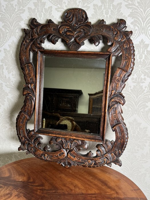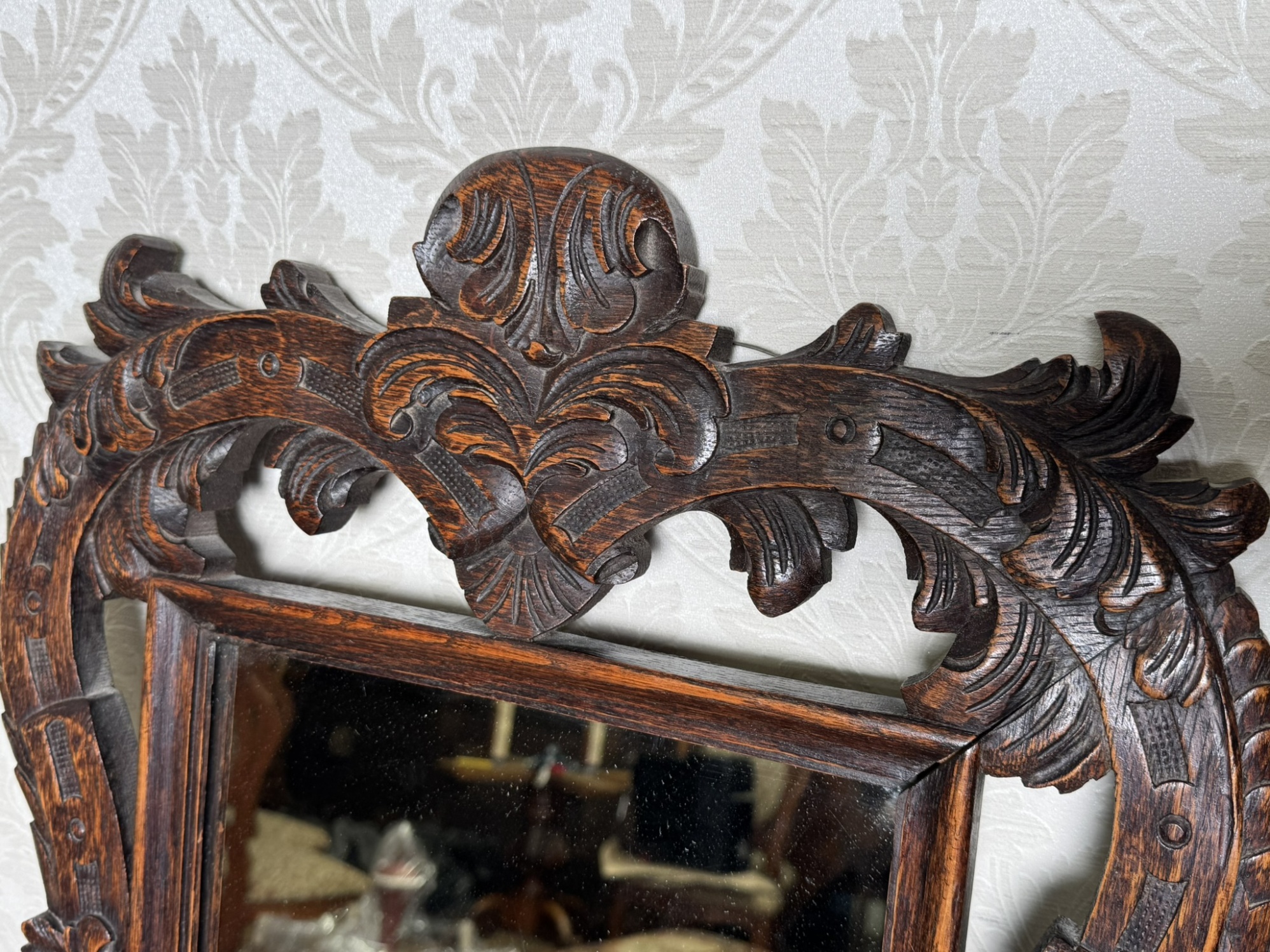 Zrcadlo v dřevěném rámu, zdobené hlubokou řezbou s motivy akantových listů a volut. Detailní práce vyniká plastickým zpracováním a symetrií, která podtrhuje reprezentativní charakter tohoto doplňku. Zrcadlo je vhodné k zavěšení na stěnu,3 150 Kč