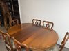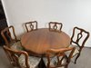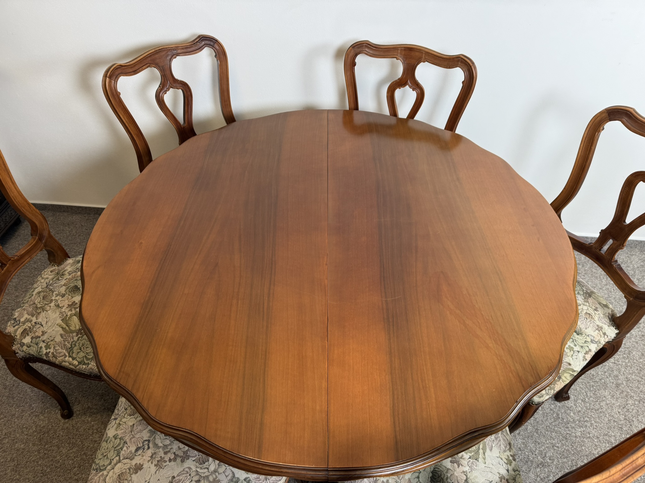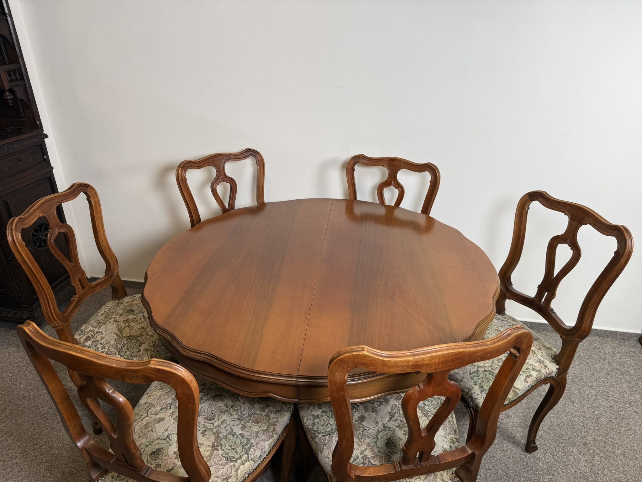 Rozkládací jídelní stůl na centrální noze se šesti čalouněnými židlemi - va199