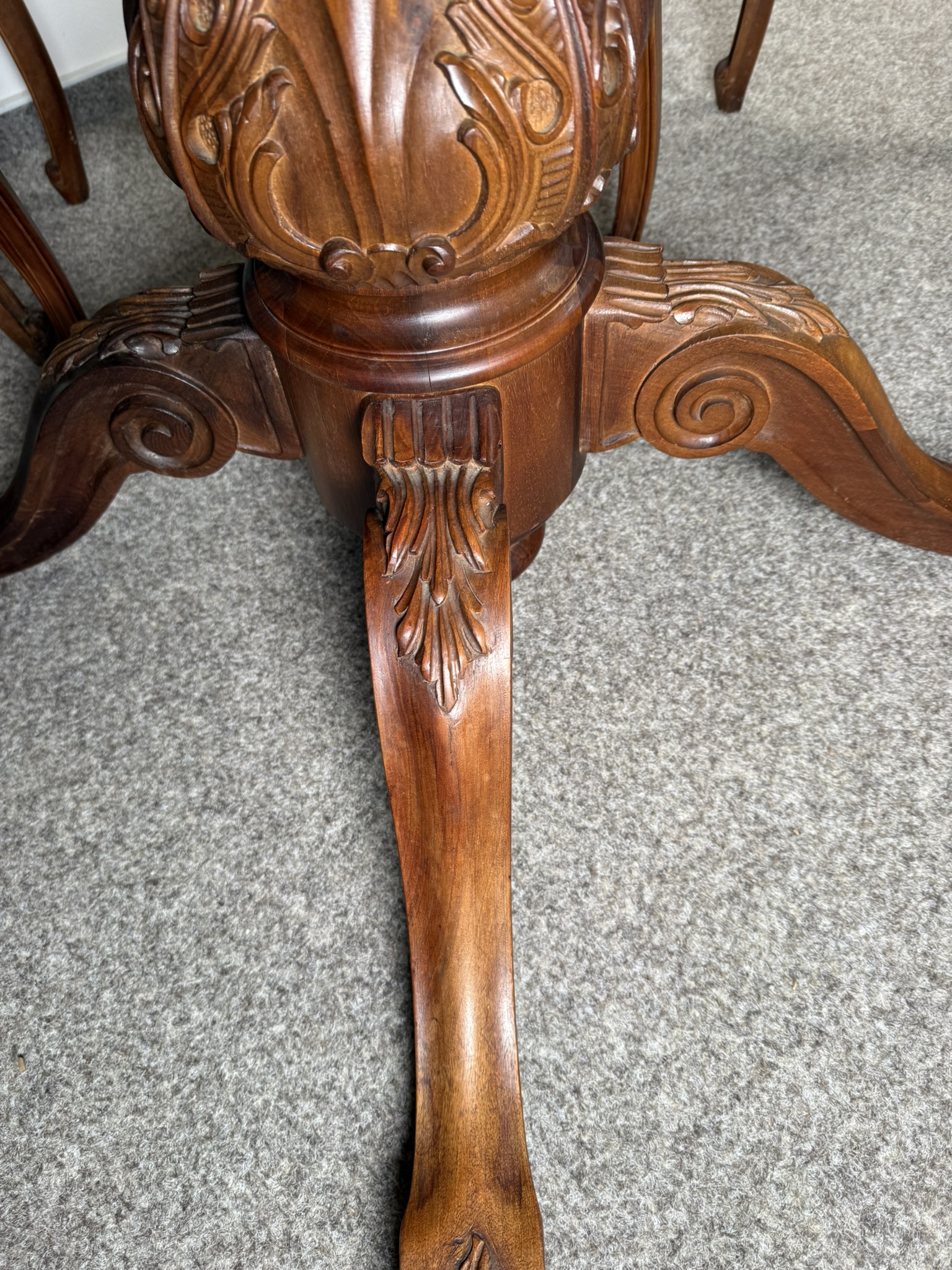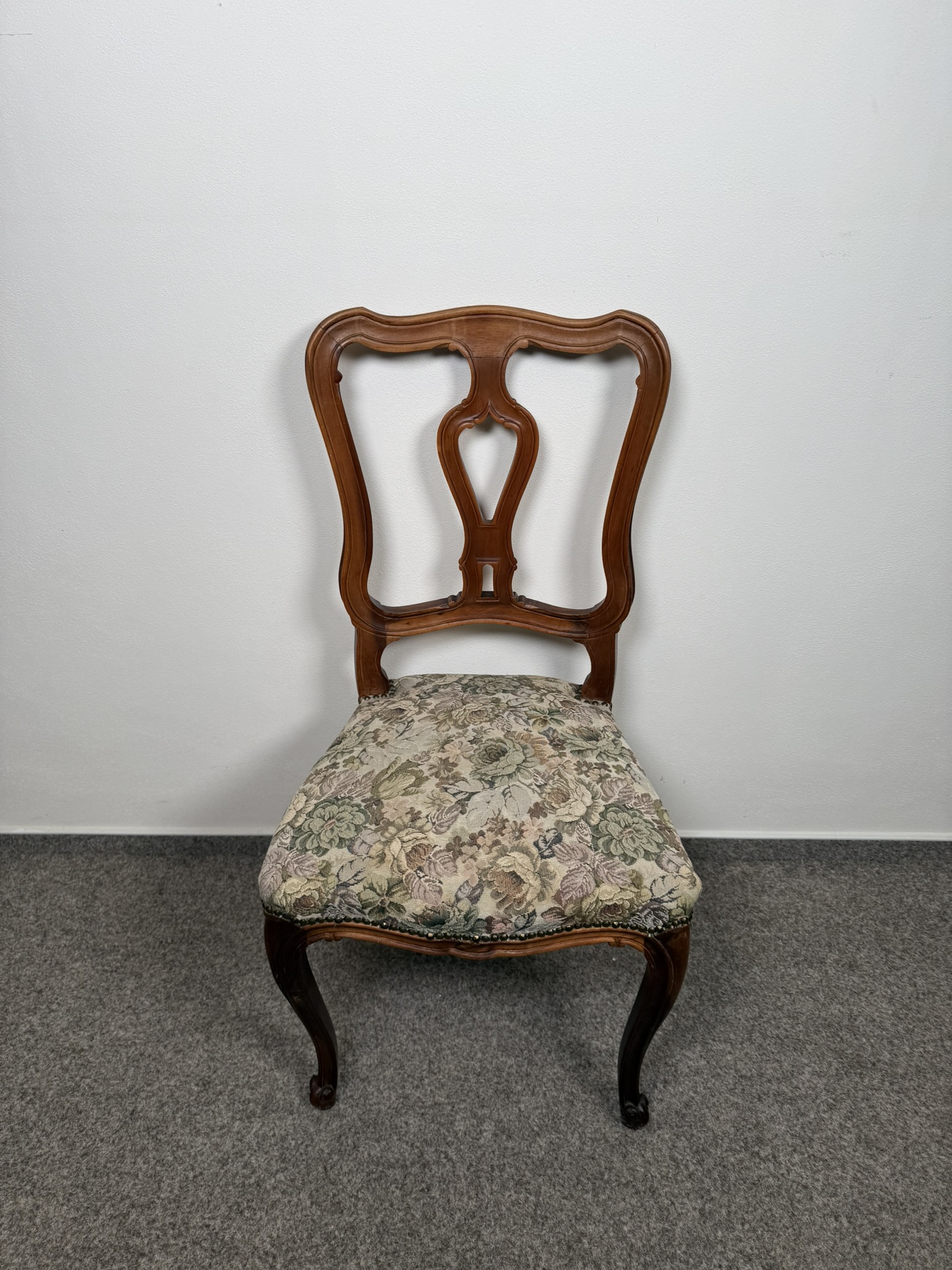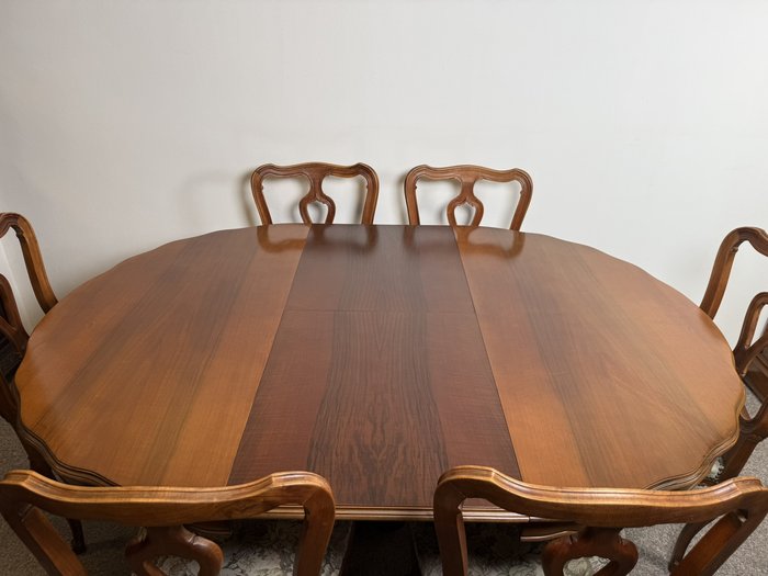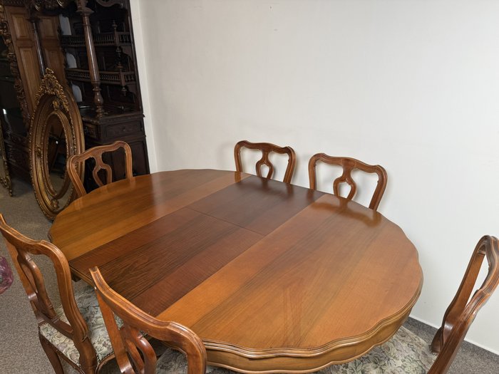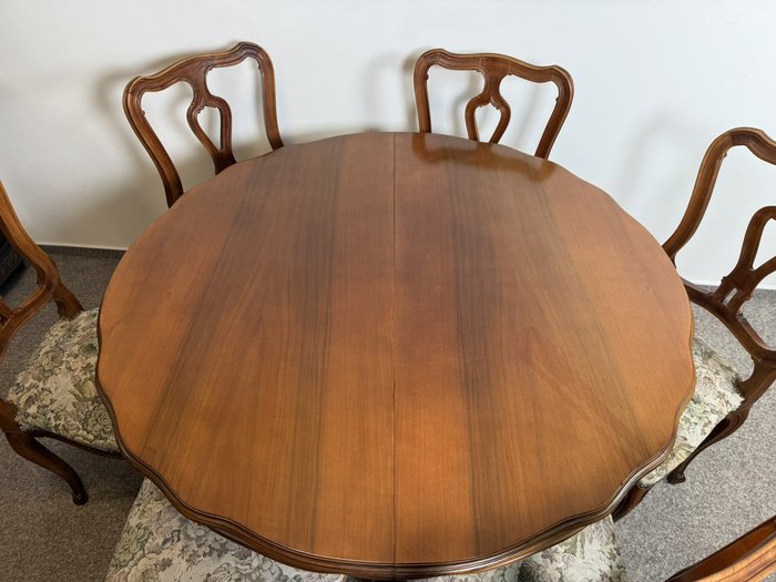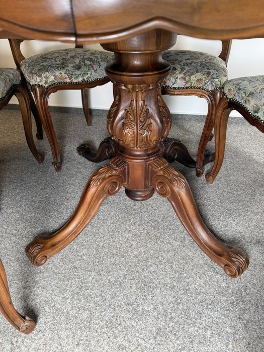 Jídelní sestava je tvořená rozkládacím stolem a šesti židlemi s čalouněnými sedáky v květovaném potahu. Stůl stojí na centrální řezbované noze s čtyřramenným podnožím, zakončeným volutami. Deska s vloženým středovým pásem, který se uplatní při rozložení. Židle mají tvarovaná opěradla s prořezem a esovitě prohnuté nohy. Po rozložení stůl měří 167 cm.