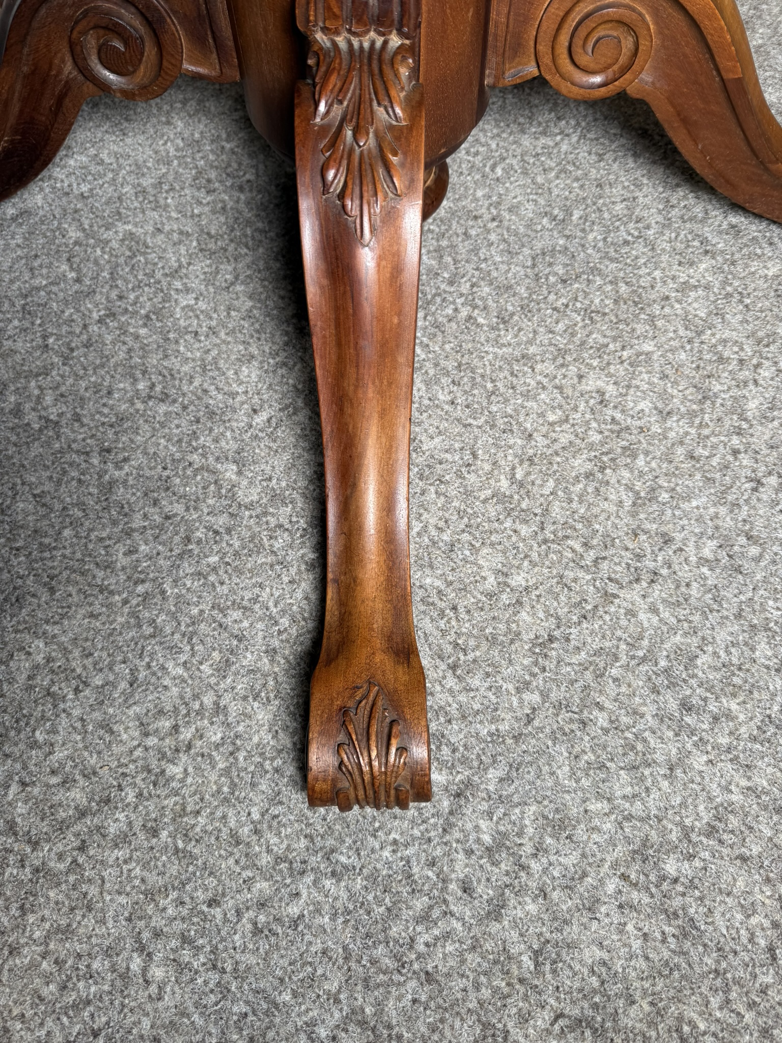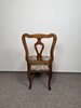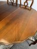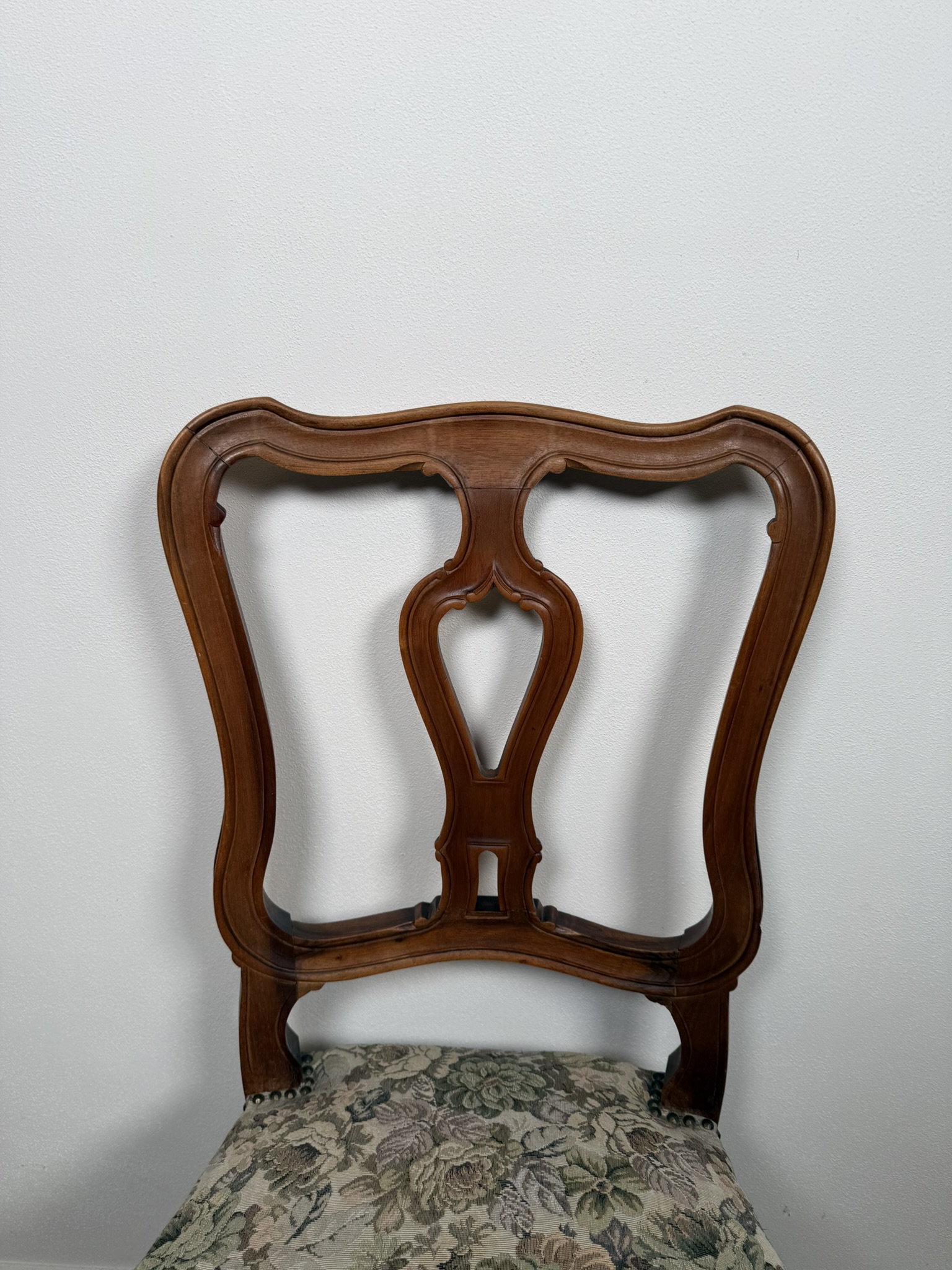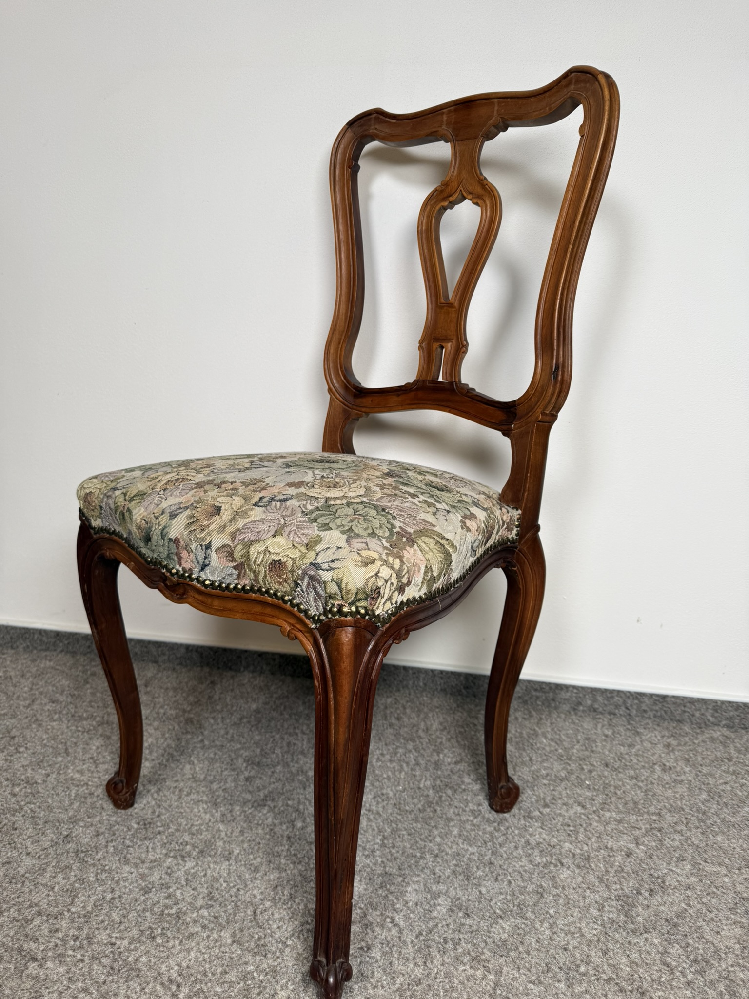 Jídelní sestava je tvořená rozkládacím stolem a šesti židlemi s čalouněnými sedáky v květovaném potahu. Stůl stojí na centrální řezbované noze s čtyřramenným podnožím, zakončeným volutami. Deska s vloženým středovým pásem, který se uplatní při rozložení. Židle mají tvarovaná opěradla s prořezem a esovitě prohnuté nohy. Po rozložení stůl měří 167 cm.