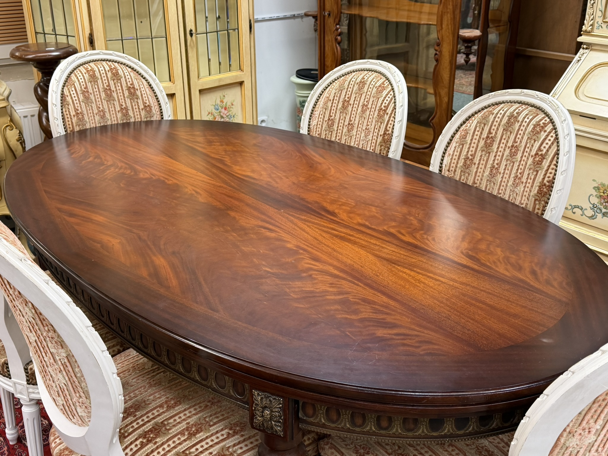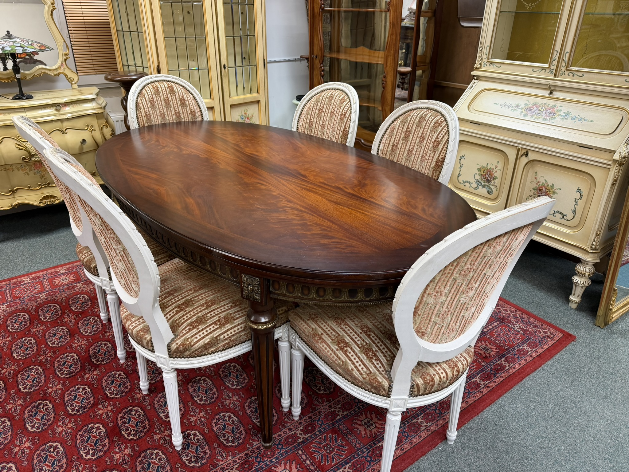 Jídelní sestava, tvořená elegantním oválným stolem s výraznou kresbou dřeva v teplém červenohnědém odstínu a šesti židlemi s vyřezávanými rámy, zdobenými zlacením. Židle mají čalounění v jemném modrozeleném odstínu, které kontrastuje s bílou a zlatou patinou rámů. Stůl není rozkládací.Jídelní souprava s oválným stolem a šesti židlemi