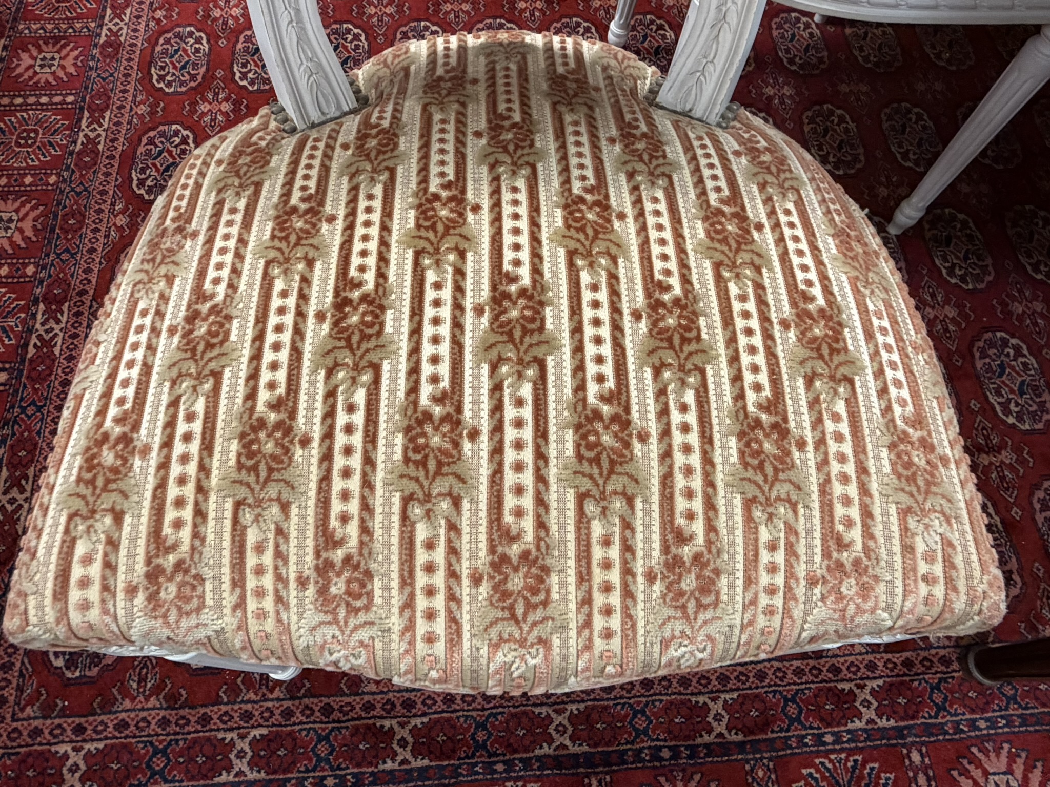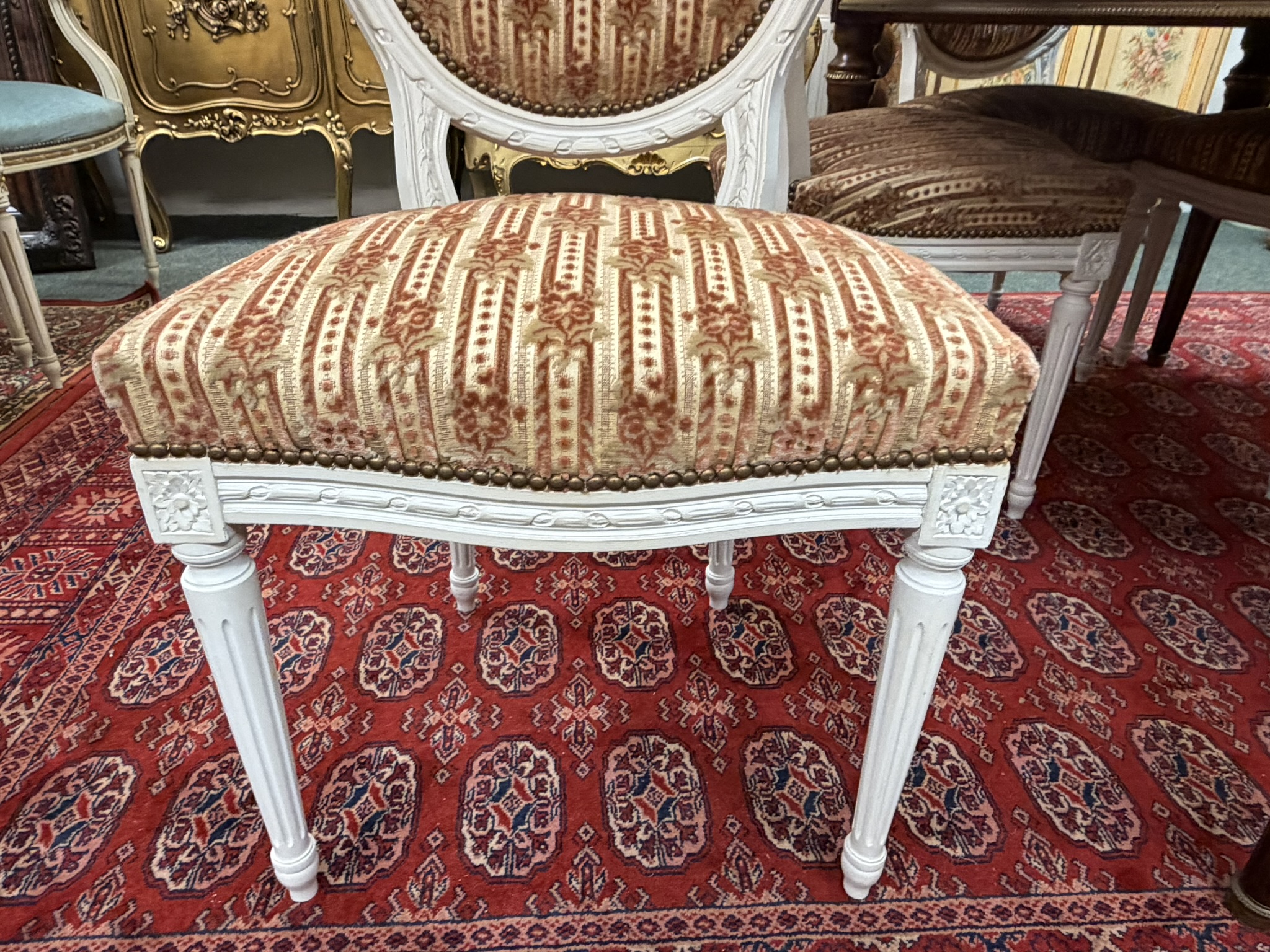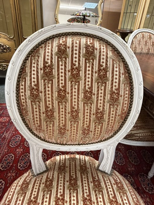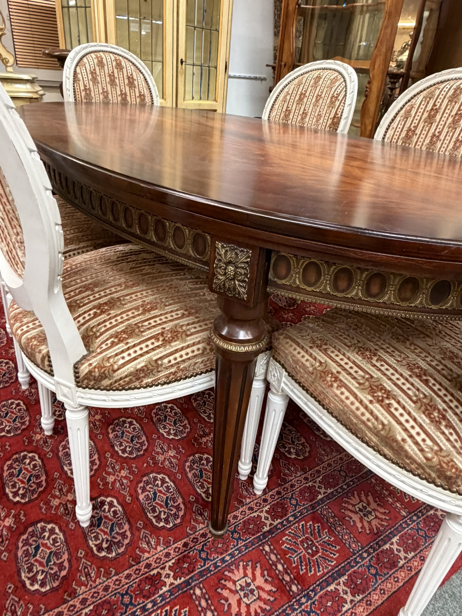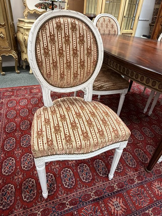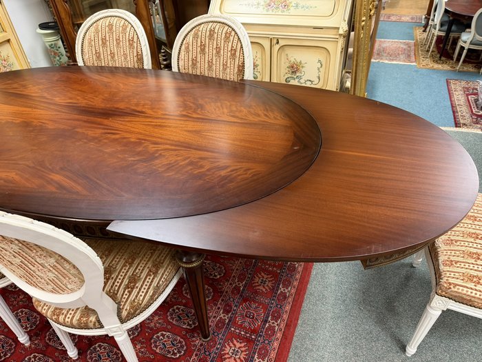 Reprezentativní jídelní set složený z oválného rozkládacího stolu s květinovou intarzií uprostřed desky. Nohy stolu jsou zdobeny dekorativními kovovými aplikacemi v bronzovém tónu s motivem rokajů. Souprava zahrnuje šest židlí s červeným čalouněním a dřevěným rámem, jejichž opěradla korunují dekorační prvky ve shodném provedení. Jídelní set působí slavnostně a výrazně.Jídelní rozkládací stůl se židlemi