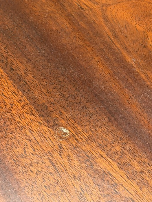 Elegantní jídelní sestava sestávající z oválného rozkládacího stolu a čalouněných židlí . Stůl s kvalitní dýhovanou deskou s výraznou kresbou a integrovaným rozkládacím mechanismem se středovou deskou, která se objeví při rozevření stolu. Profilované nohy s jemnou dekorací. Na desce stolu je drobné poškození, odpovídající stáří a běžnému užívání, které nemá vliv na funkčnost ani stabilitu.