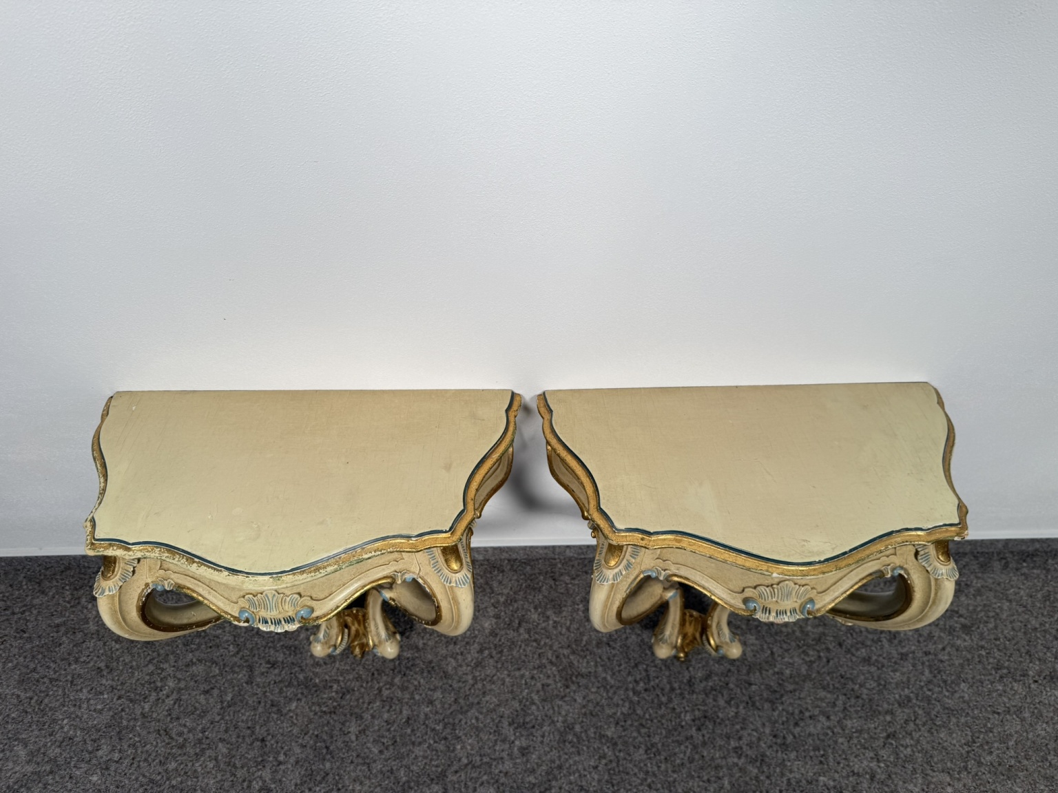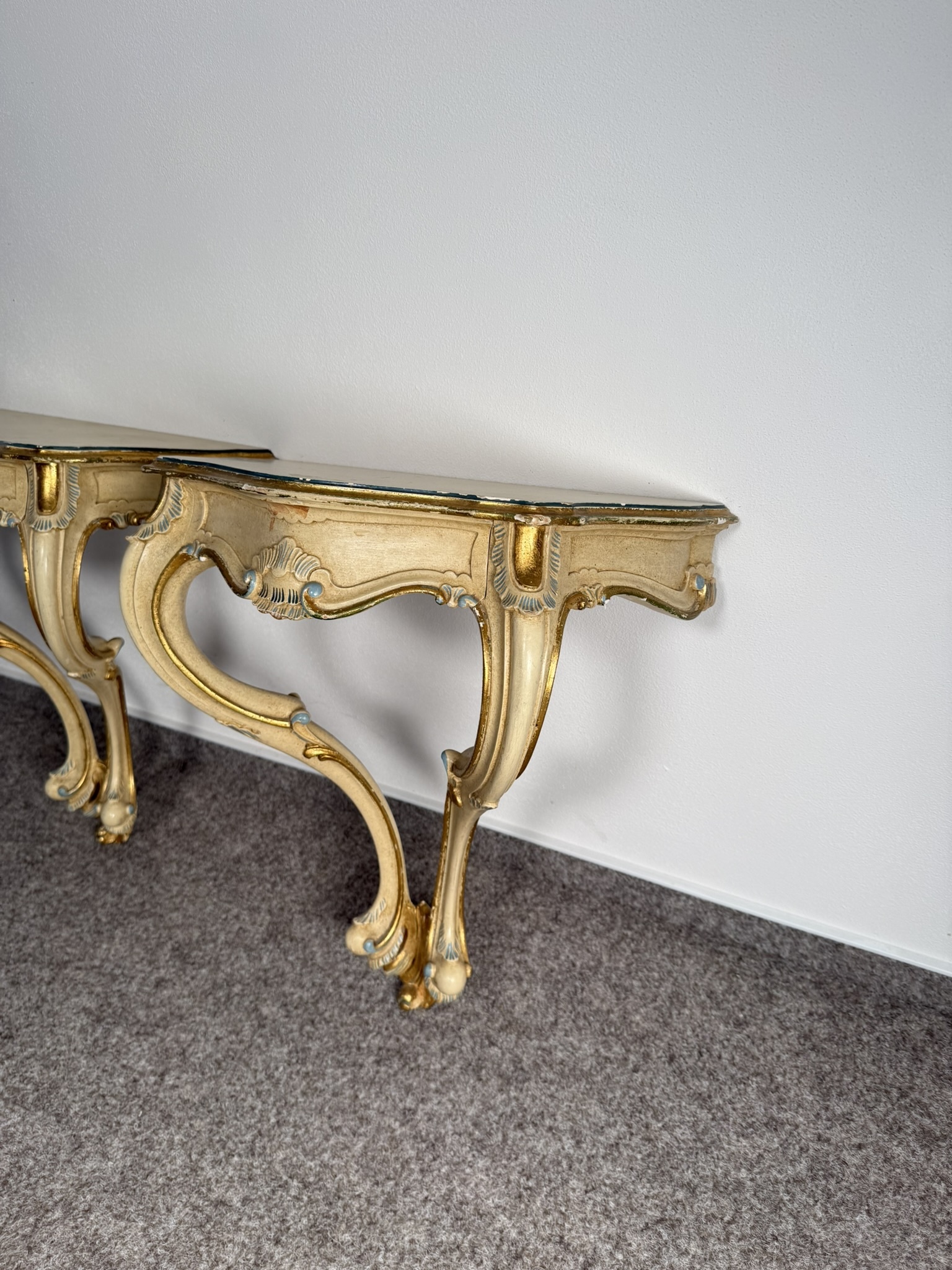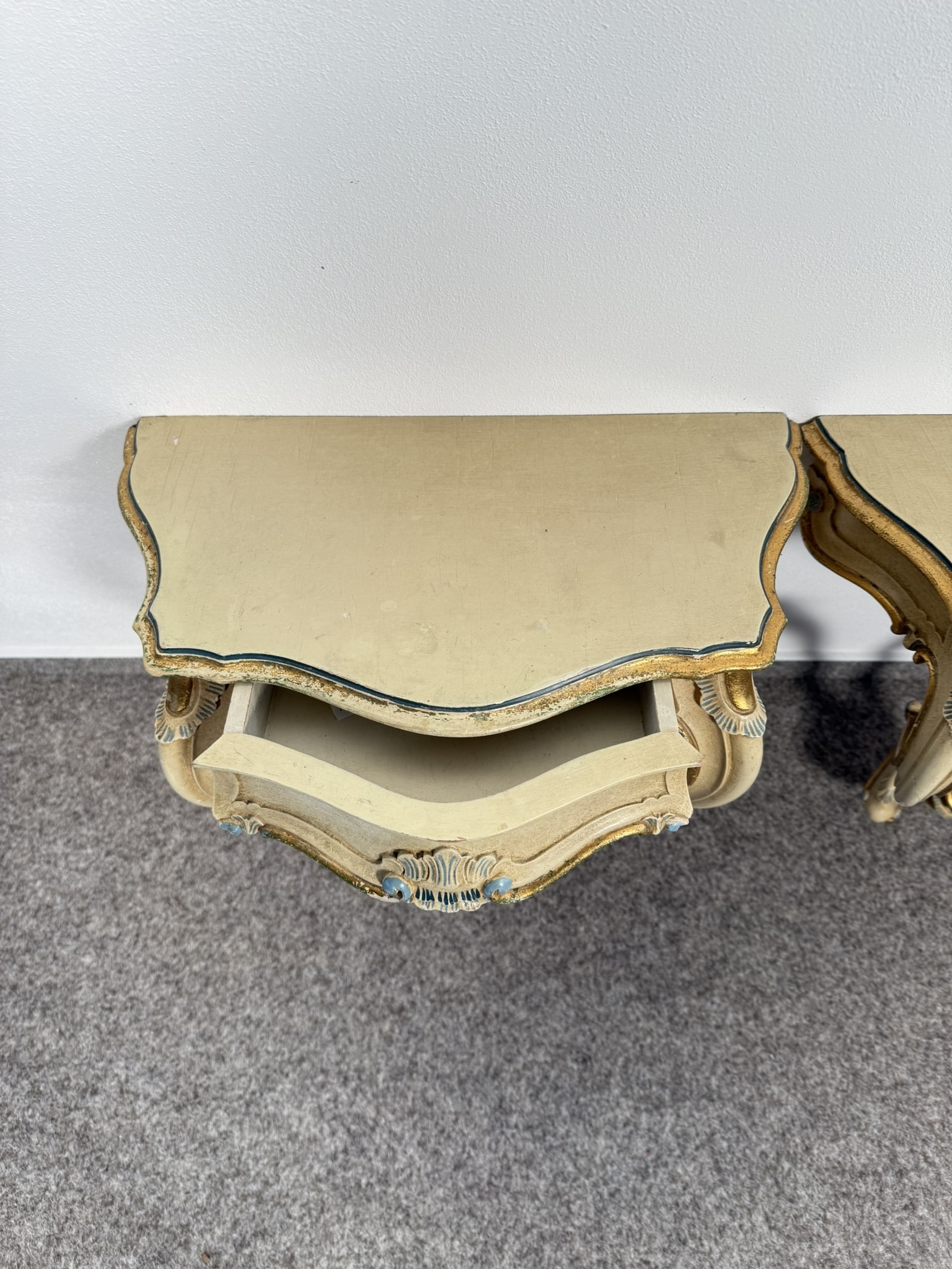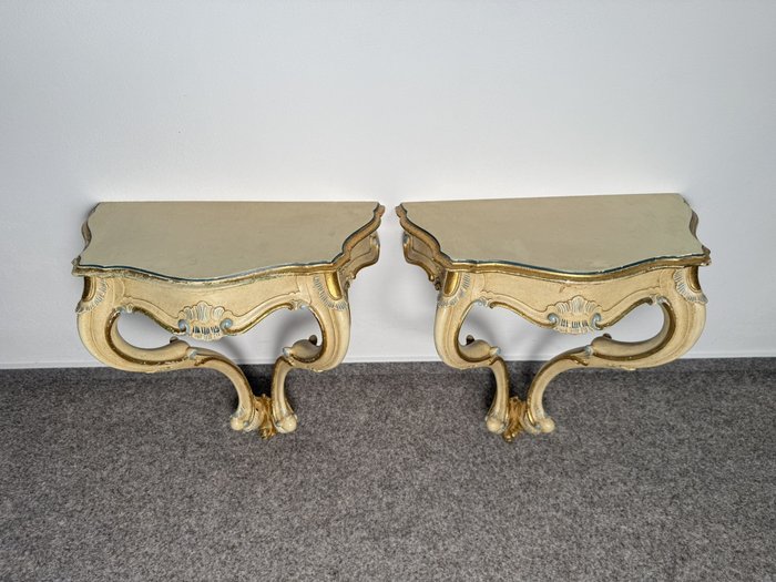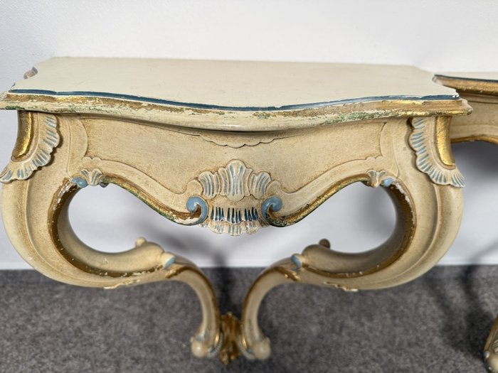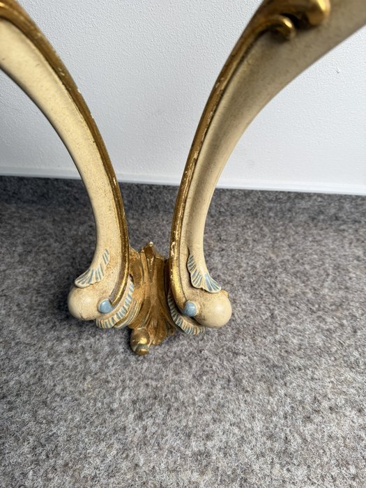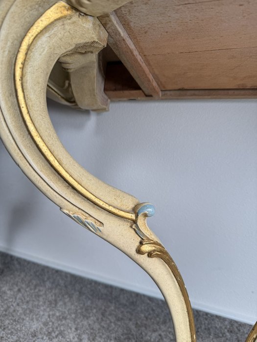 Konzolový stolek s profilovanou konstrukcí a zásuvkou, s malbou v tónech slonové kosti, doplněnou o barevné prvky v odstínu zlata a světle modré. Nohy jsou prohnuté, čelní strana i boční části zdobeny motivy mušlí a volut.3 780 Kč