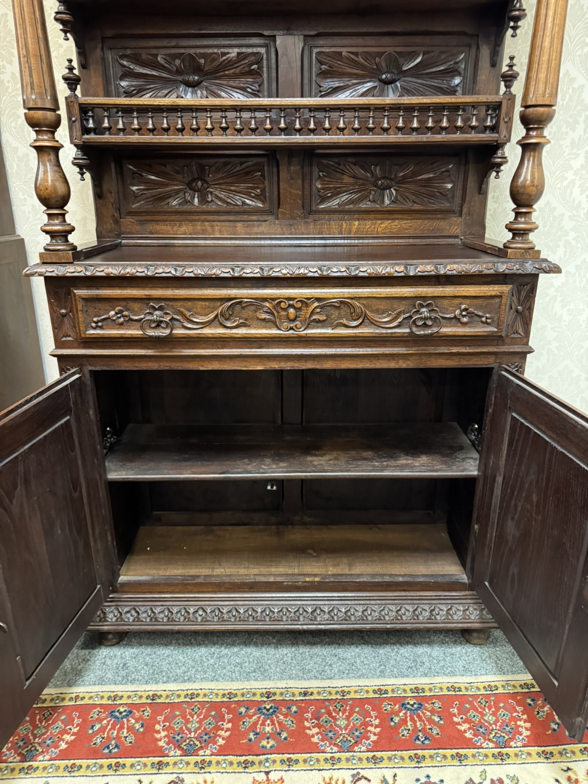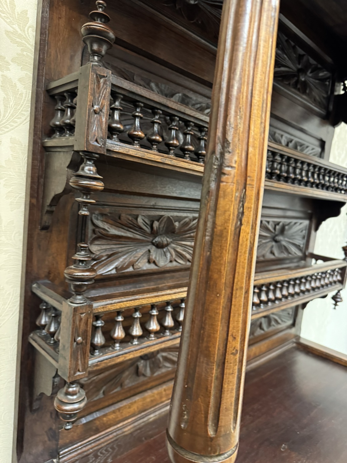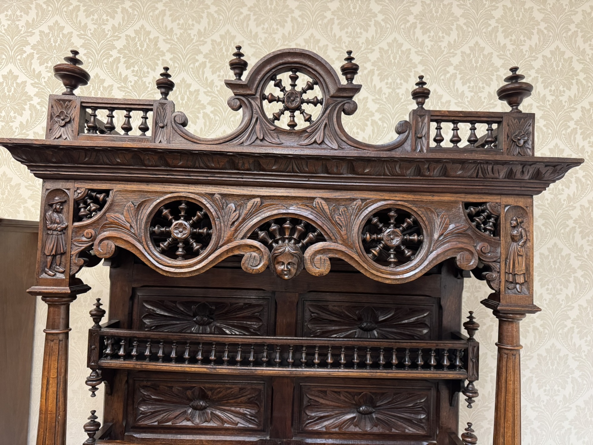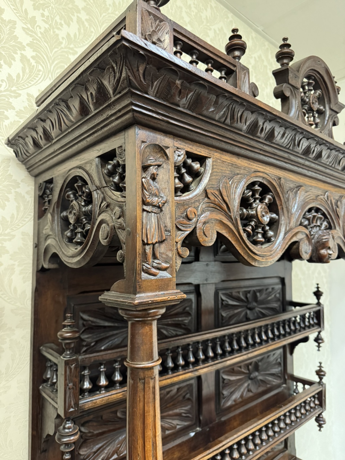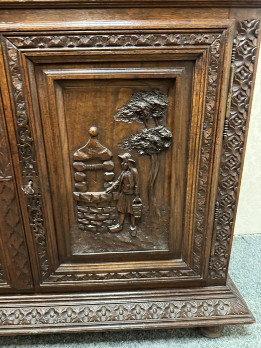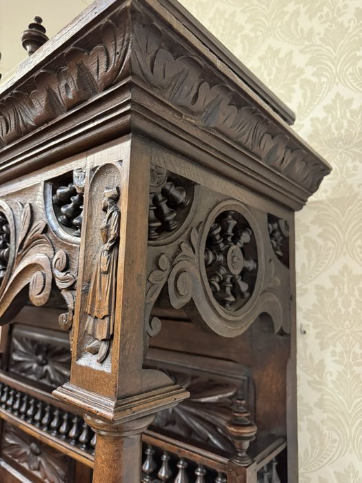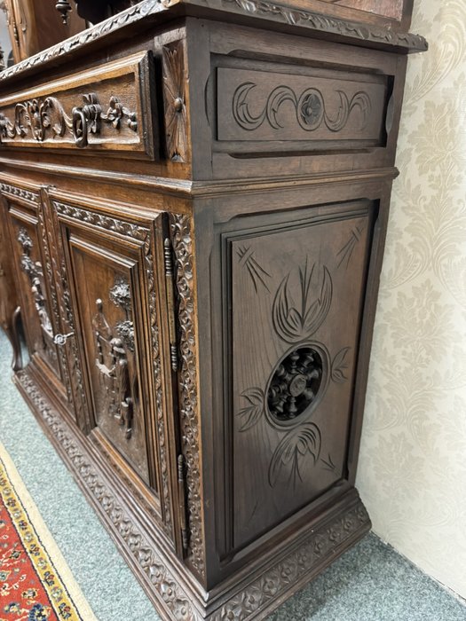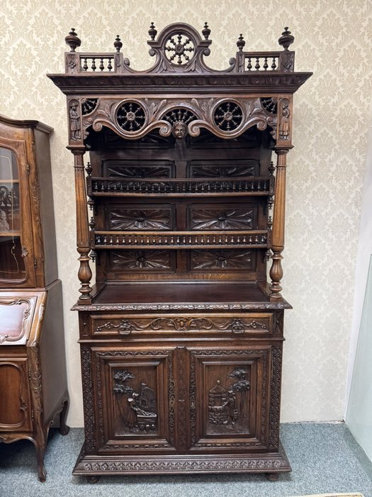 Velká dvoudílná příborníková skříň bretaňského původu. Nástavec s otevřenými policemi je dekorován galerií, turnýry, rozvilinami a maskarony. Ve spodní části dvířek se nachází reliéfní výjevy s motivy orientálních (čínských) krajin, pavilonů a postav. Boční pilastry jsou ukončeny řezanými ženskými postavami.34 650 Kč