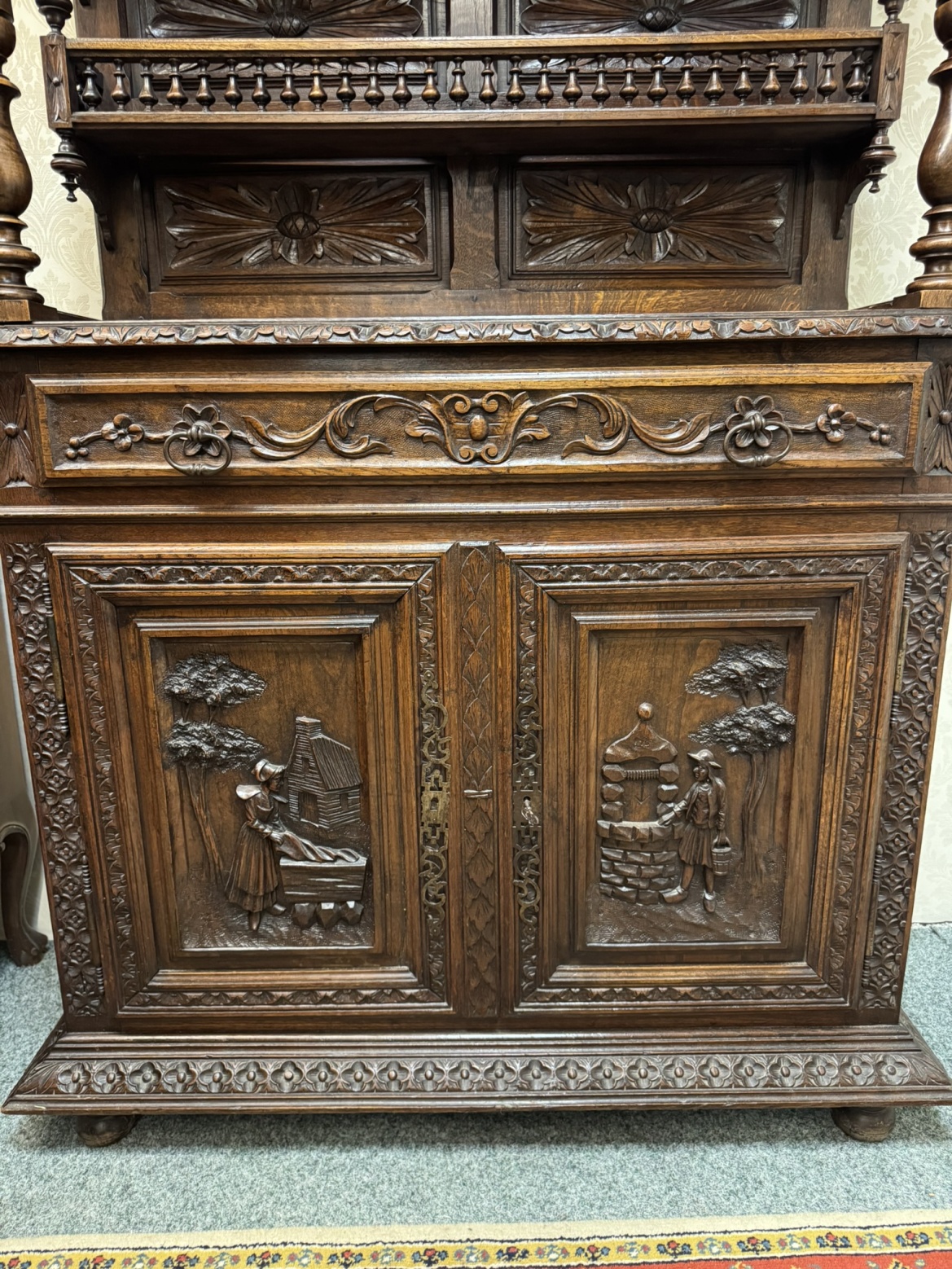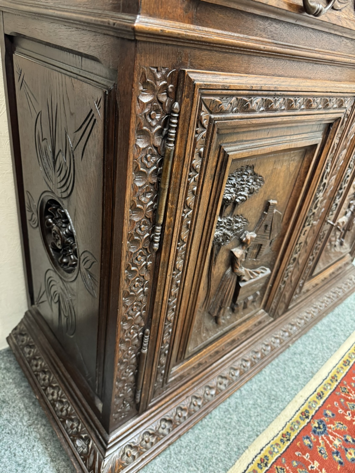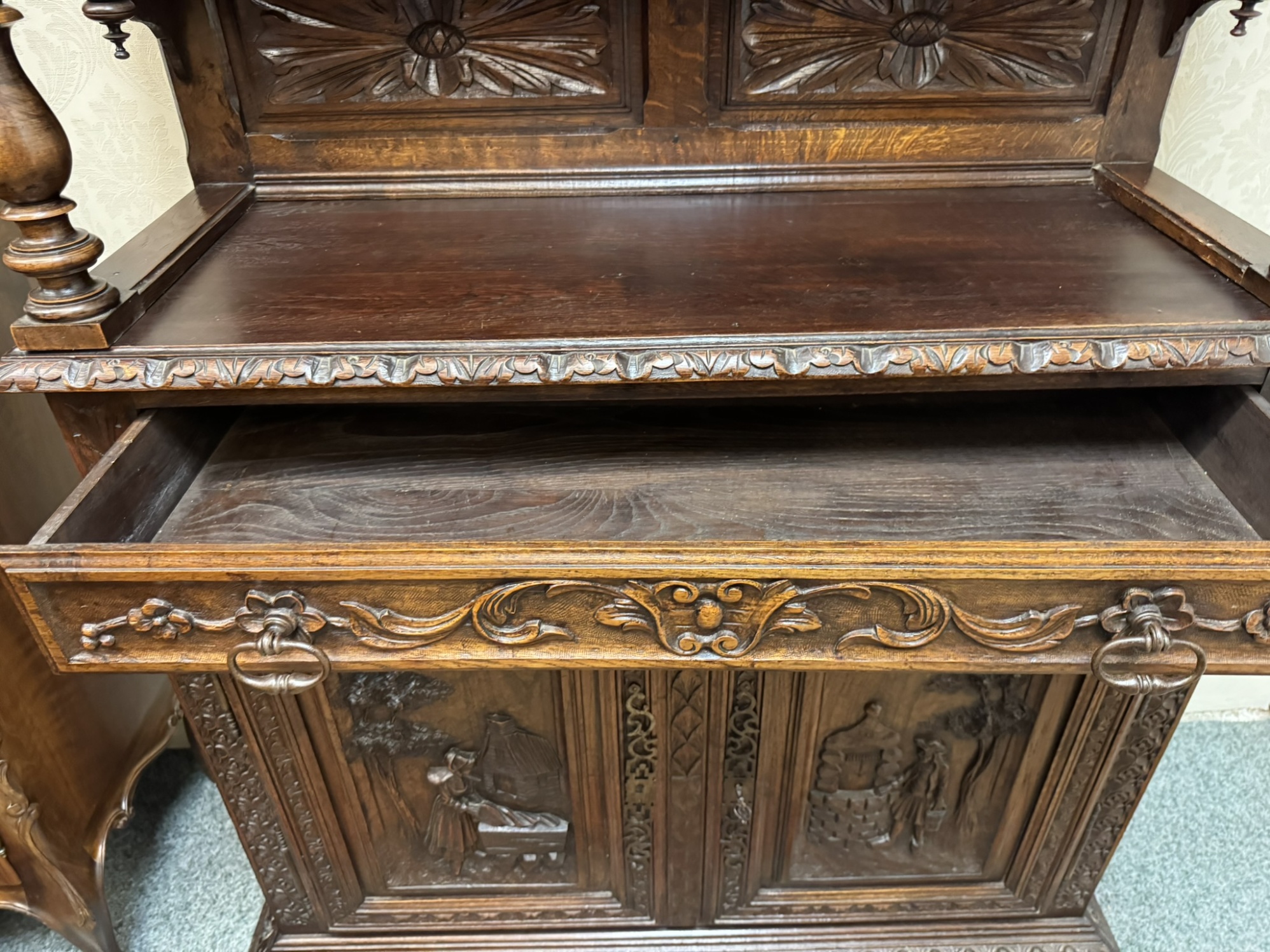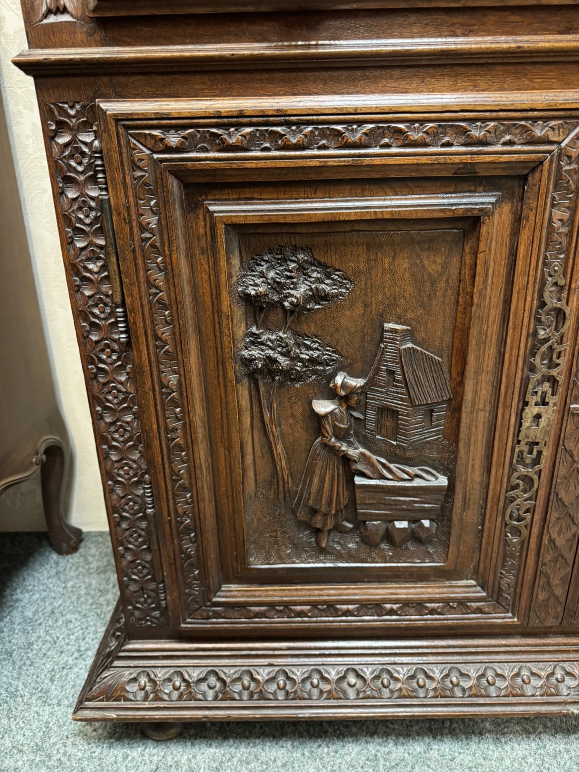 Ručně řezaná příborníková skříň s čínskými výjevy, rok 1890 - f67