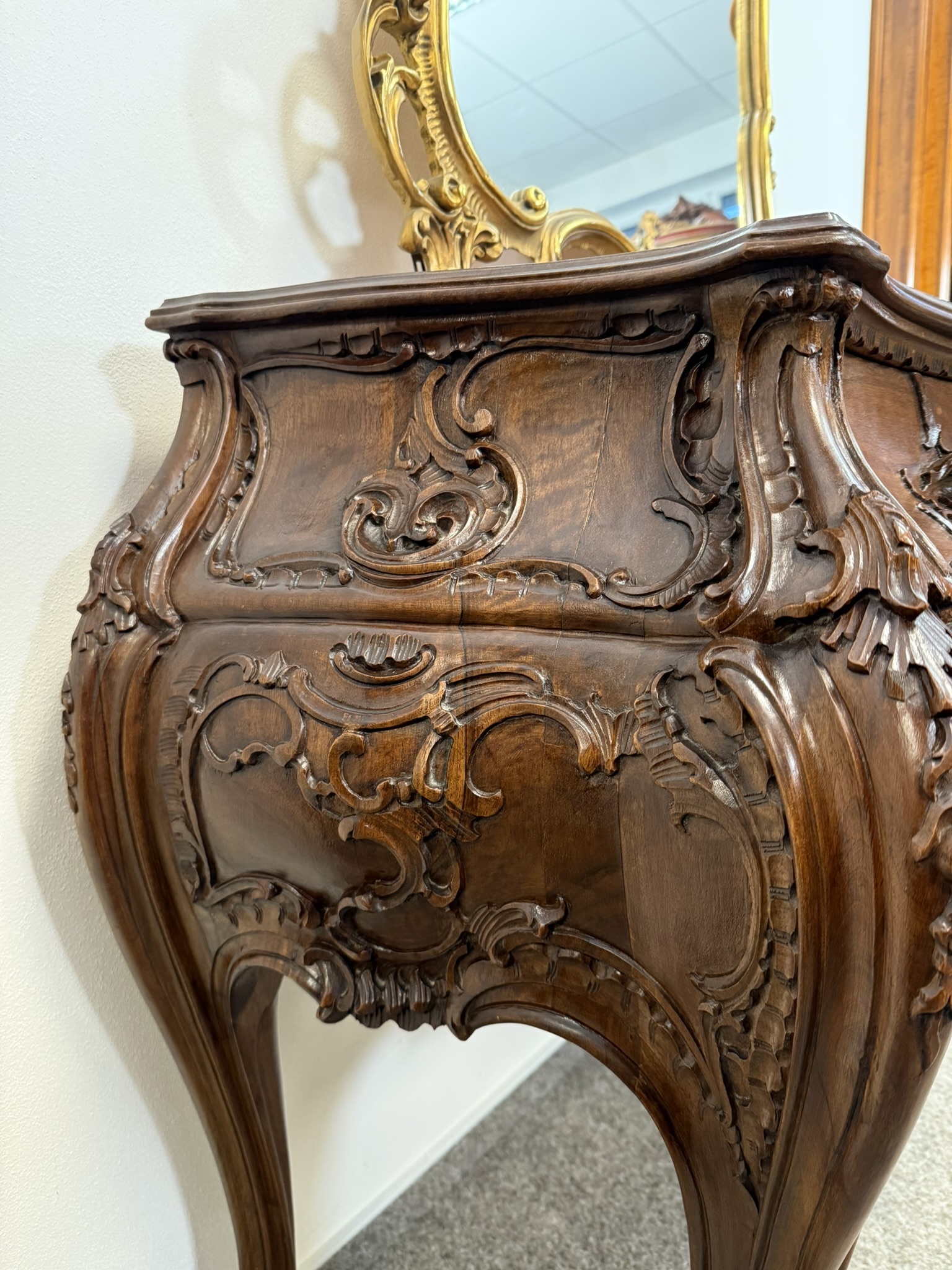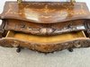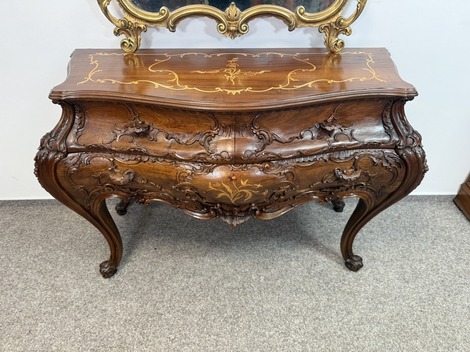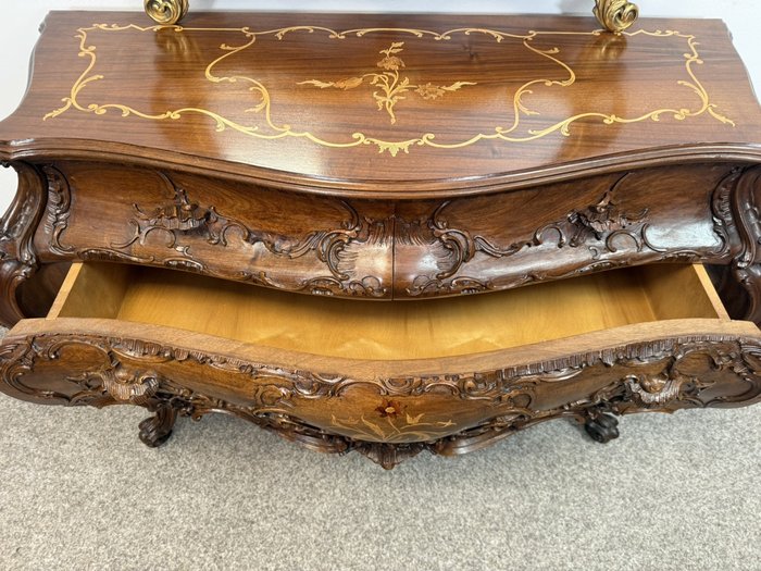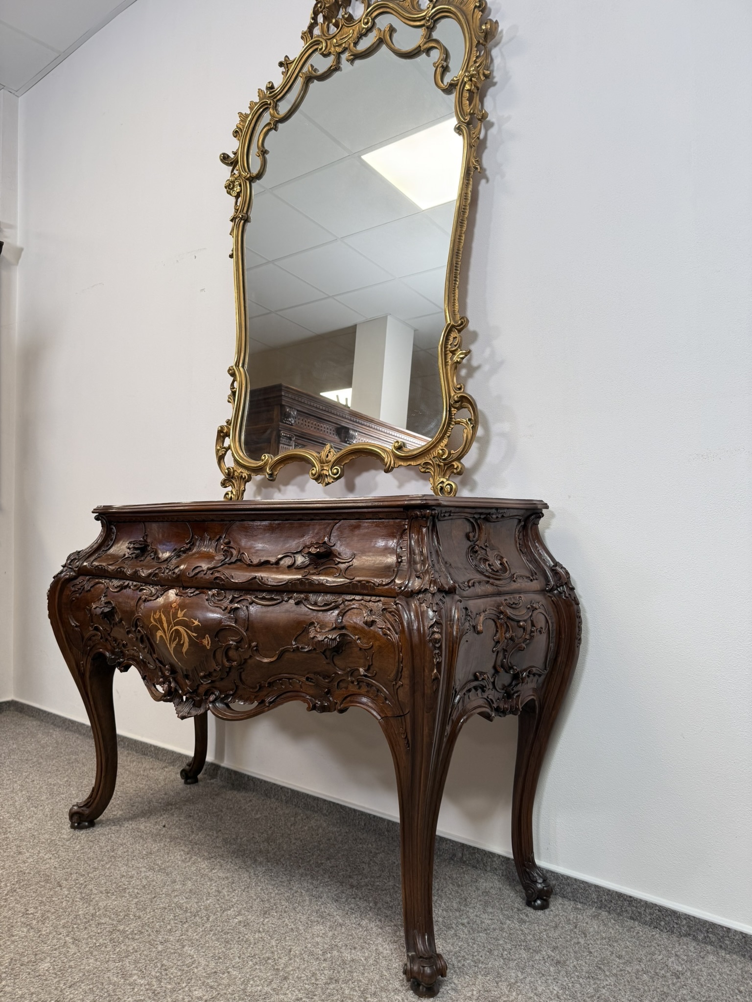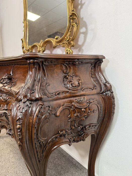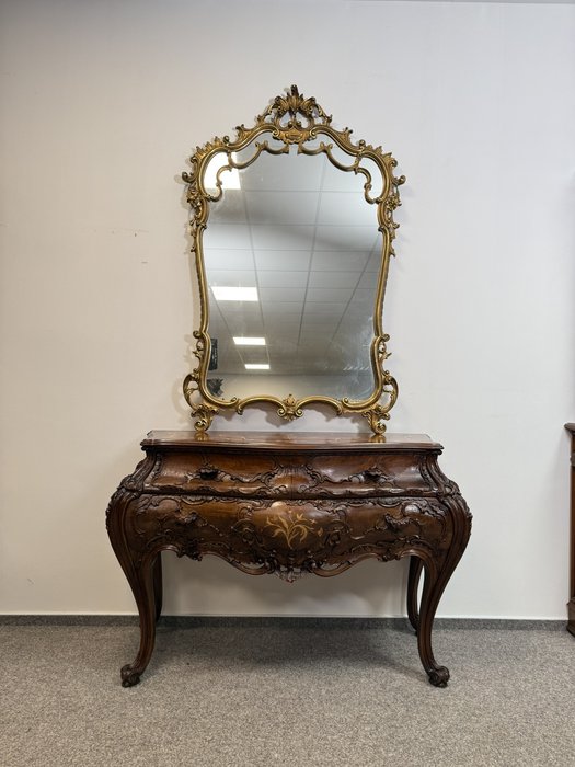 Reprezentativní toaletka s bohatě řezbovanými detaily a květinovou intarzií na čele zásuvek i horní desce. Prohnuté nohy a tvarovaná silueta podtrhují charakteristický rokokový šarm. Součástí je velké zrcadlo s dekorativní lištou a volutovými prvky. Komoda v. 87,5 cm. Zrcadlo v. 151 cm.33 550 Kč