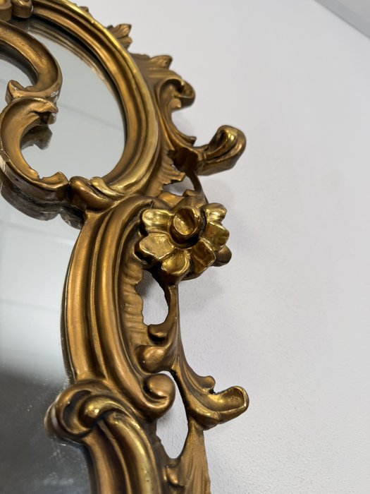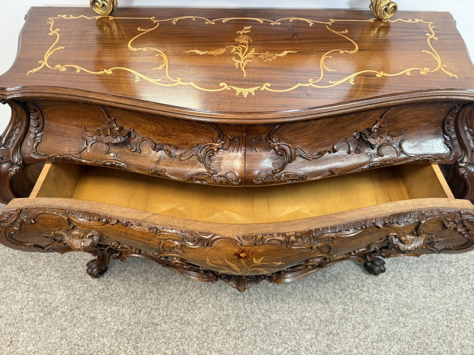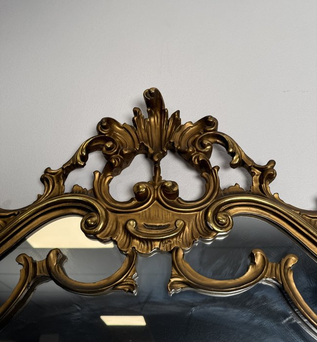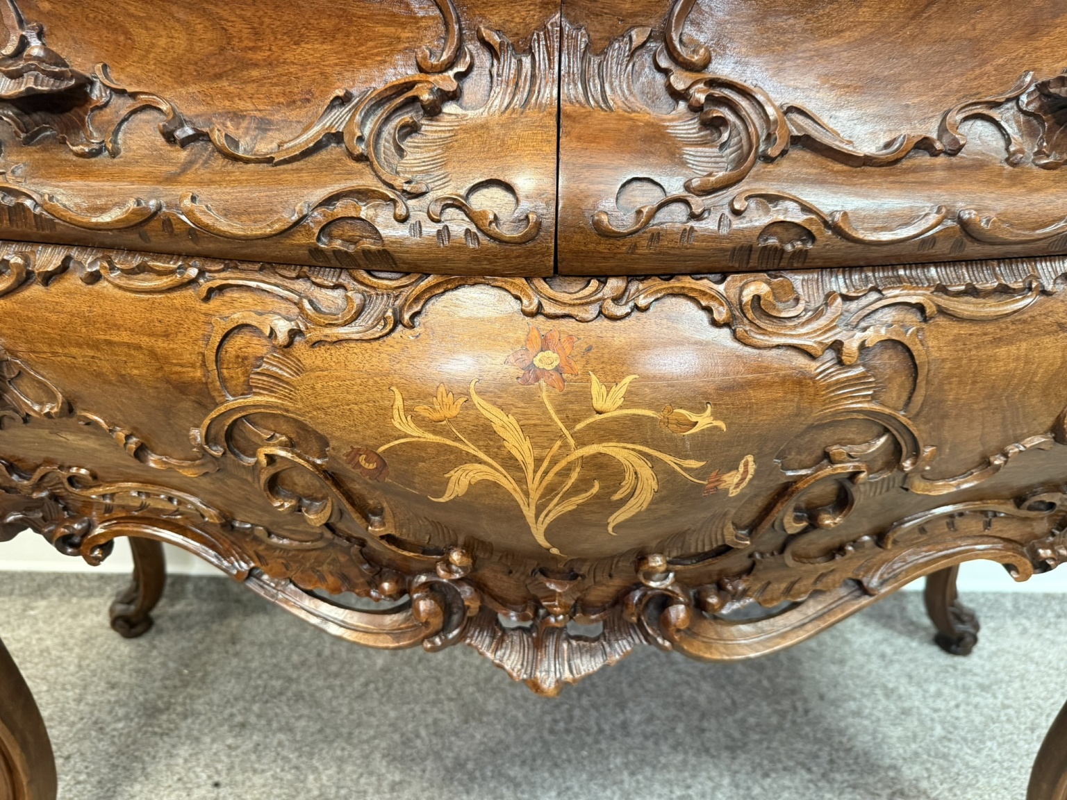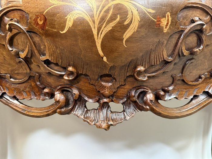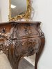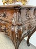 Reprezentativní toaletka s bohatě řezbovanými detaily a květinovou intarzií na čele zásuvek i horní desce. Prohnuté nohy a tvarovaná silueta podtrhují charakteristický rokokový šarm. Součástí je velké zrcadlo s dekorativní lištou a volutovými prvky. Komoda v. 87,5 cm. Zrcadlo v. 151 cm.33 550 Kč
