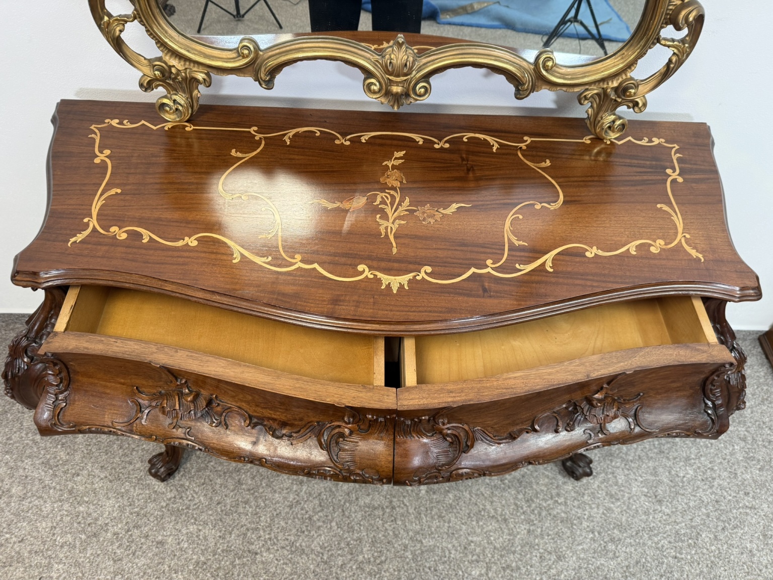 Ručně řezbovaná toaletka s intarzií a zrcadlem - va171