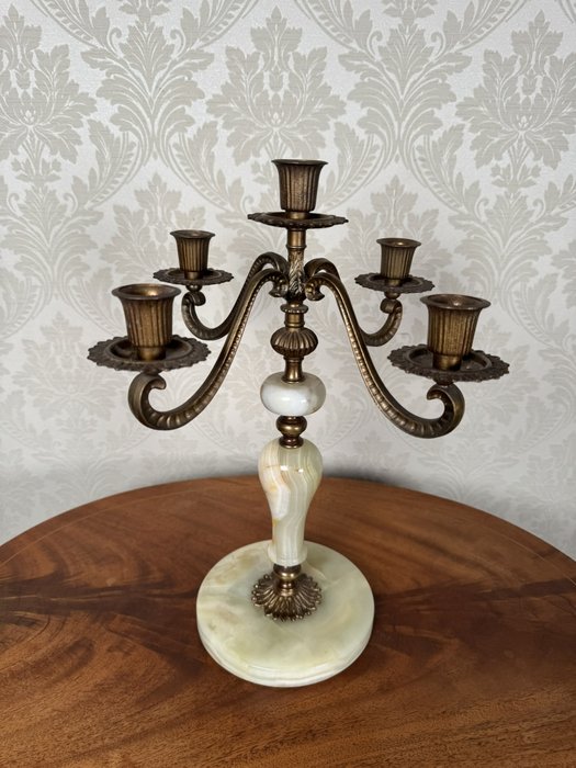 svícen z mosazi s šesti rameny je zasazen do elegantní nohy z leštěného onyxu s jemnou kresbou. Kovové prvky jsou zdobeny rytými motivy a vroubkováním. Harmonické spojení kameniny a kovu dodává celku slavnostní výraz.