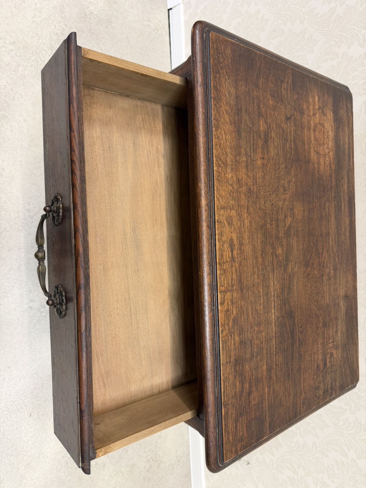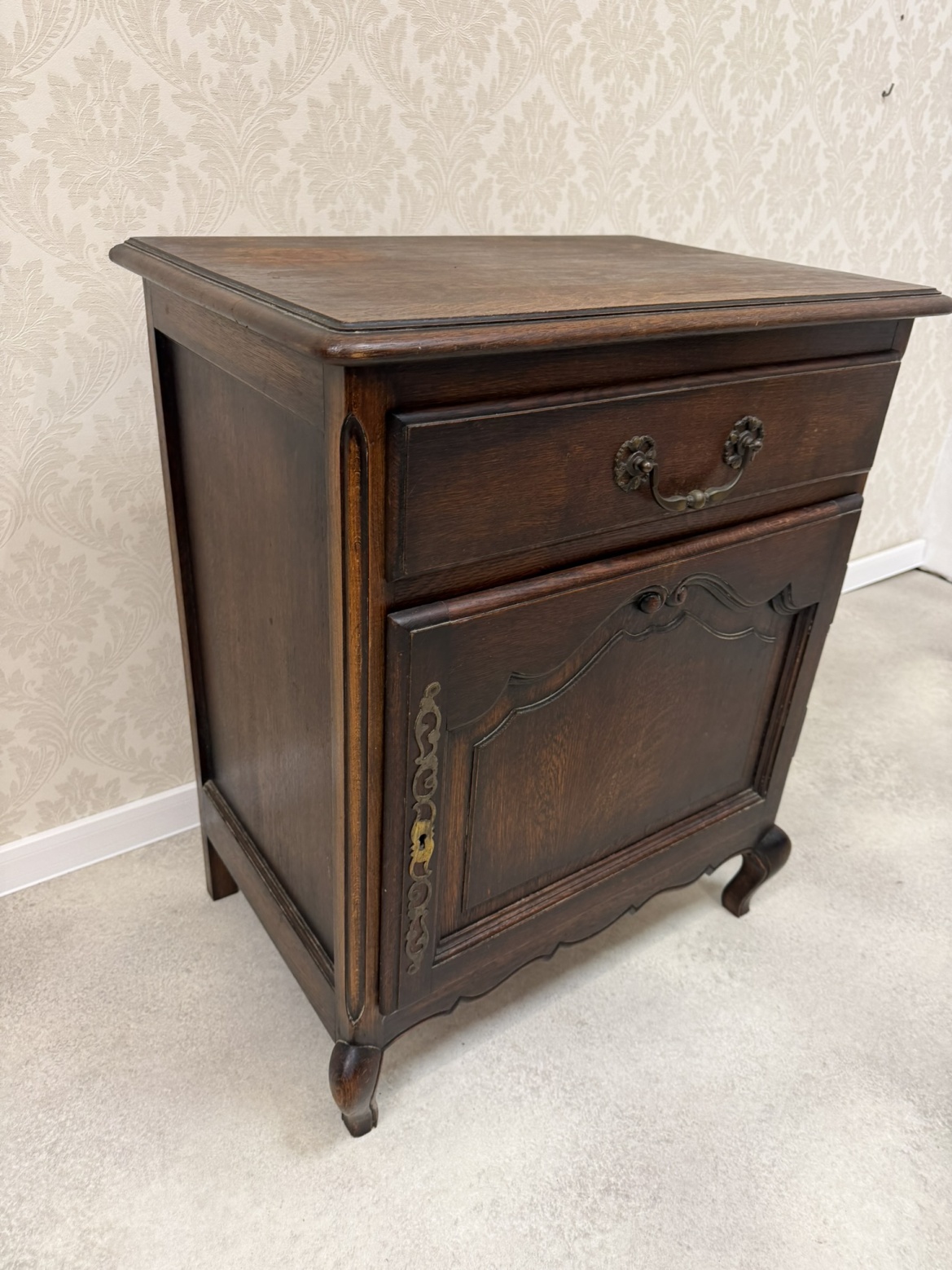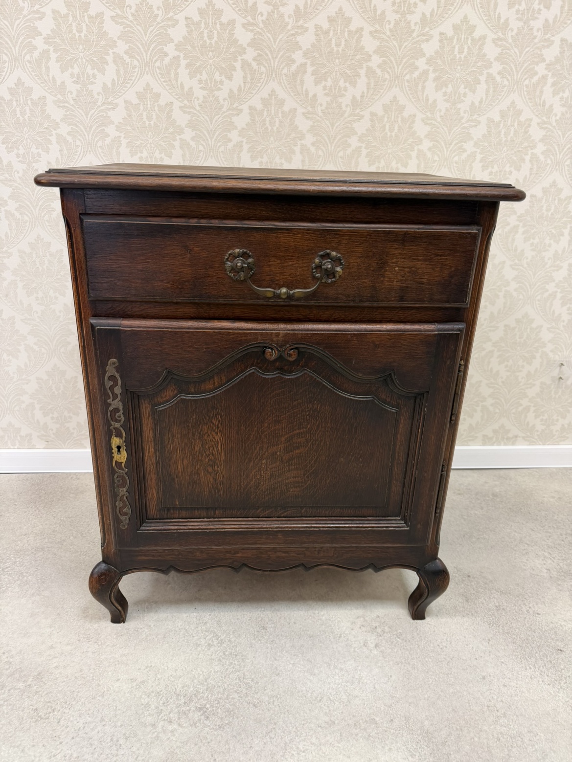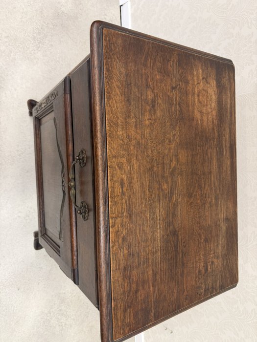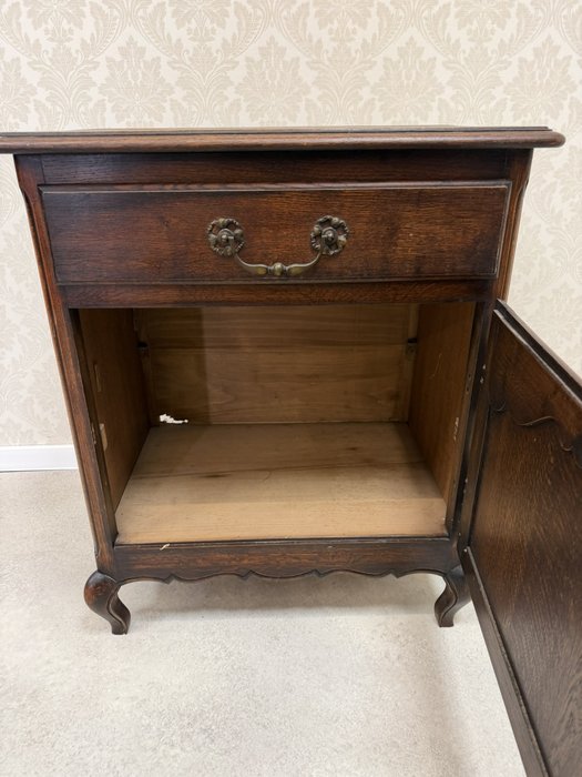 Horní část skříňky je vybavena jednou zásuvkou s dekorativním úchytem, pod ní se nachází uzavíratelný úložný prostor. Čelní dvířka jsou zdobena vyřezávaným rámováním.3 870 Kč