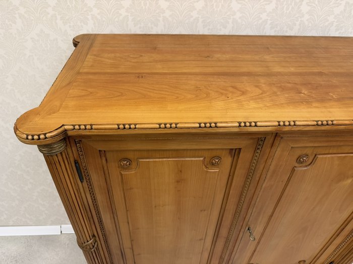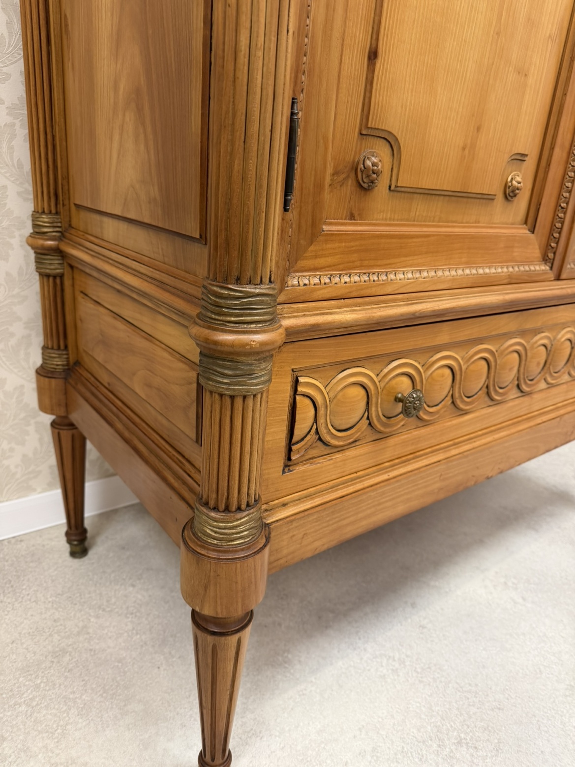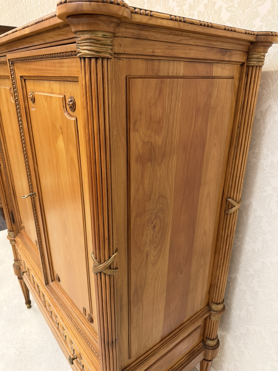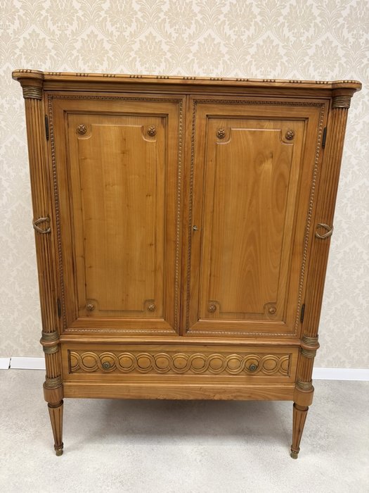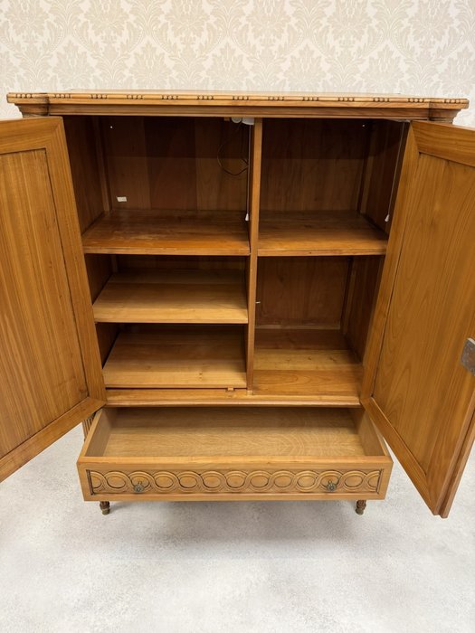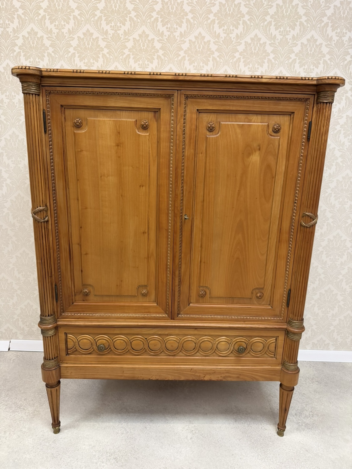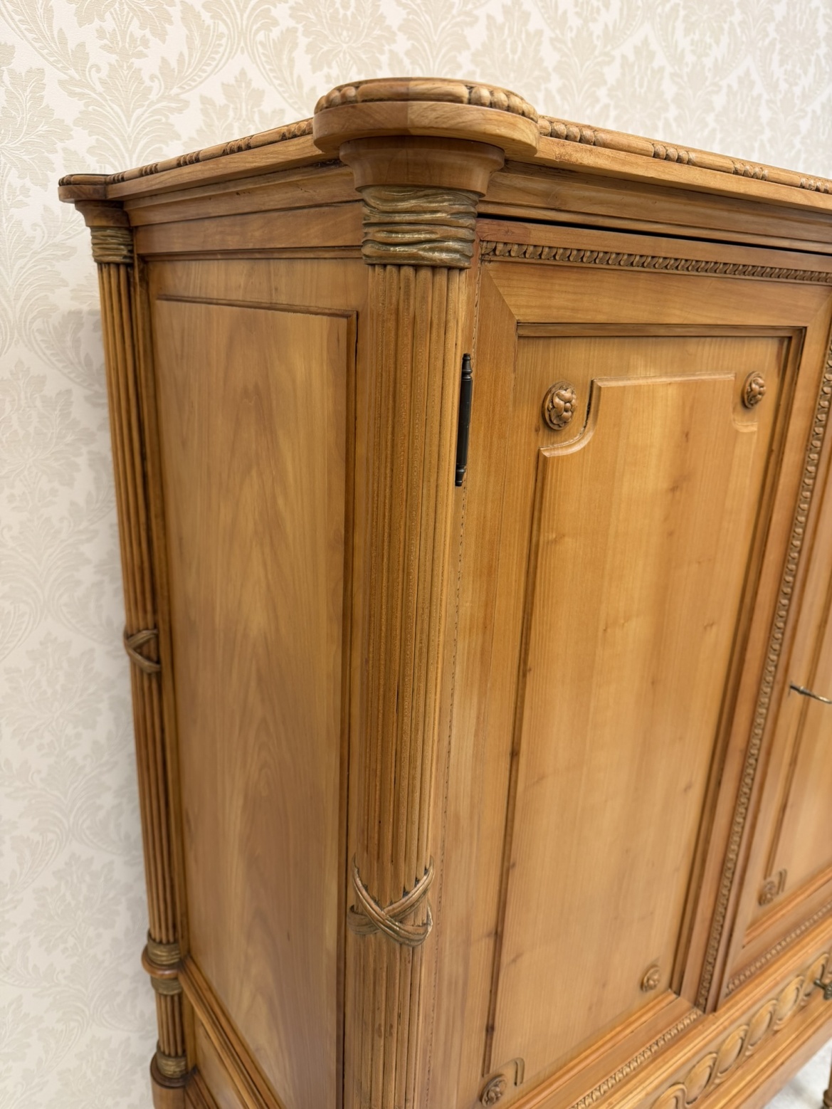 Skříňka z leštěného dřeva s dvěma plnými dvířky, zdobená kanelovanými sloupky, rozetami a jemnou řezbou. Ve spodní části prostorná zásuvka s ornamentem.9 890 Kč