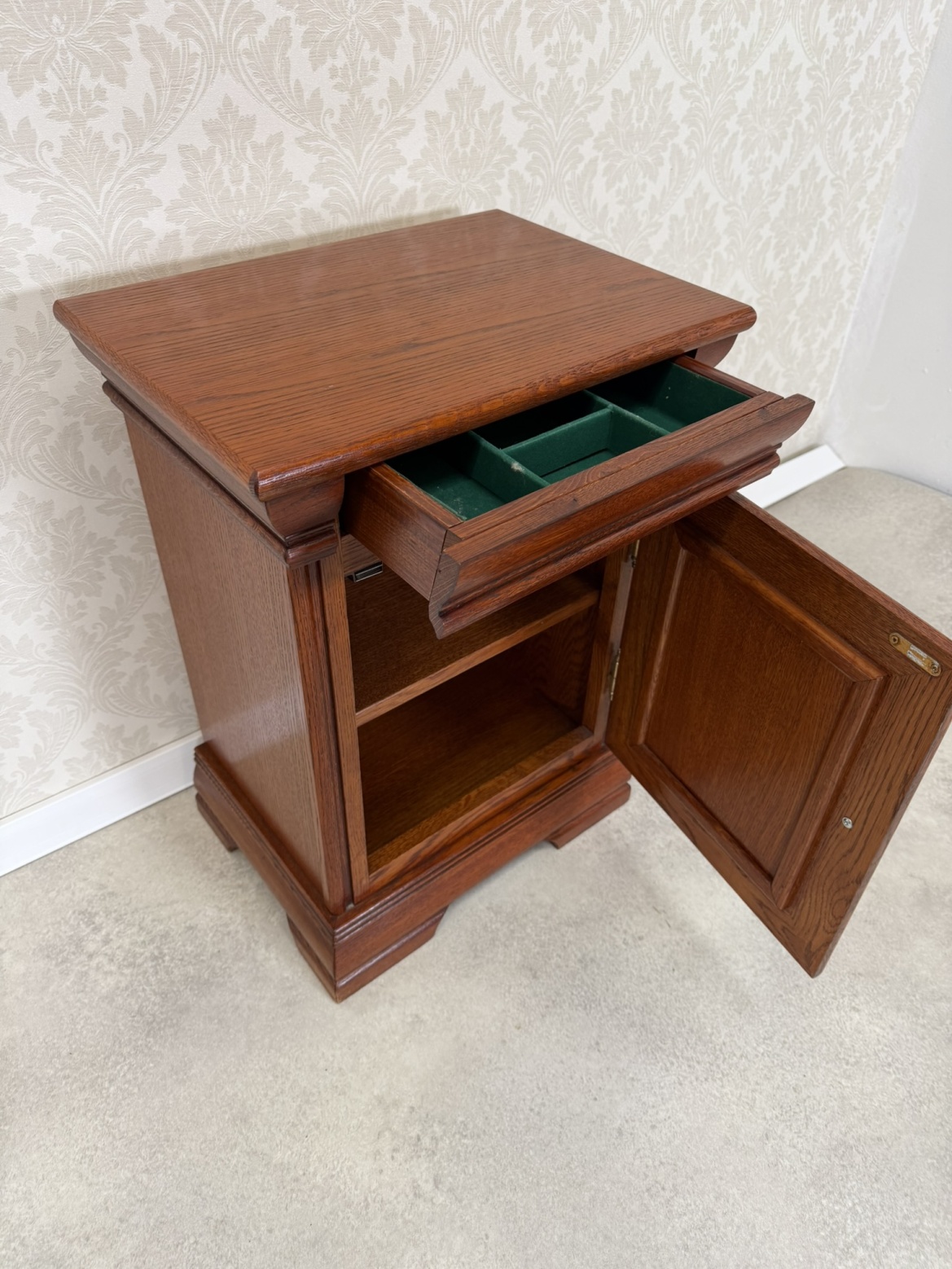 Skříňka s vrchní zásuvkou dělenou na přihrádky a spodními dvířky s úložným prostorem. Vyznačuje se profilovaným soklem, masivní konstrukcí.3 280 Kč