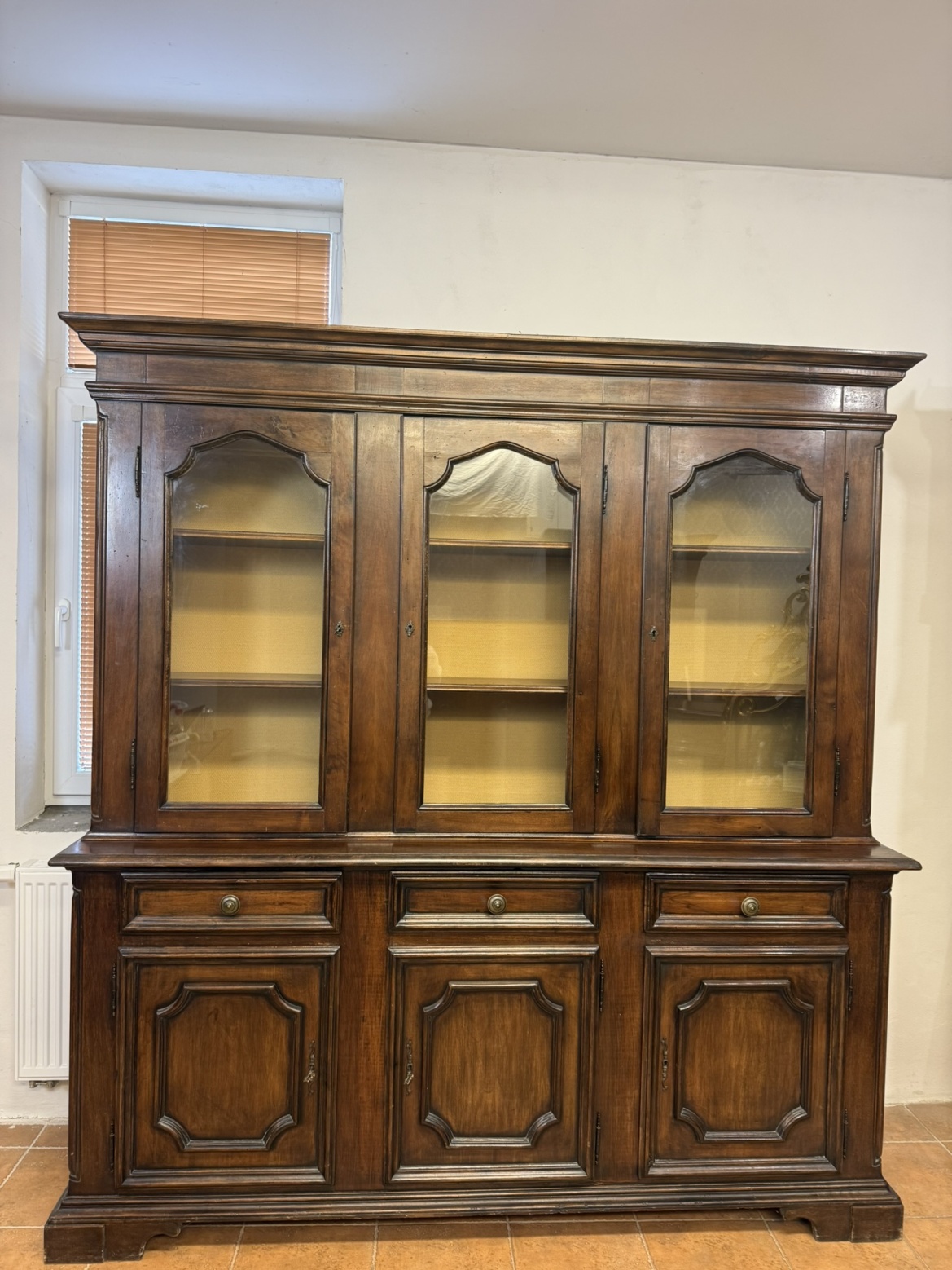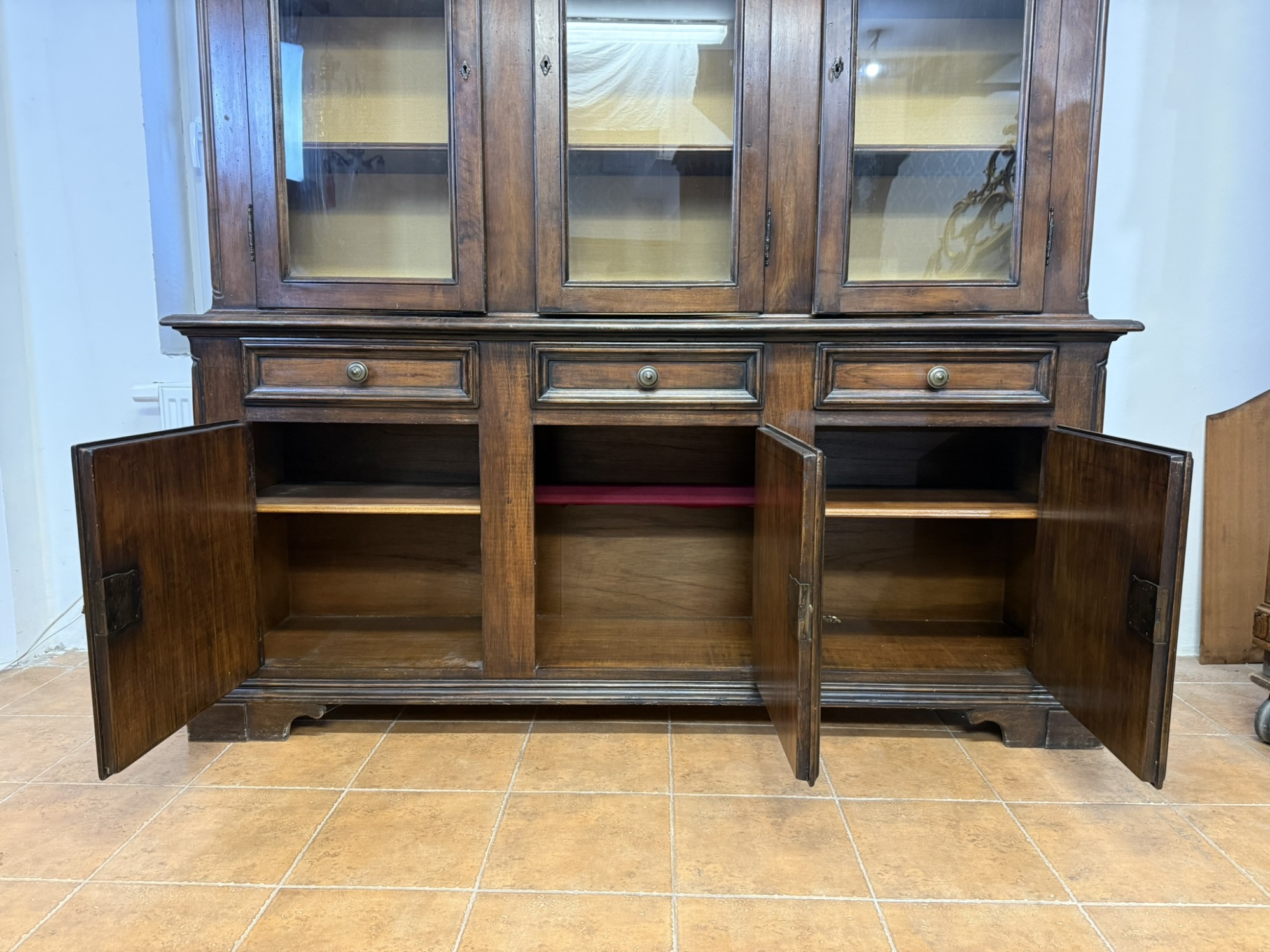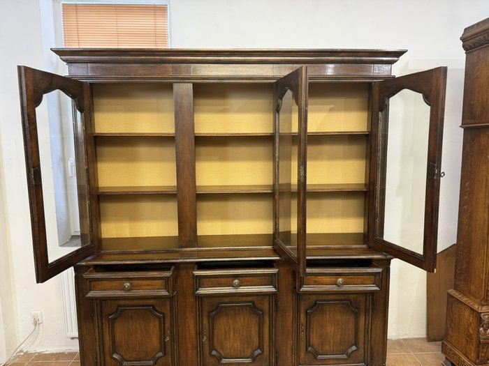 Vrchní prosklená část knihovny se třemi samostatnými dvířky nabízí police pro přehledné vystavení knih nebo dekorací. Spodní část se zásuvkami a uzavíratelnými skříňkami pro praktické uložení předmětů. Dvířka jsou ozdobena profilovanými kazetami s výraznými rámy, které podtrhují historizující charakter nábytku. Tmavá patina zvýrazňuje strukturu a dodává knihovně teplý, reprezentativní vzhled.16 850 Kč