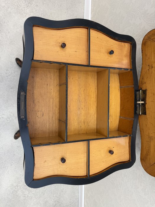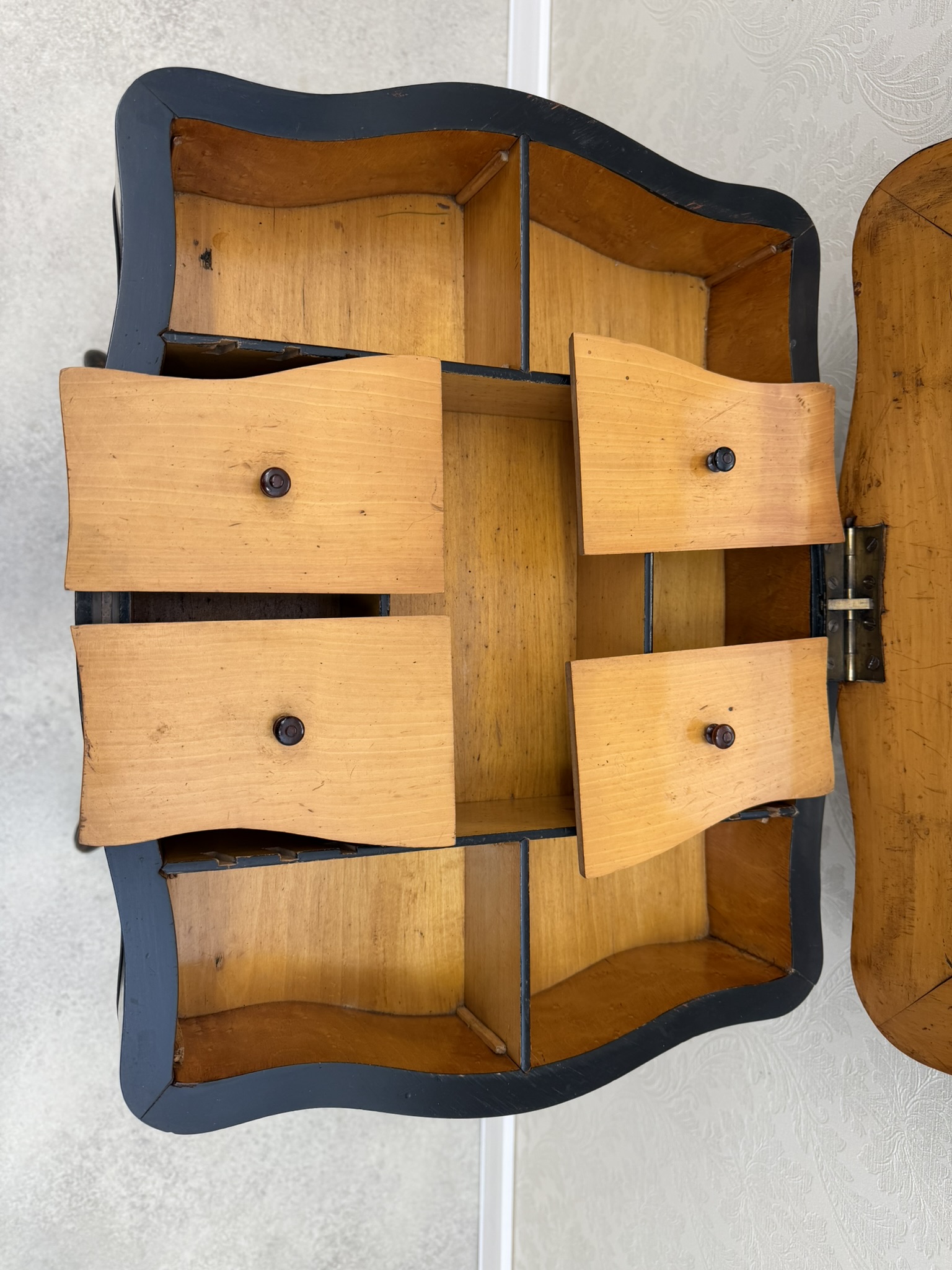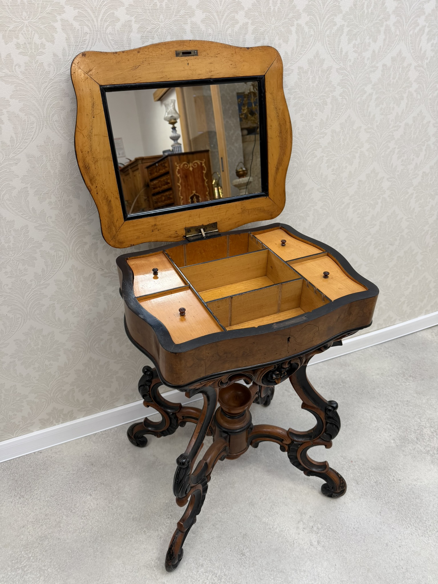 Intarzovaný stolek. Období biedermeier, stolek má úložný prostor se zrcadlem a několika přihrádkami pro šperky a jiné drobnosti.