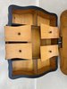 Vnější rám je zdoben decentními křivkami a jemným kontrastním lemováním. Nohy jsou mistrně řezané, což přidává kusu noblesu.