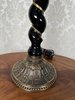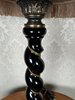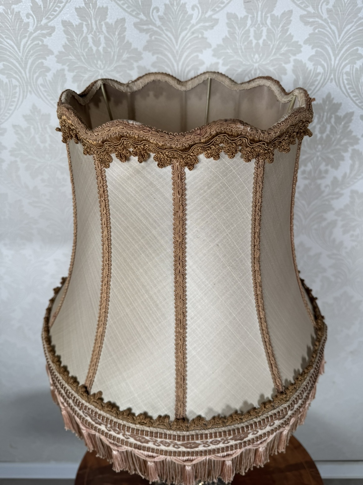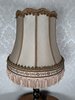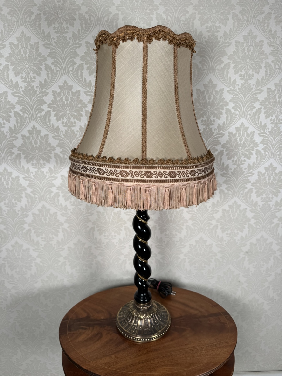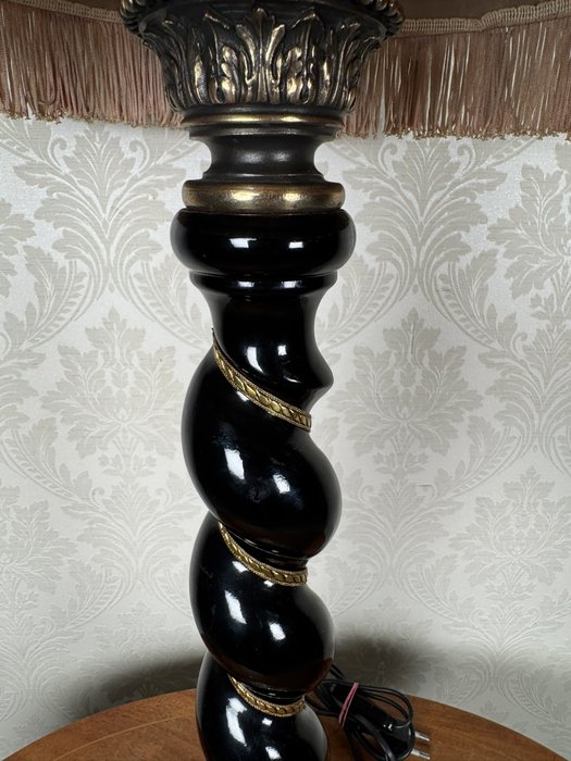 Elegantní stolní lampa s textilním stínidlem lemovaným třásněmi a krajkou. Tělo lampy tvoří točený dřevěný sloupek s černým lakem, dekorovaný linkou, zakončený mosaznou patinovanou podstavou s reliéfem akantových listů.5 180 Kč