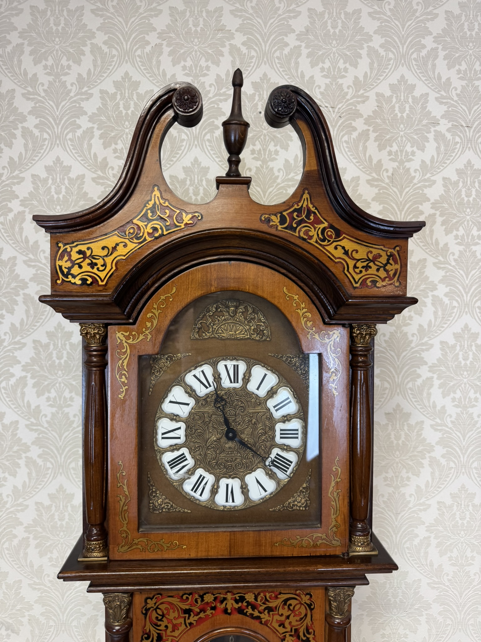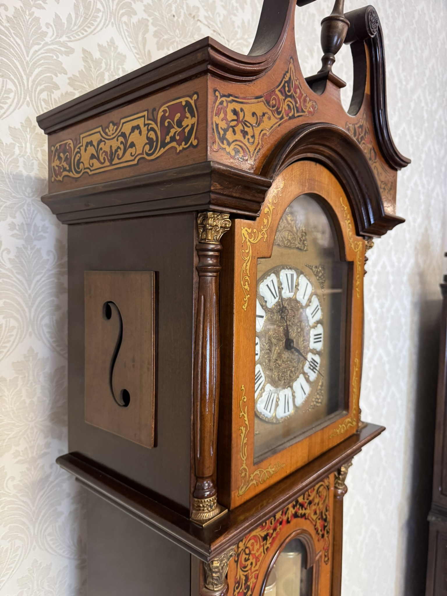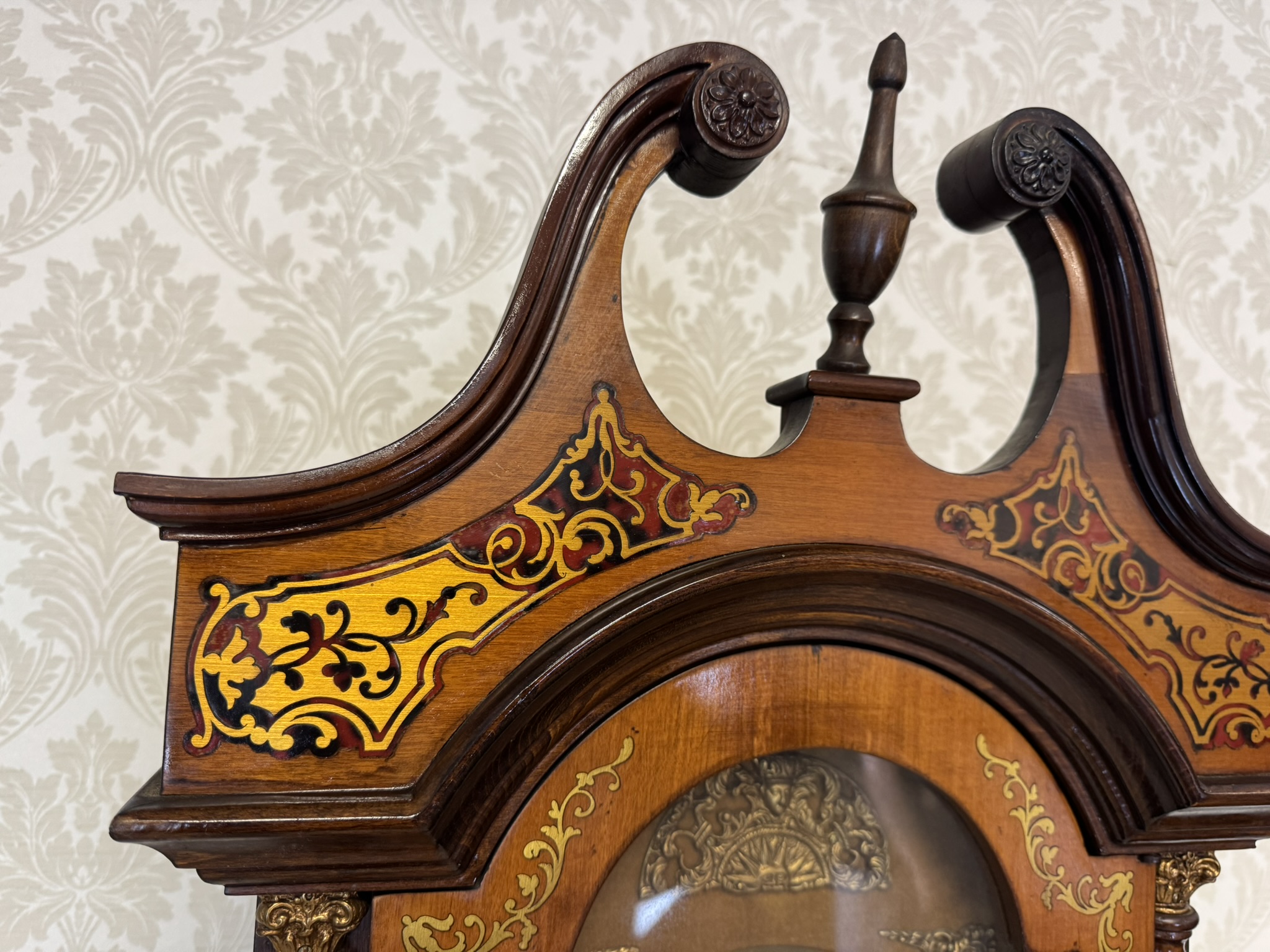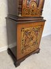 Stojací hodiny zdobené bohatou intarzií v kontrastních tónech. Vrchní část zakončena typickým zvlněným nástavcem a špičatým ornamentem. Ciferník s římskými číslicemi podtrhuje historizující charakter.22 350 Kč