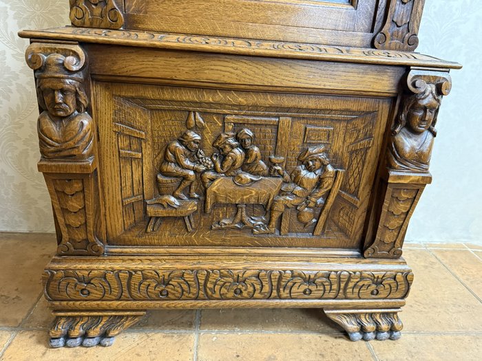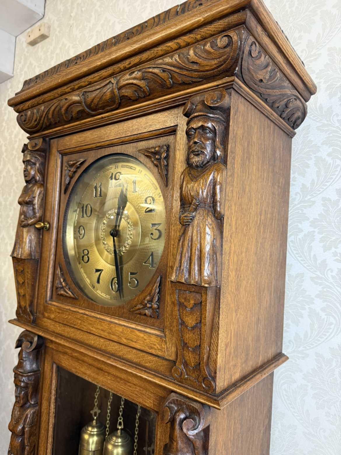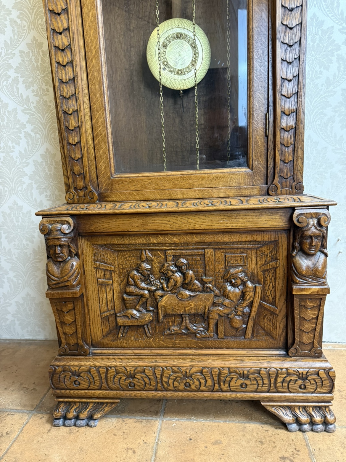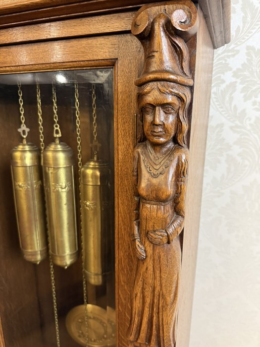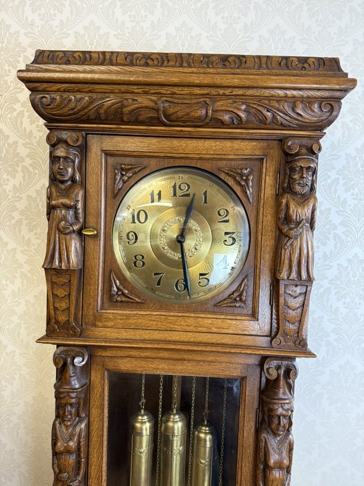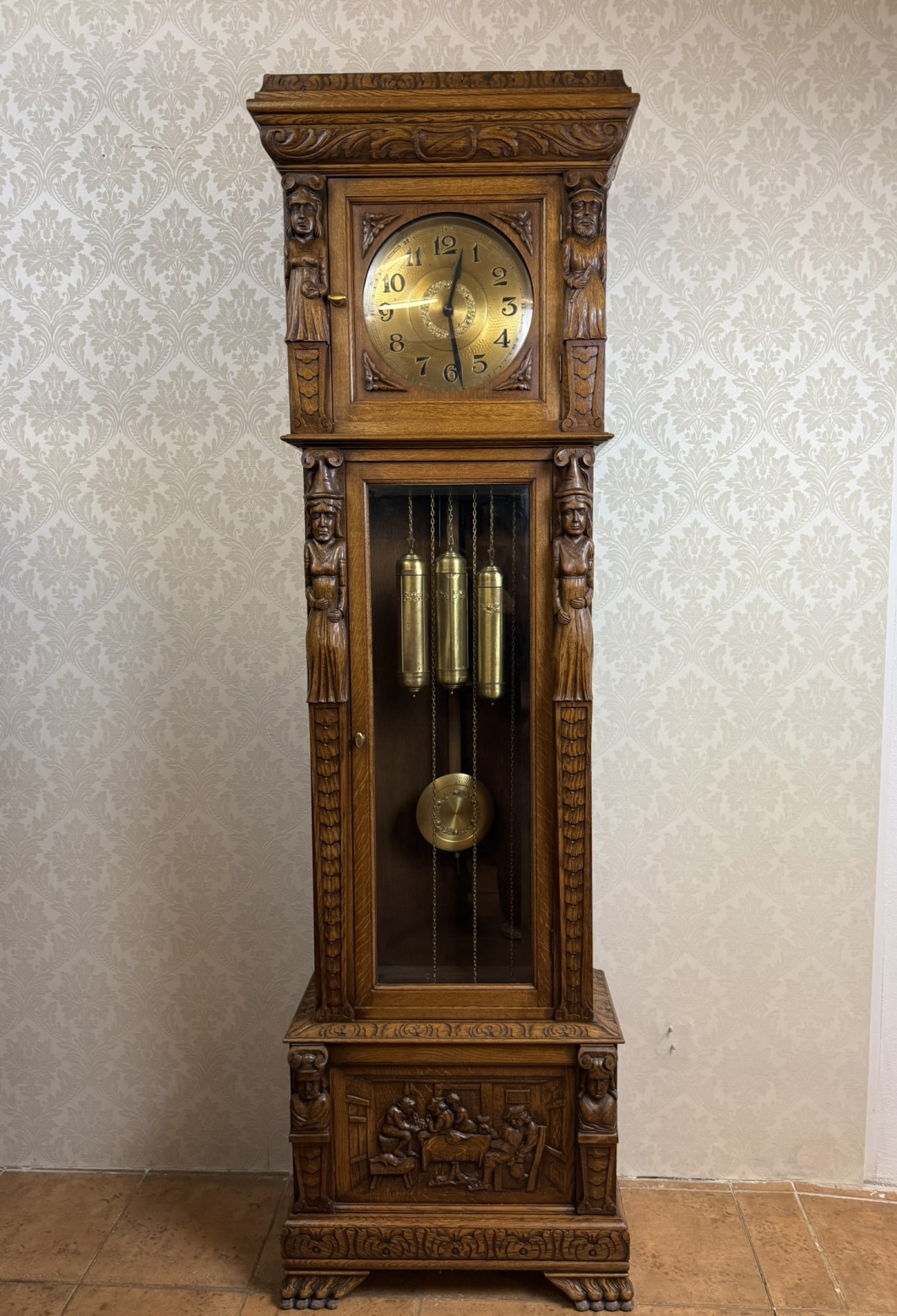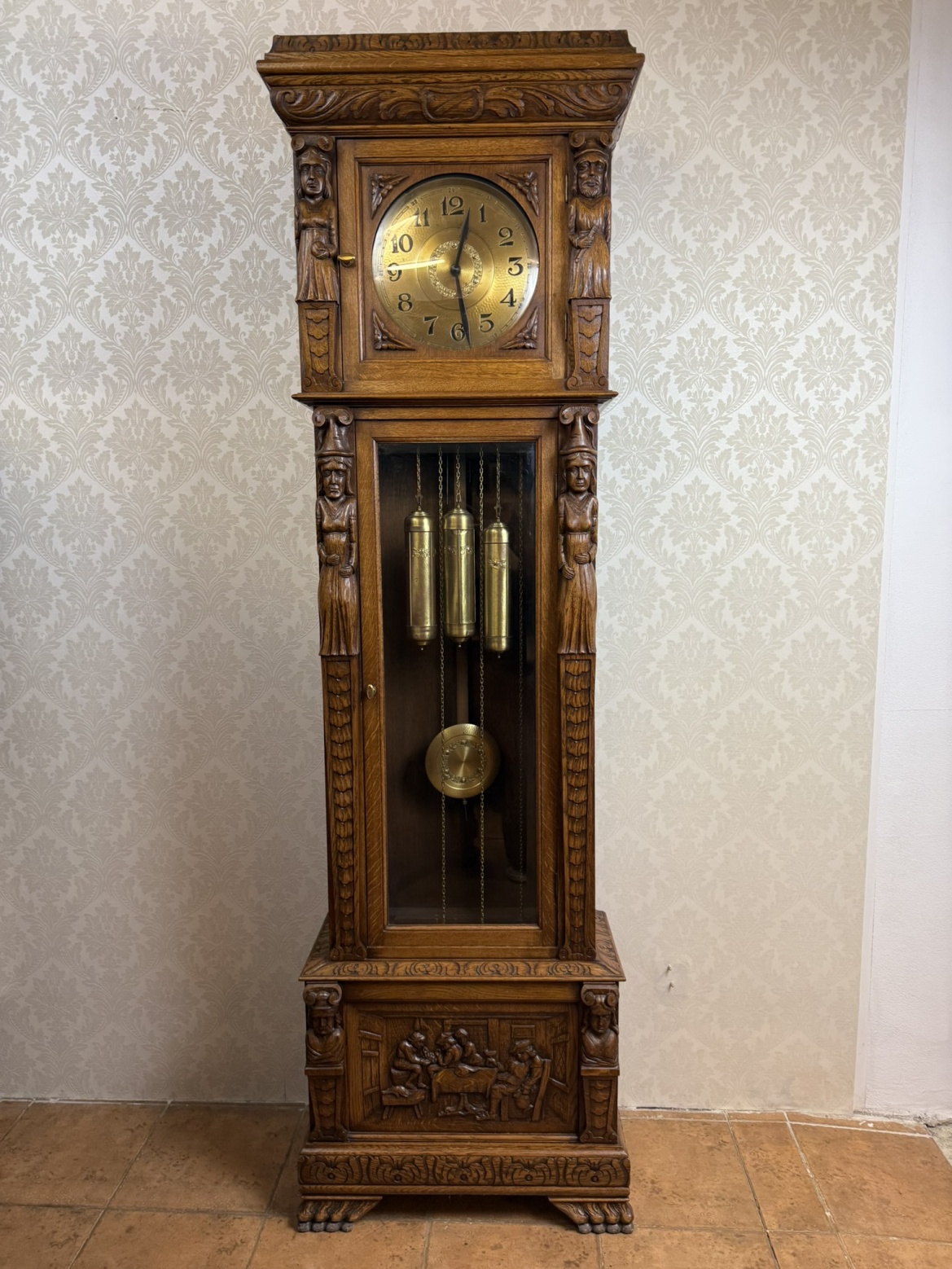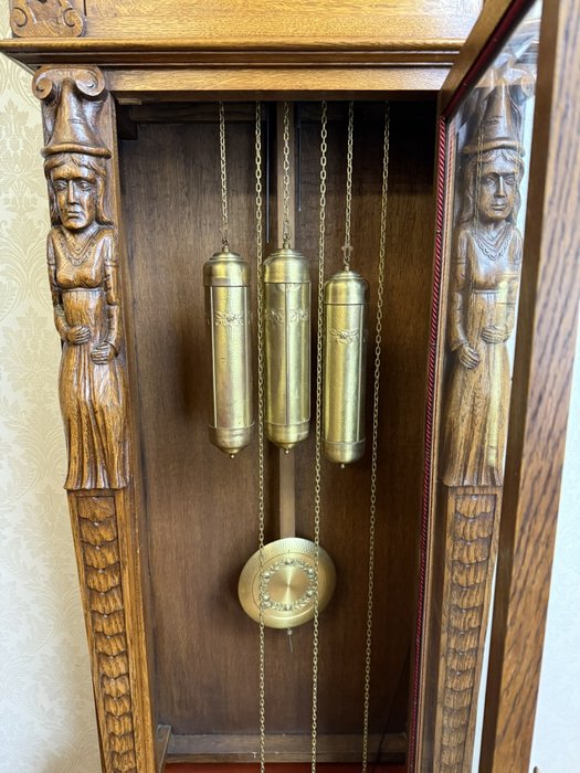 Masivní podlahové hodiny s mosazným ciferníkem a třemi závažími, zasazené v dřevěné skříni s propracovanými řezbami. Figurální sloupky, motiv hostince ve spodní části a jemně profilované římsy vytvářejí výrazný celek řemeslného umění.