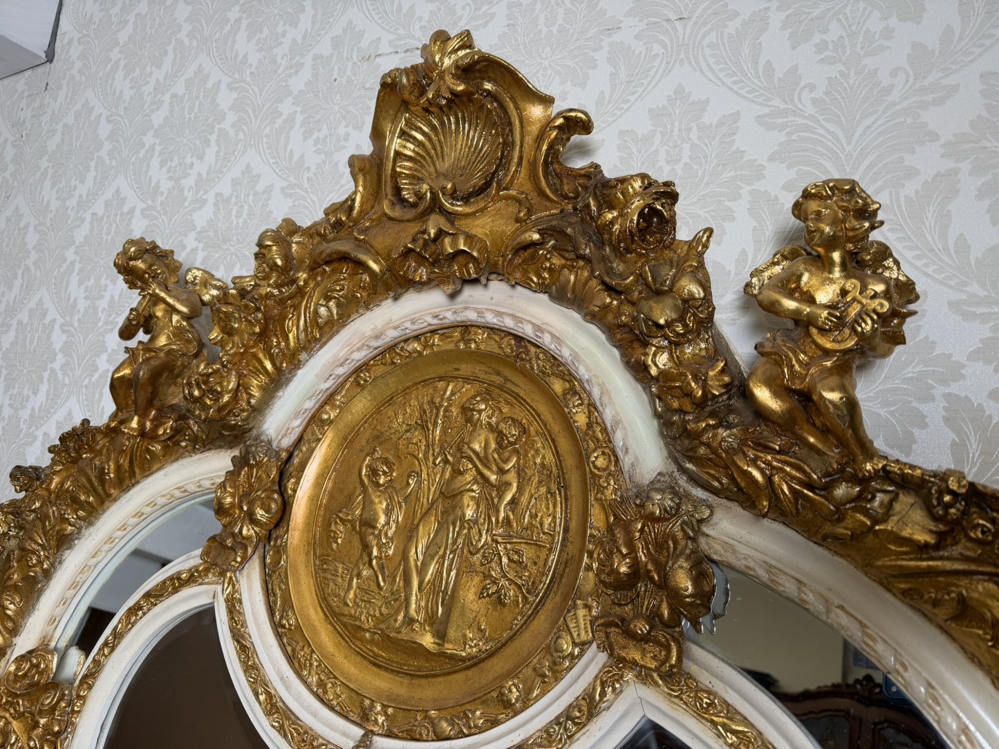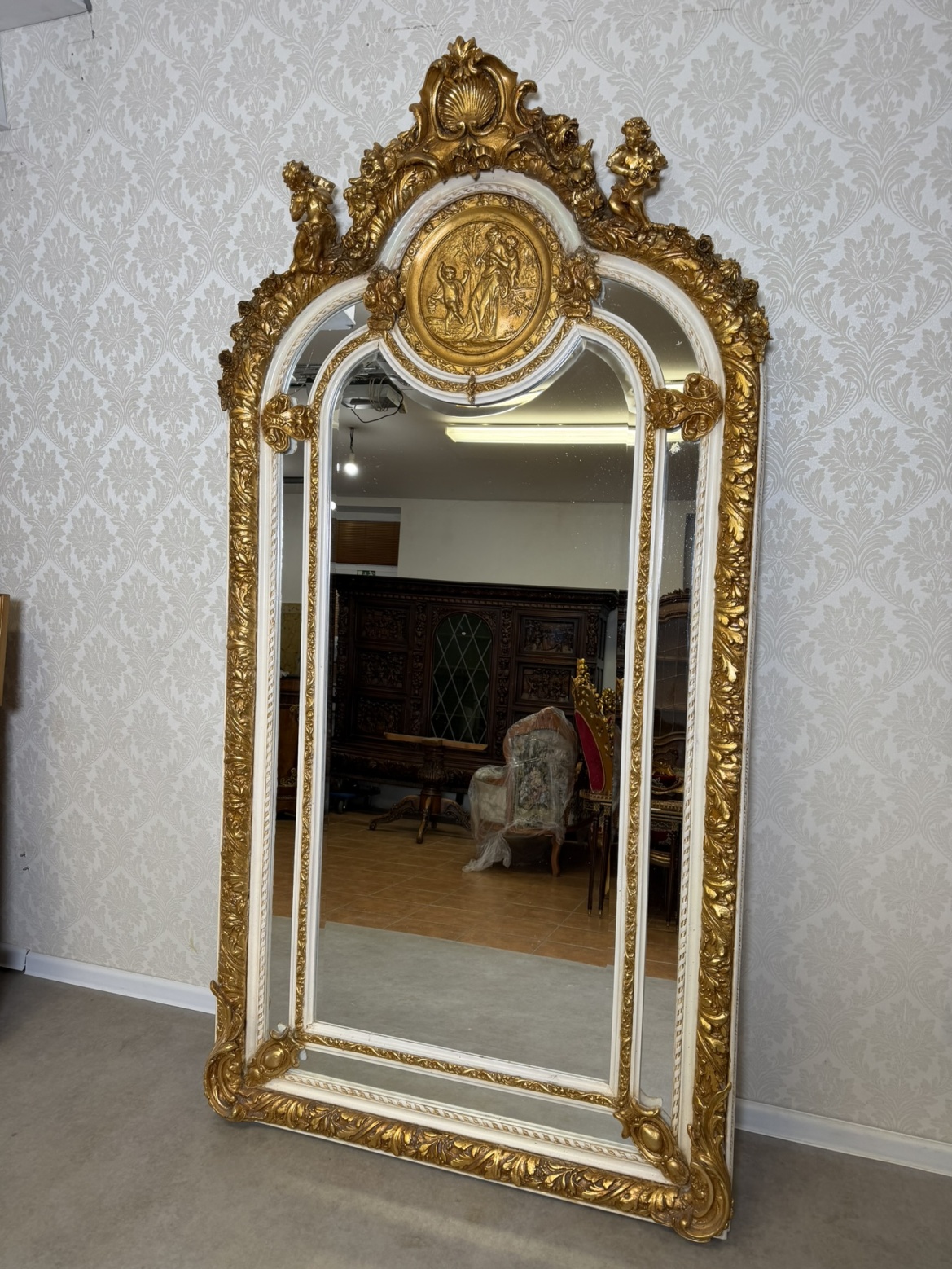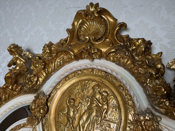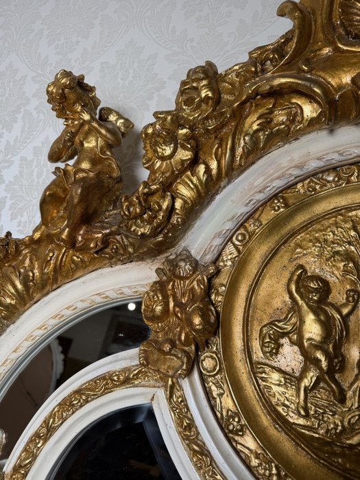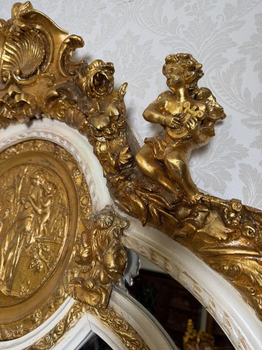 Velké stojací zrcadlo s rámem zdobeným bohatými plastickými ornamenty, centrálním medailonem s mytologickou scénou a postavami andílků hrajících na loutnu.Kombinace bílé a kovového odstínu s teplým nádechem zvýrazňuje dekorativní motivy mušlí, listů a volut.12 980 Kč