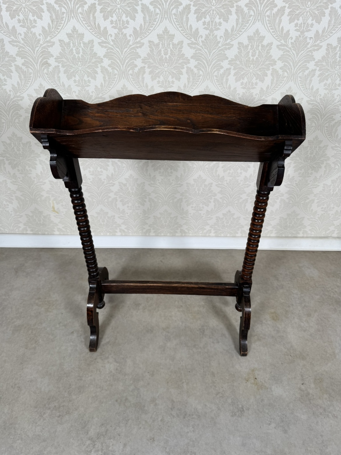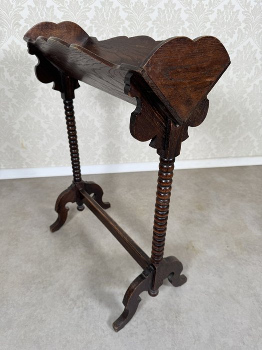 Stojan na časopisy s dekorativně vykrajovanými bočnicemi a horním zvlněným lemem. Nohy jsou řešeny formou točených sloupků spojených příčkou pro stabilitu.2 150 Kč