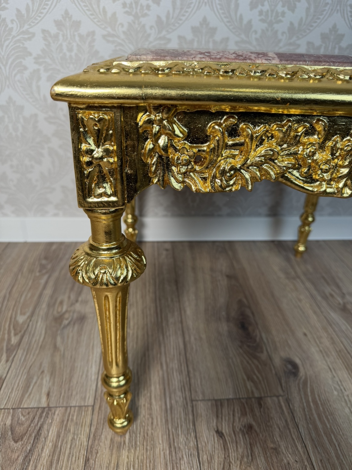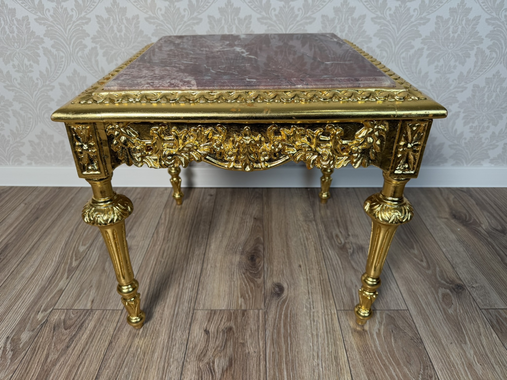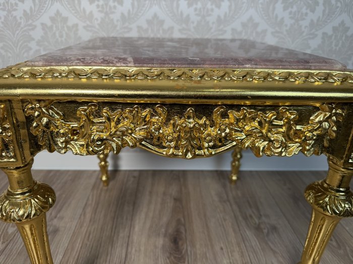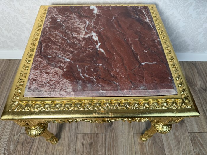 Stolek s mramorovou deskou a detailně propracovaným podnožím. Čelní část zdobí hluboká plastická řezba s florálními motivy a centrálním akantovým medailonem. Celý povrch je upraven luxusní zlatou patinou, která podtrhuje palácový charakter nábytku.Bílý čtvercový stolek s mramorem