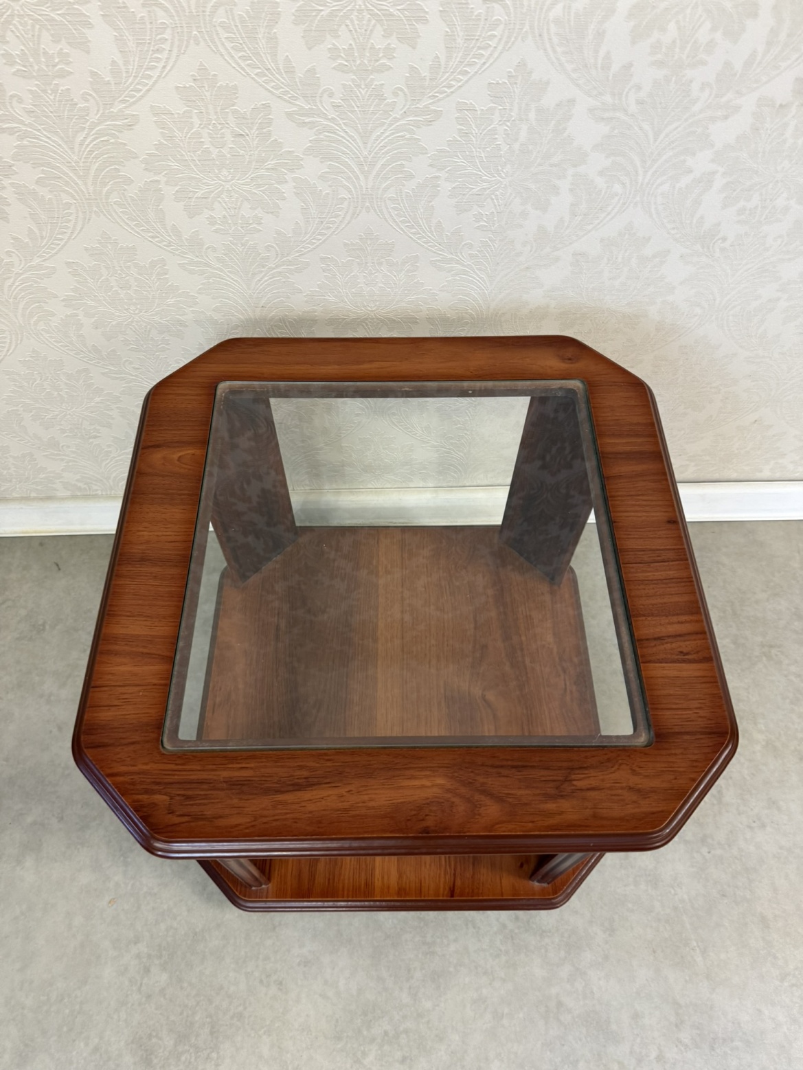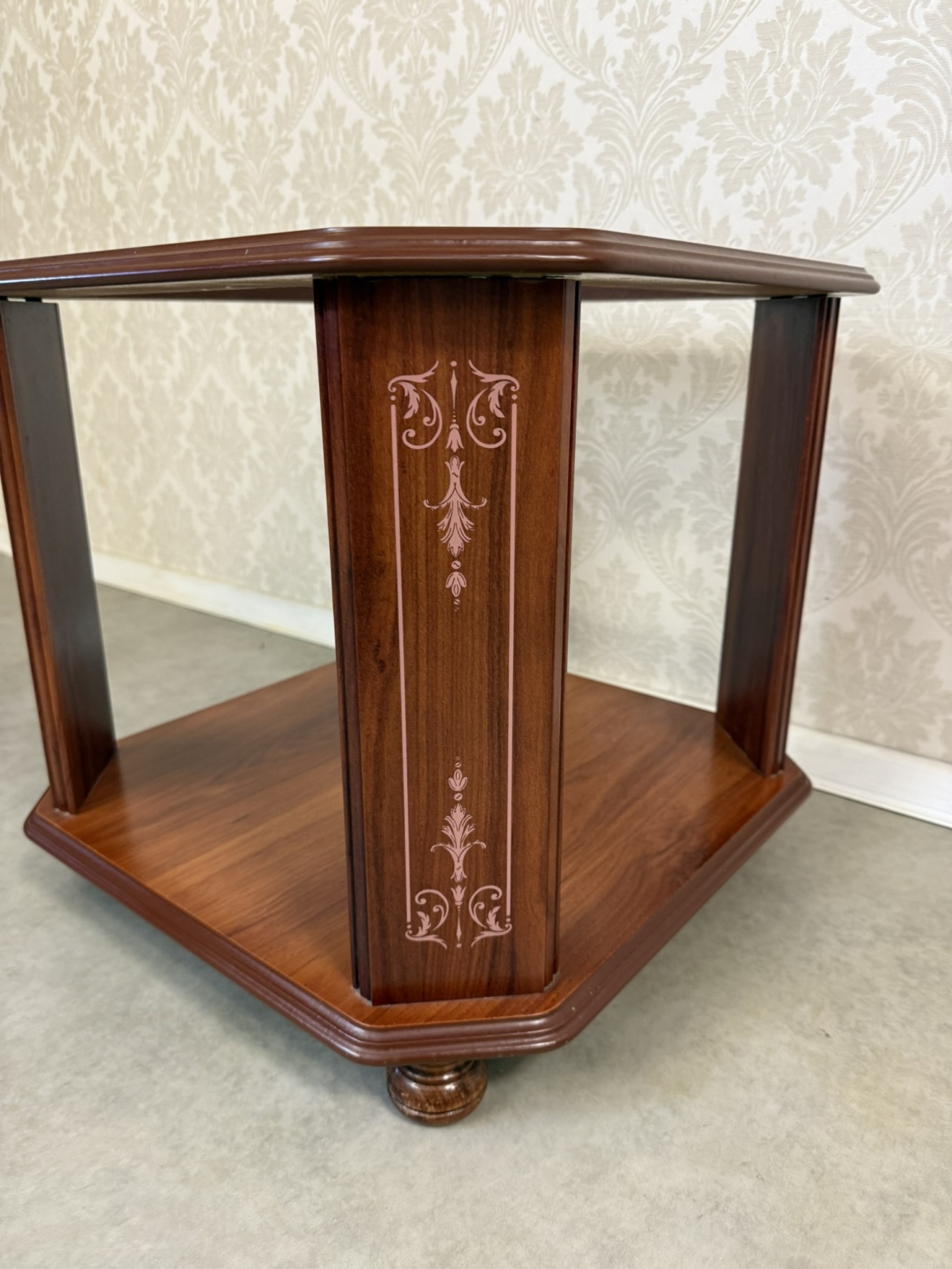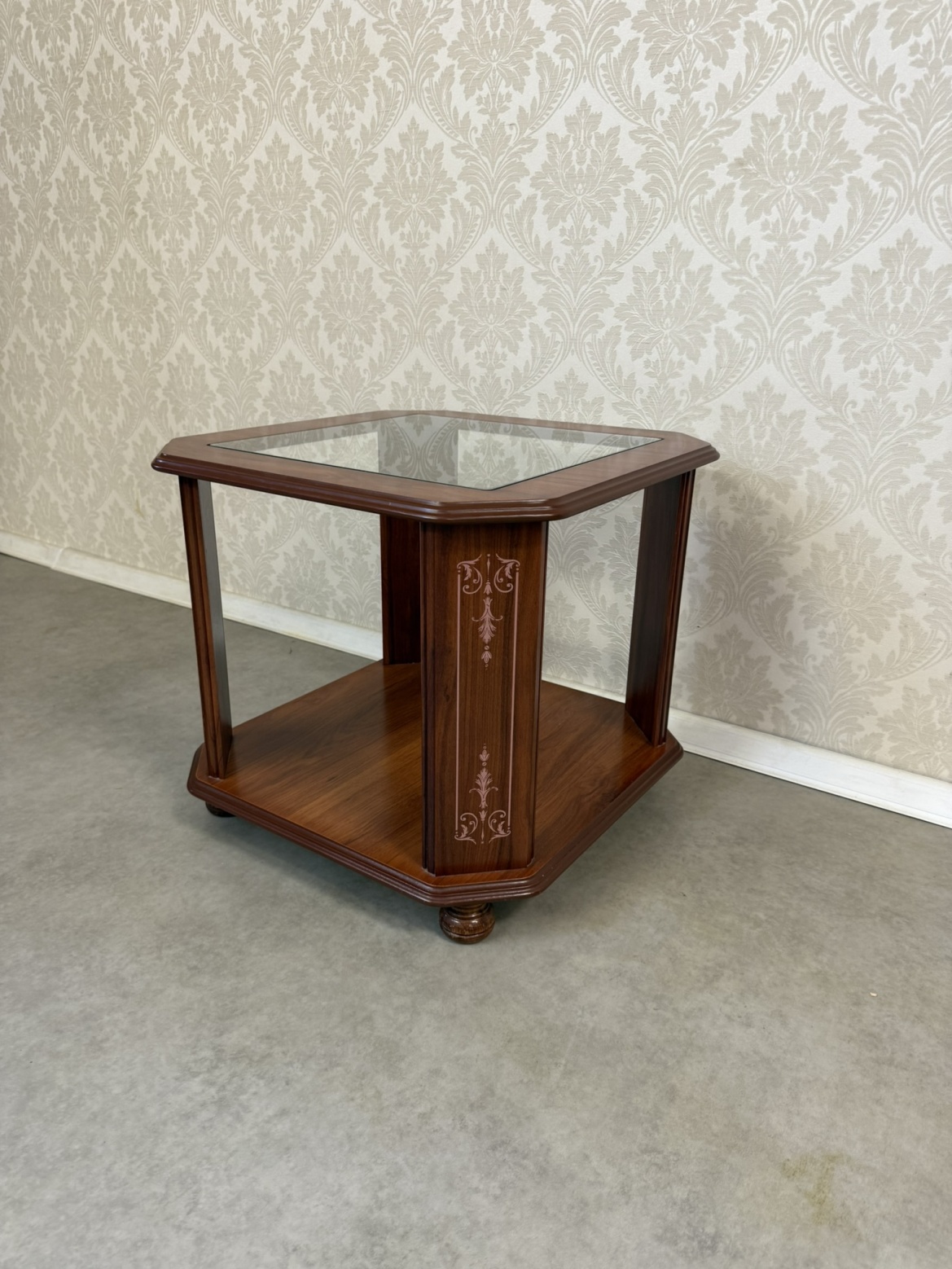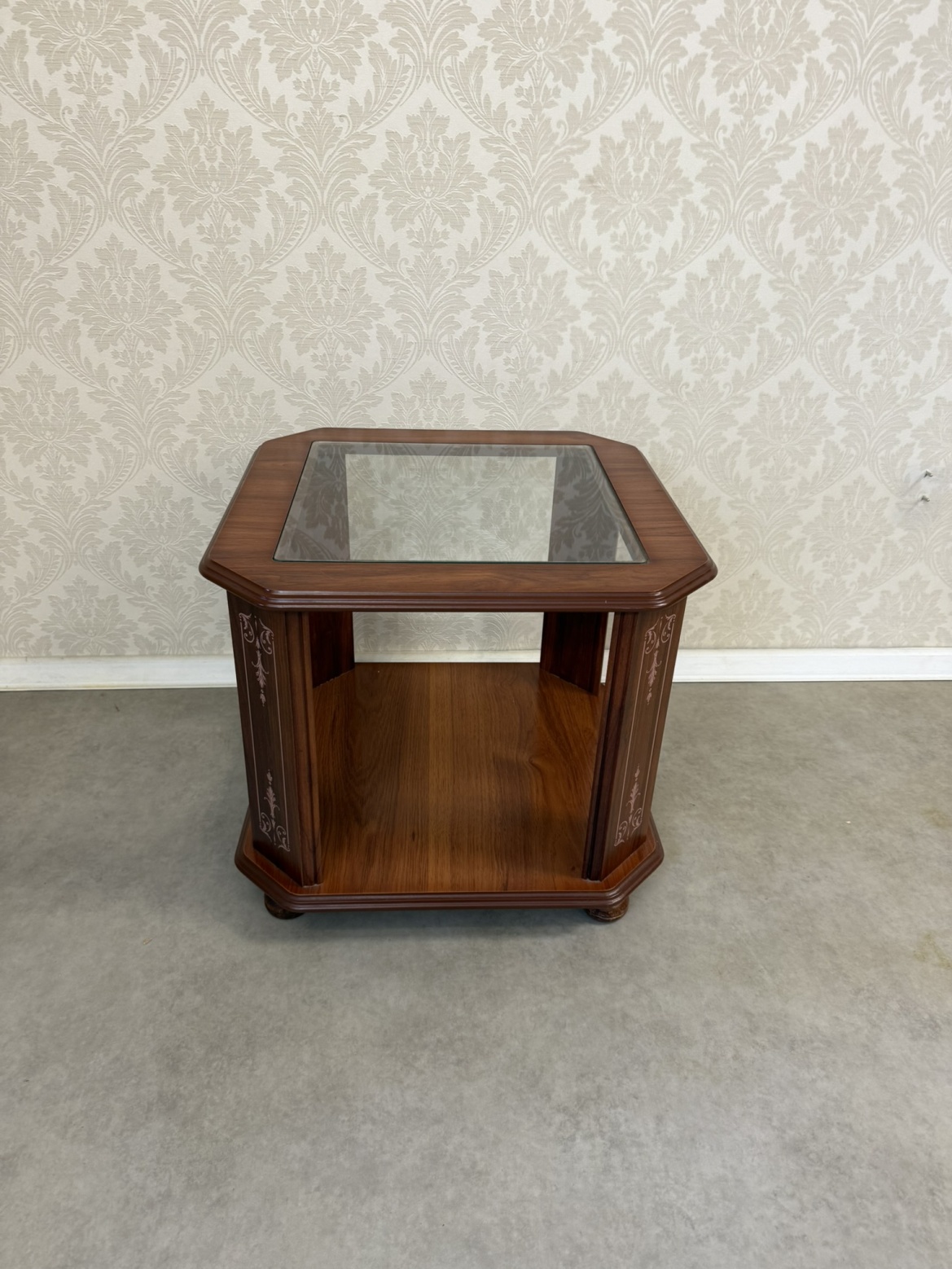 Stolek s čtvercovou skleněnou deskou vsazenou do dřevěné základny. Sloupky zdobí jemný dekor s rostlinnými motivy. Tvarově řešená podstava poskytuje další odkládací prostor.3 270 Kč