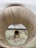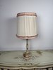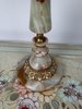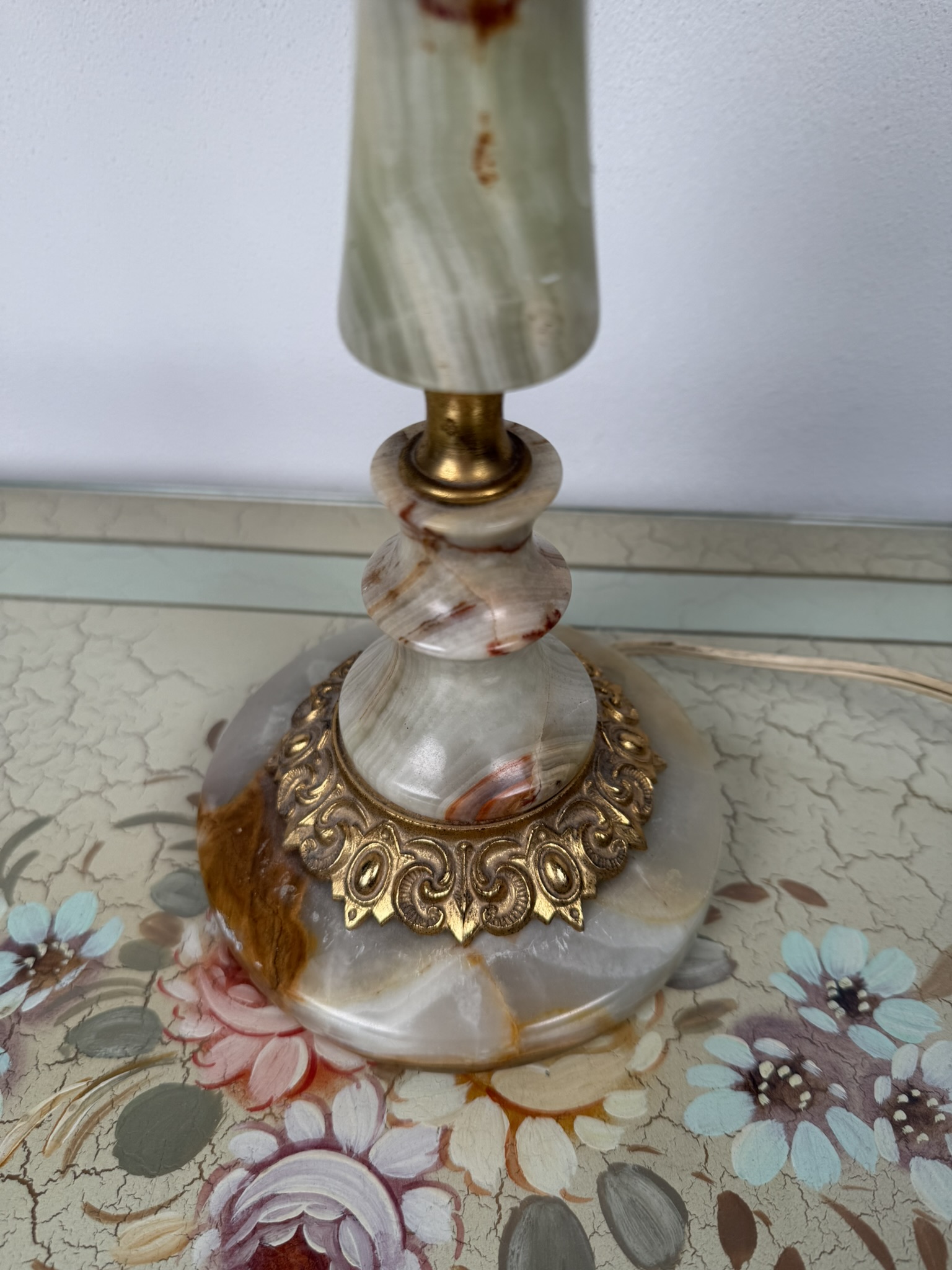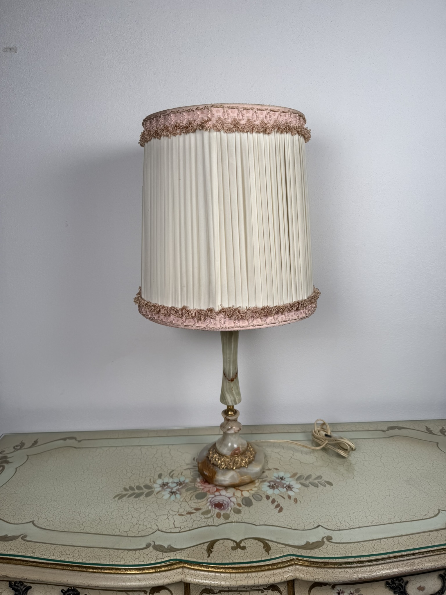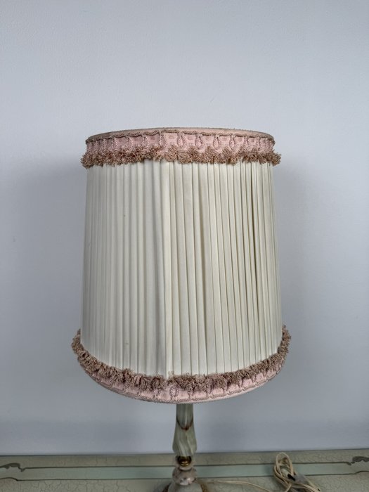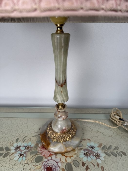 Stolní elektrická lampa s tělem z leštěného onyxu ve světlých zelenkavých tónech. Spodní část tvoří výrazná patka s ornamentem ve zlatém odstínu a onyxová základna. Lampa je doplněna řaseným textilním stínidlem světlé barvy s ozdobným růžovým lemem. Lampa je plně funkční.