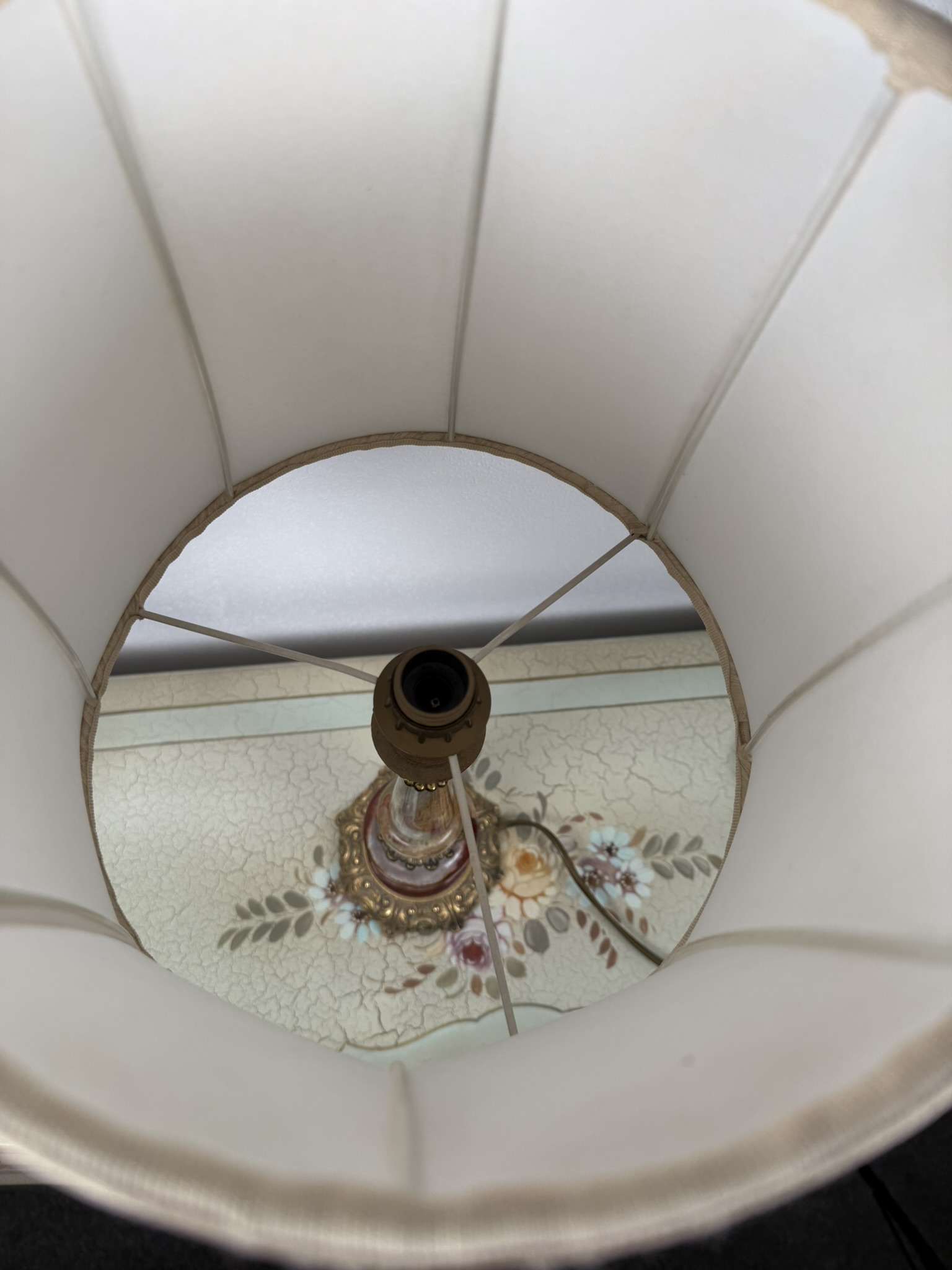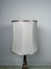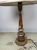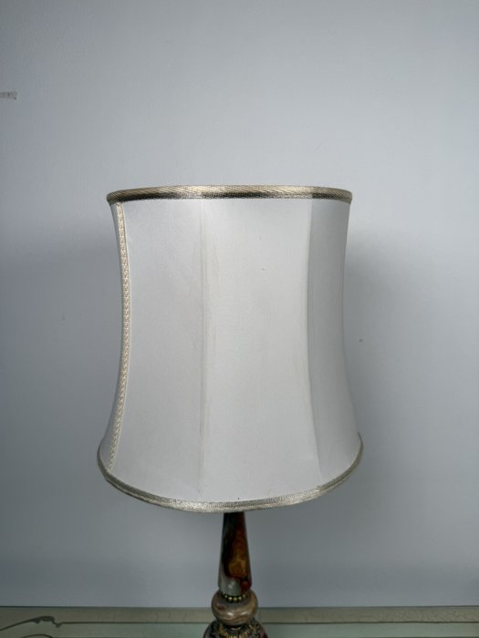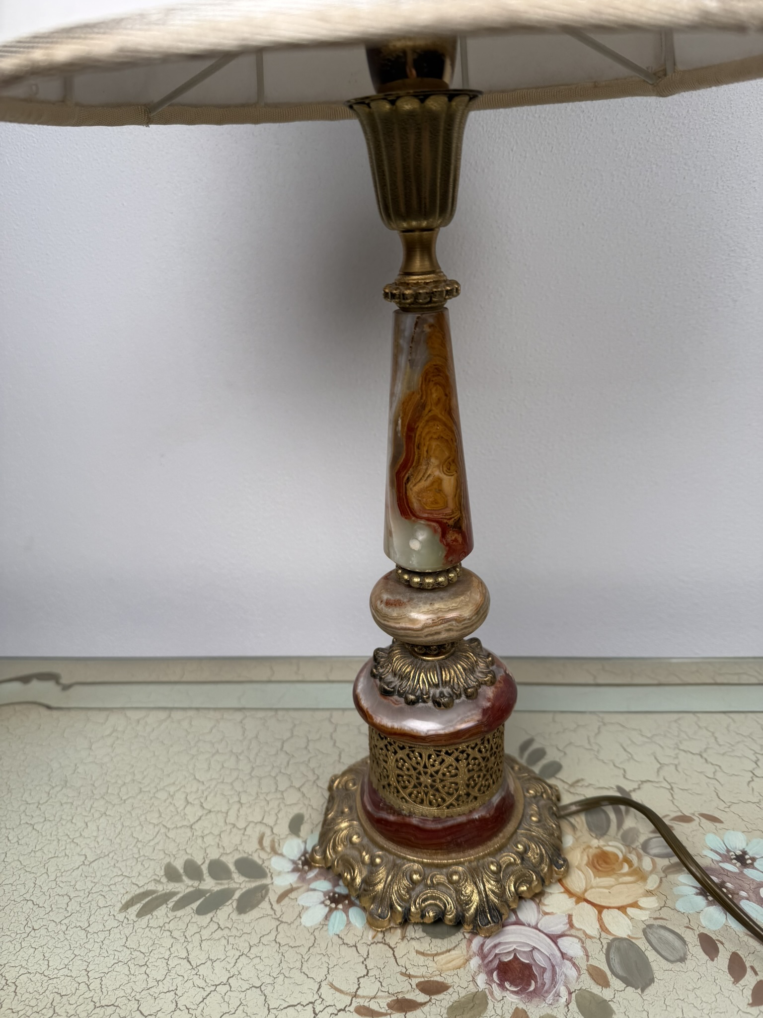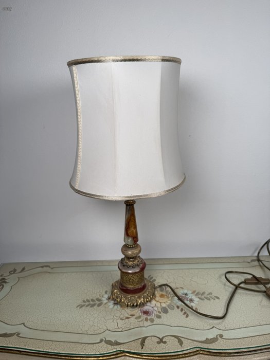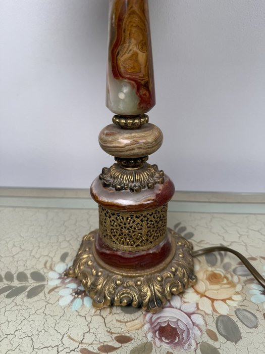 Stolní elektrická lampa s tělem z leštěného onyxu v kombinaci červených, medových a krémových tónů. Spodní část tvoří masivní patka s ornamentem a kovovými detaily v teplém zlatém odstínu, doplněná perforovaným dekorem ve střední části. Lampa je osazena světlým textilním stínidlem.