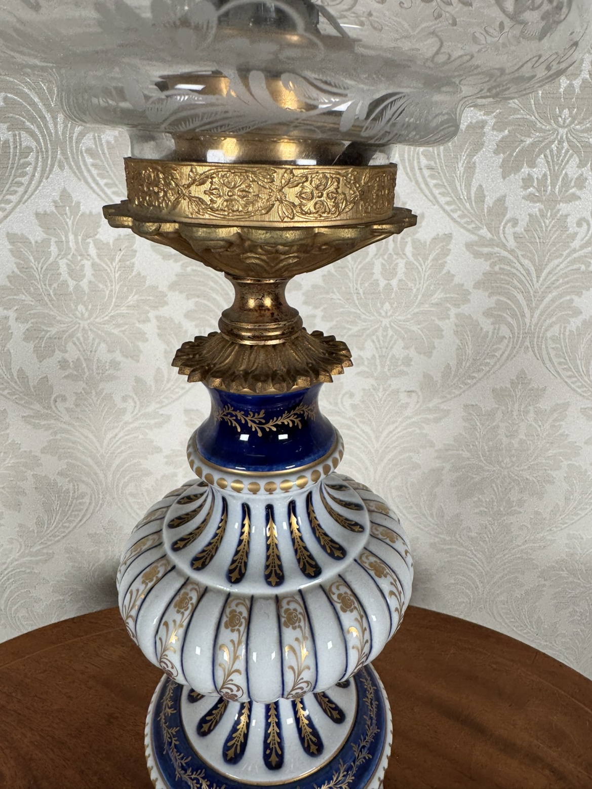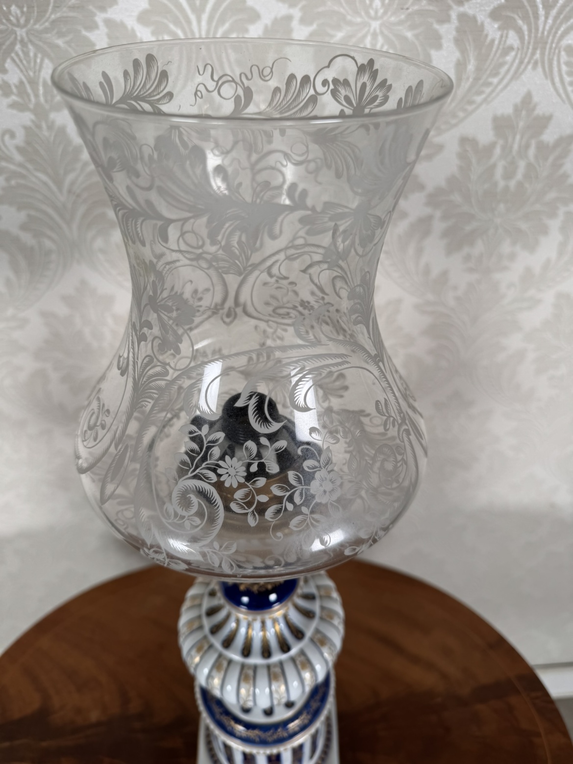 Elegantní lampa na mosazném základu s porcelánovým tělem v bílé a kobaltové barvě, zdobená rostlinnými motivy. Skleněné stínidlo s jemným leptem květin dodává jemnost a slavnostní výraz. Luxusní materiály podtrhují dekorativní charakter.5 160 Kč