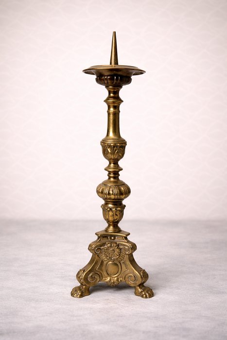 Bohatě zdobený mosazný svícen s detaily, reliéfními motivy květin a volut a trojnohou základnou ve tvaru zvířecích tlap.1 560 Kč