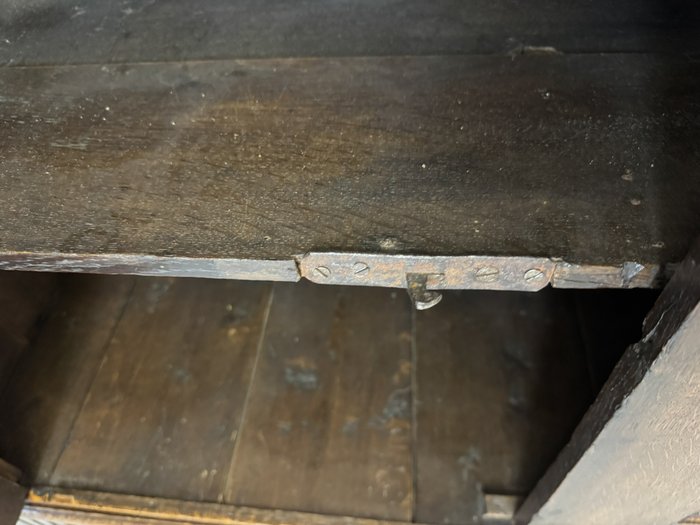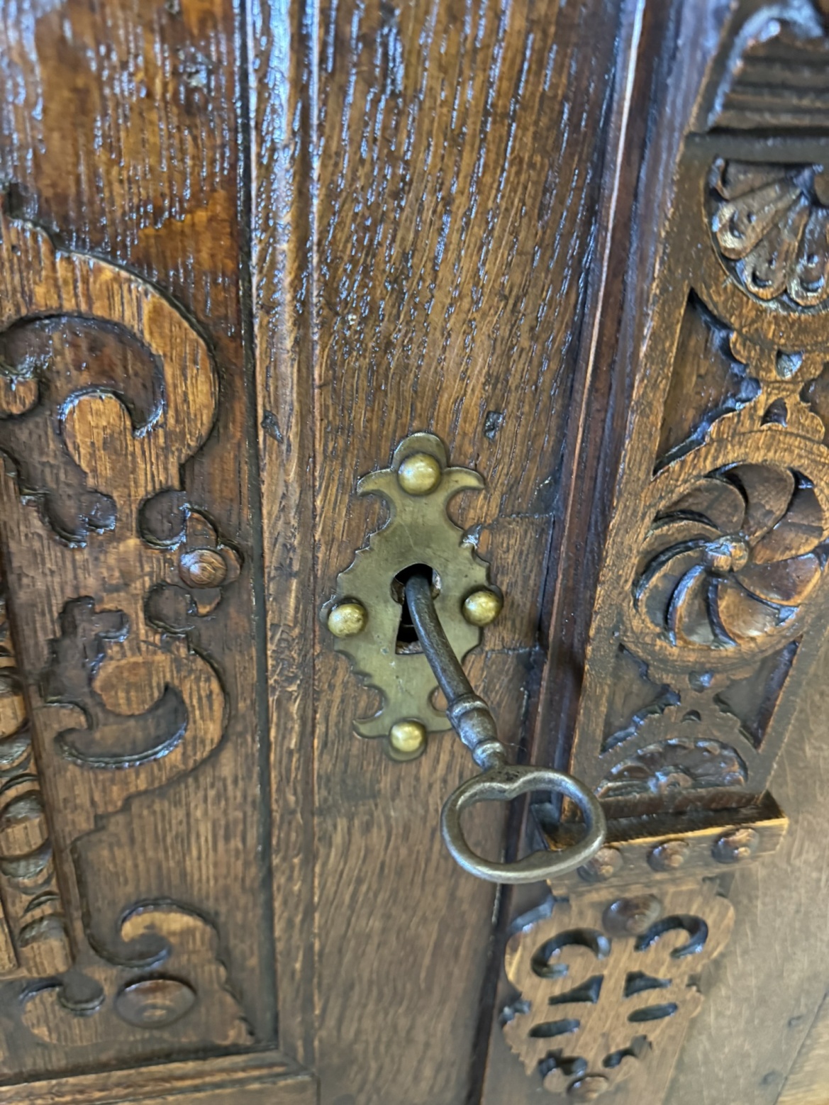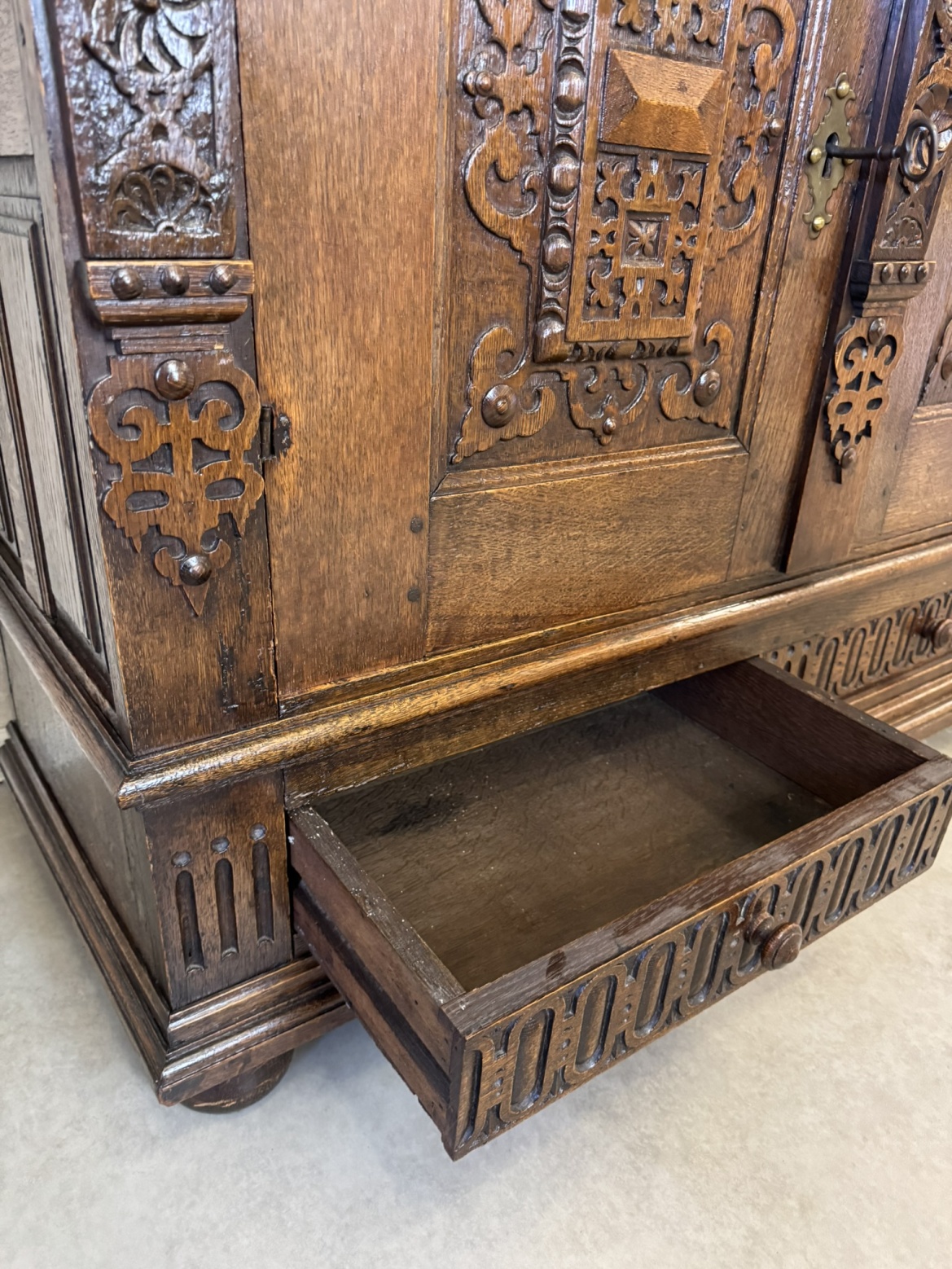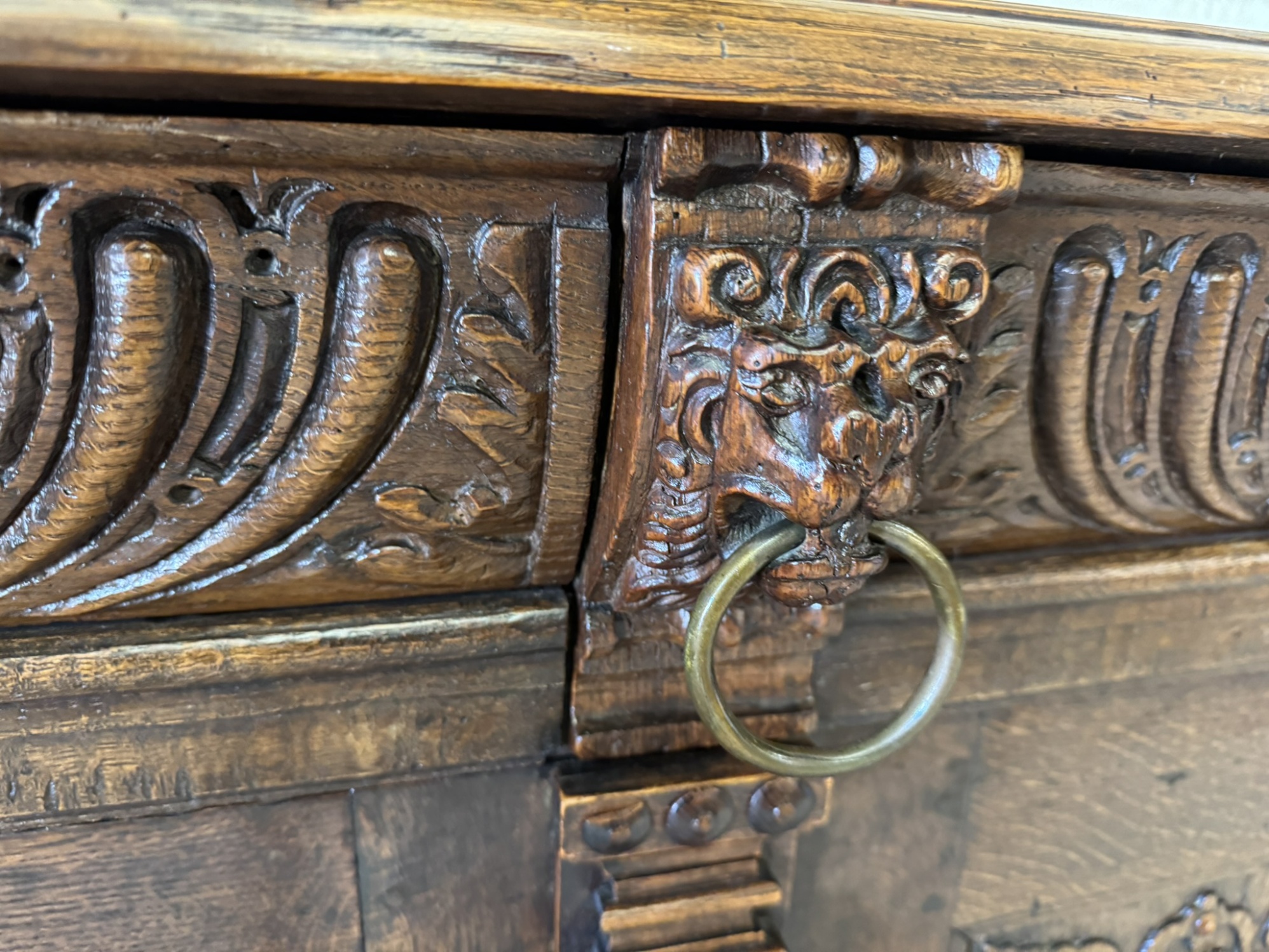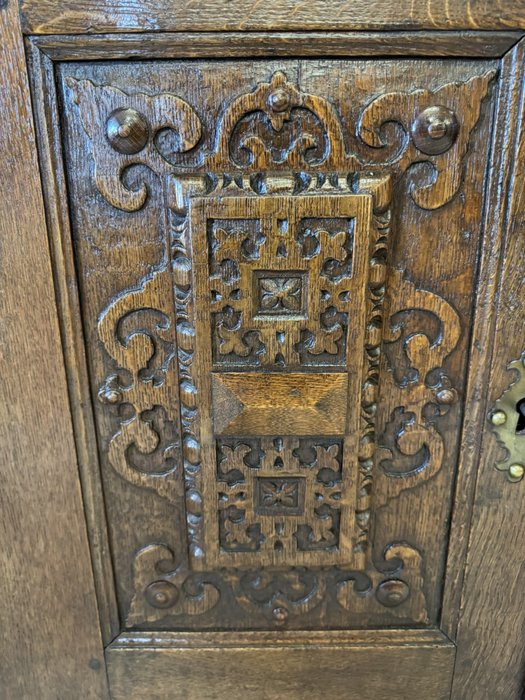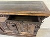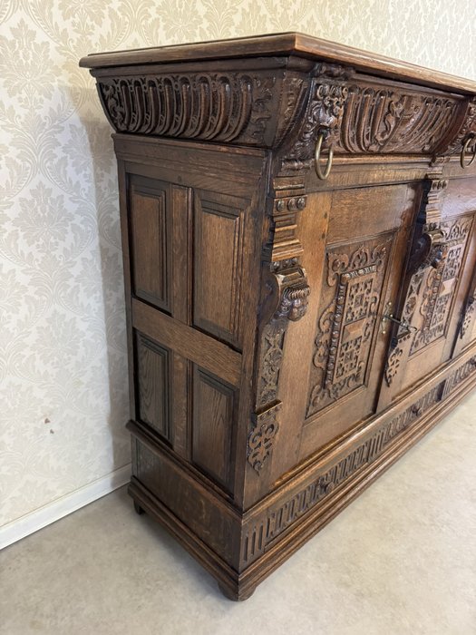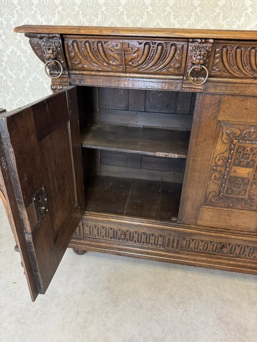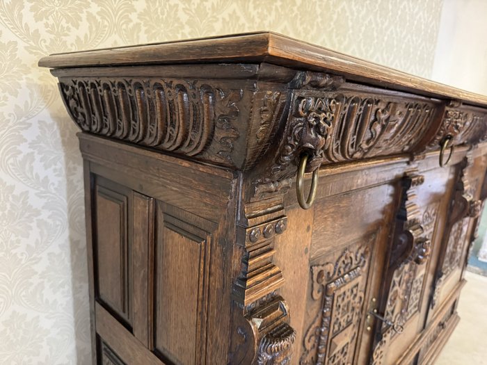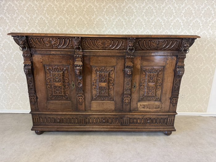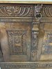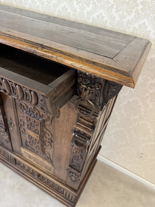 Komoda s výrazně profilovanou římsou, třemi dvířky zdobenými geometricko-ornamentálním reliéfem. Horní část nese motivy akantových listů a lvích hlav s kovovými kruhy, spodní pás dekorován rytým vzorem. Tento kus má svůj původ ve Francii rok 1790.28 450 Kč