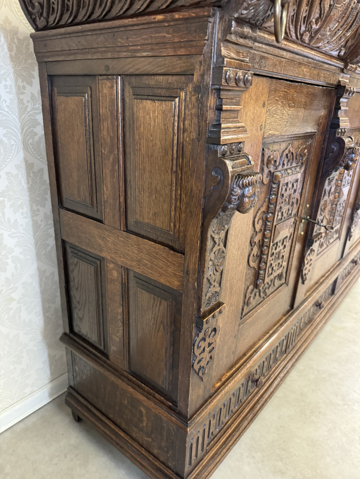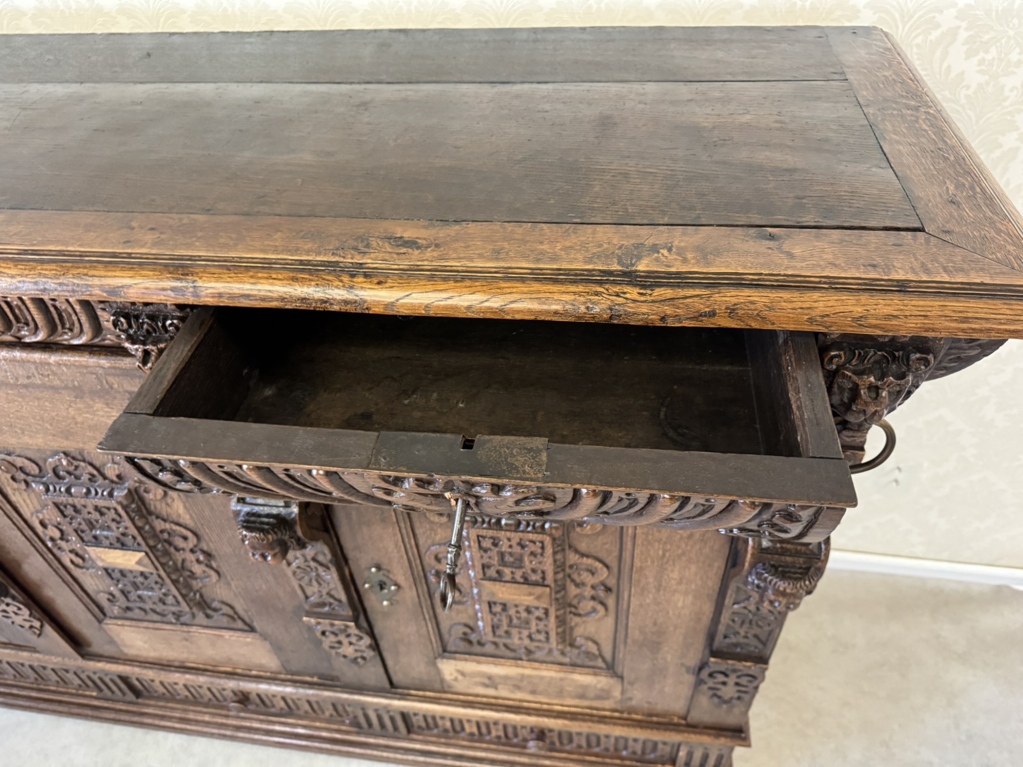 Třídveřová komoda s bohatým řezbováním, maskarony a dekorativními sloupky - f54