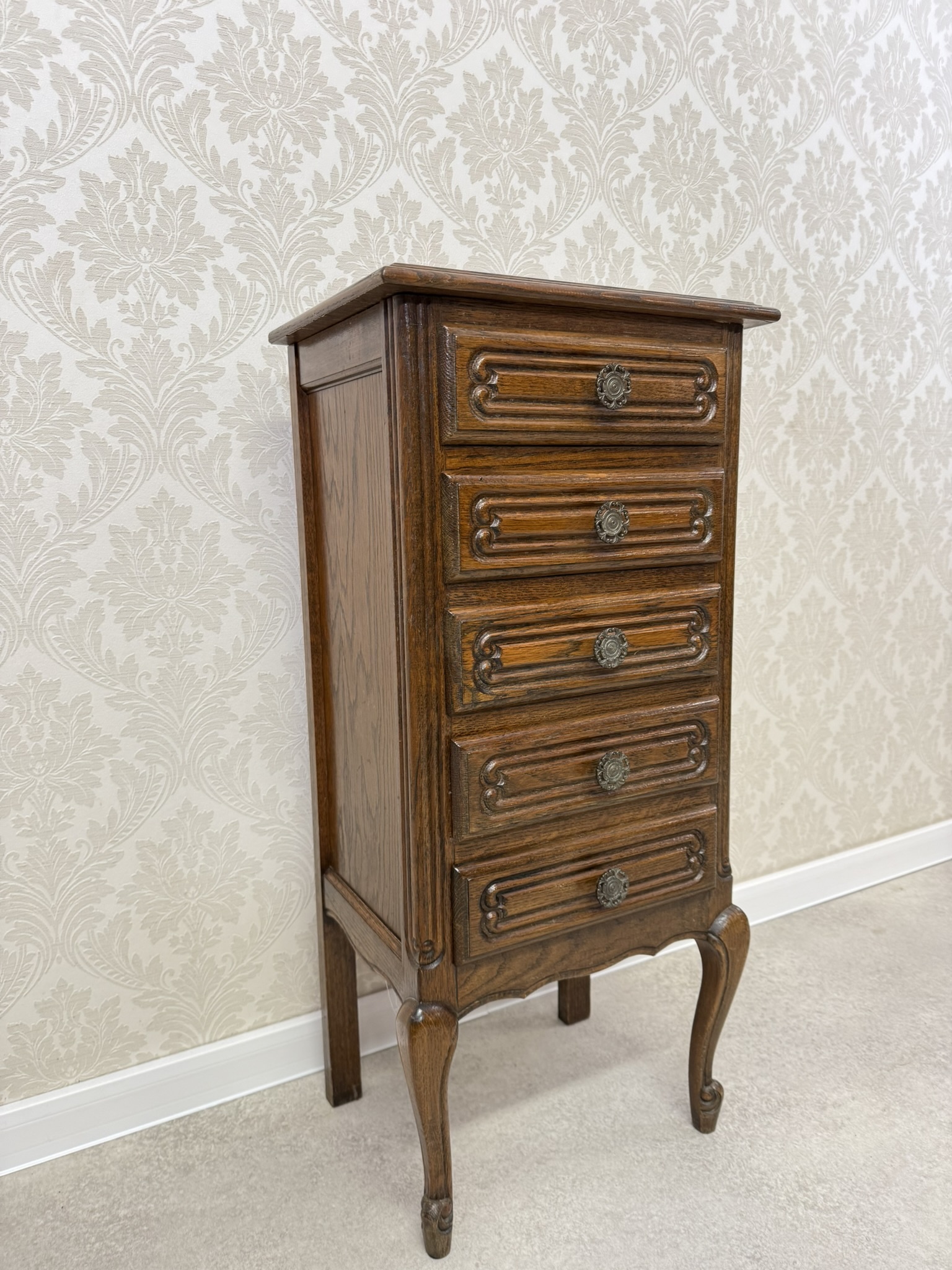 Čela pěti zásuvek jsou zdůrazněna profilovanými lištami a dekorativními kovovými úchyty. Štíhlé křivkované nohy dodávají komodě lehkost a vzdušnost.