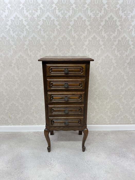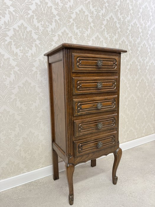 Komoda s ladně prohnutými nohami, jemně tvarovanou horní deskou a bohatě profilovanými zásuvkami. Čelní plochy jsou zdobeny decentní řezbou a mosaznými úchyty s rokokovou ornamentikou.