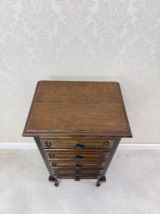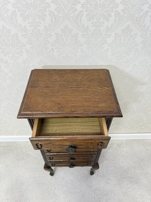 Komoda disponuje třemi zásuvkami s decentně vyřezávaným dekorem a mosaznými úchytkami. Vnitřek horní zásuvky je vyložen zelenou plstí. Horní deska nese drobné známky používání, odpovídající stáří nábytku.Zásuvková komoda