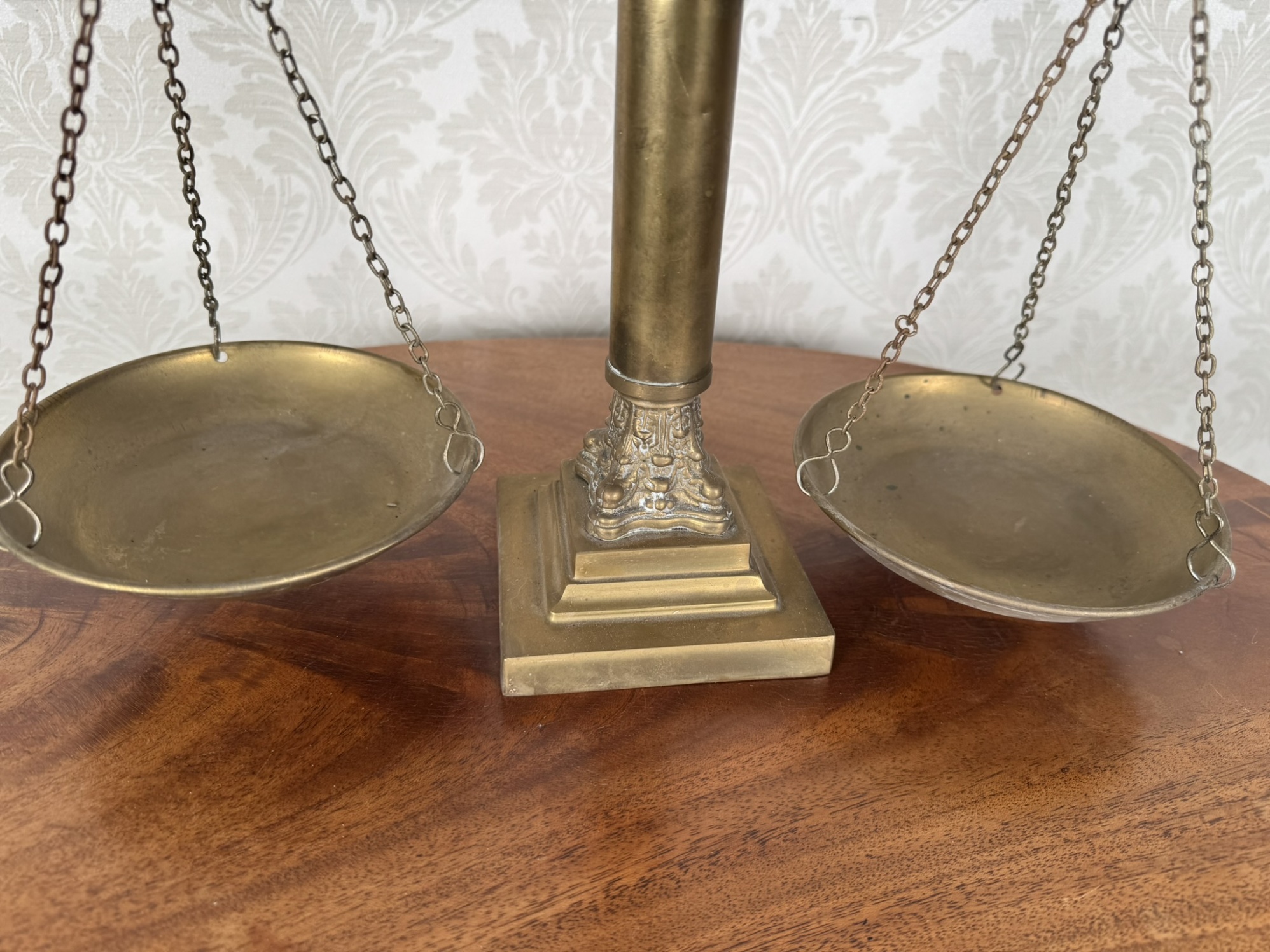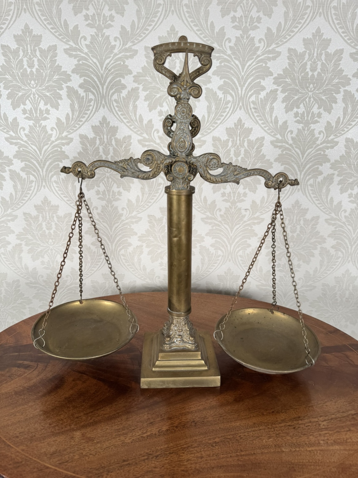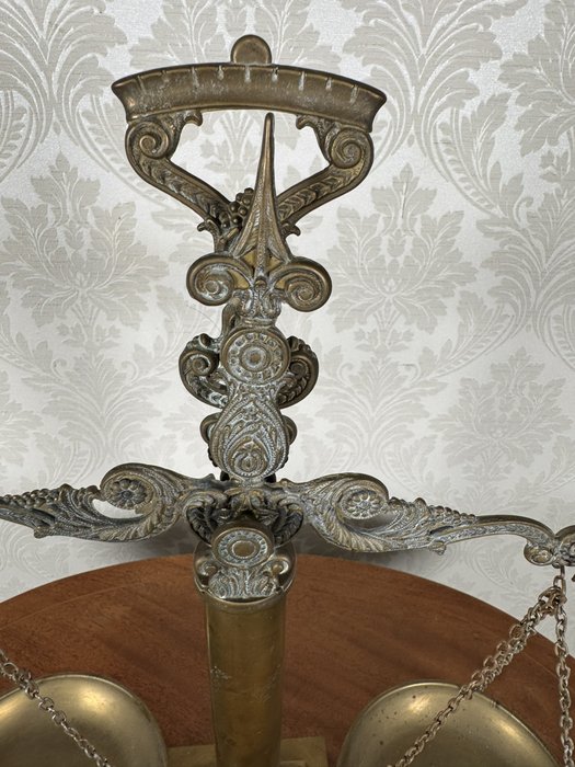 Dekorativní váhy s bohatě tvarovaným tělem, volutovými detaily a symetrickým zdobením ve vrcholně dekorativním pojetí. Dva miskové závěsy na řetízcích doplňuje centrální ručička s číselníkem.2 980 Kč