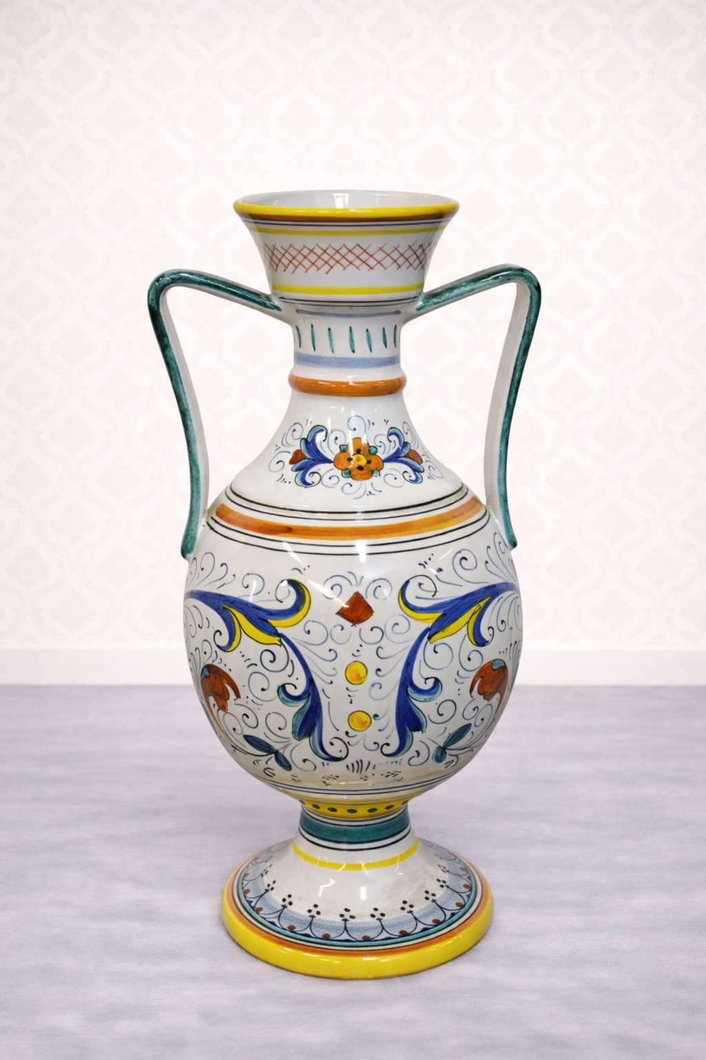 Váza je zdobena ornamenty v živých barvách, které vynikají na světlém podkladu. Má elegantní tvar s dvouuchy a štíhlým hrdlem.