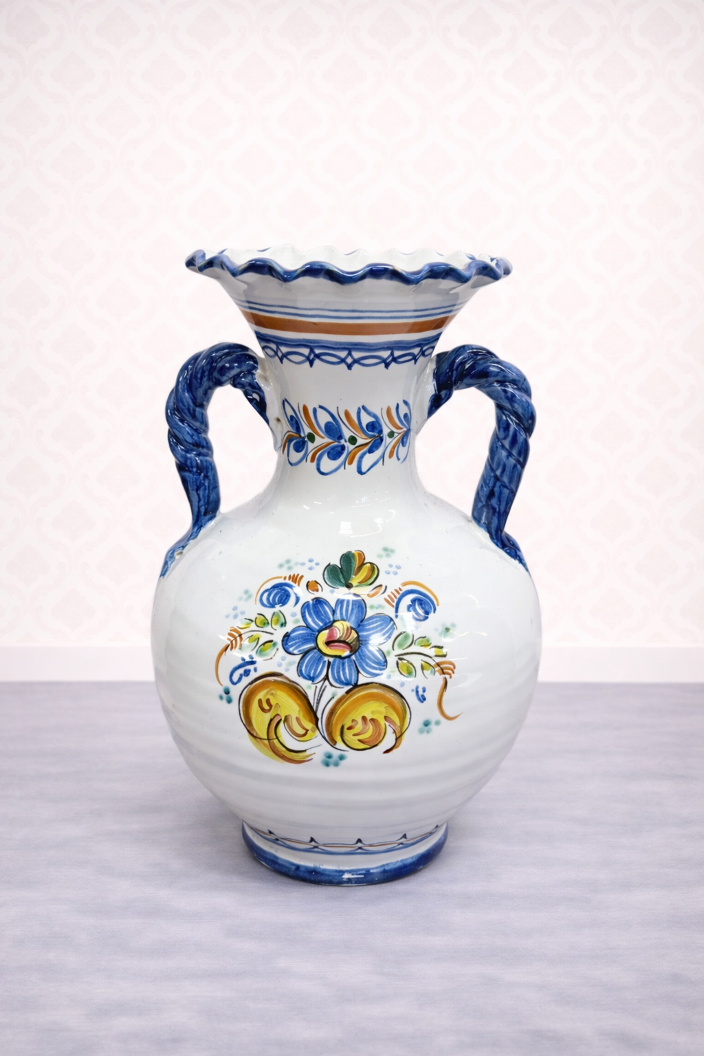 Tato půvabná keramická váza je zdobena pestrými květinovými motivy a má výrazné modré úchyty a zvlněný okraj.