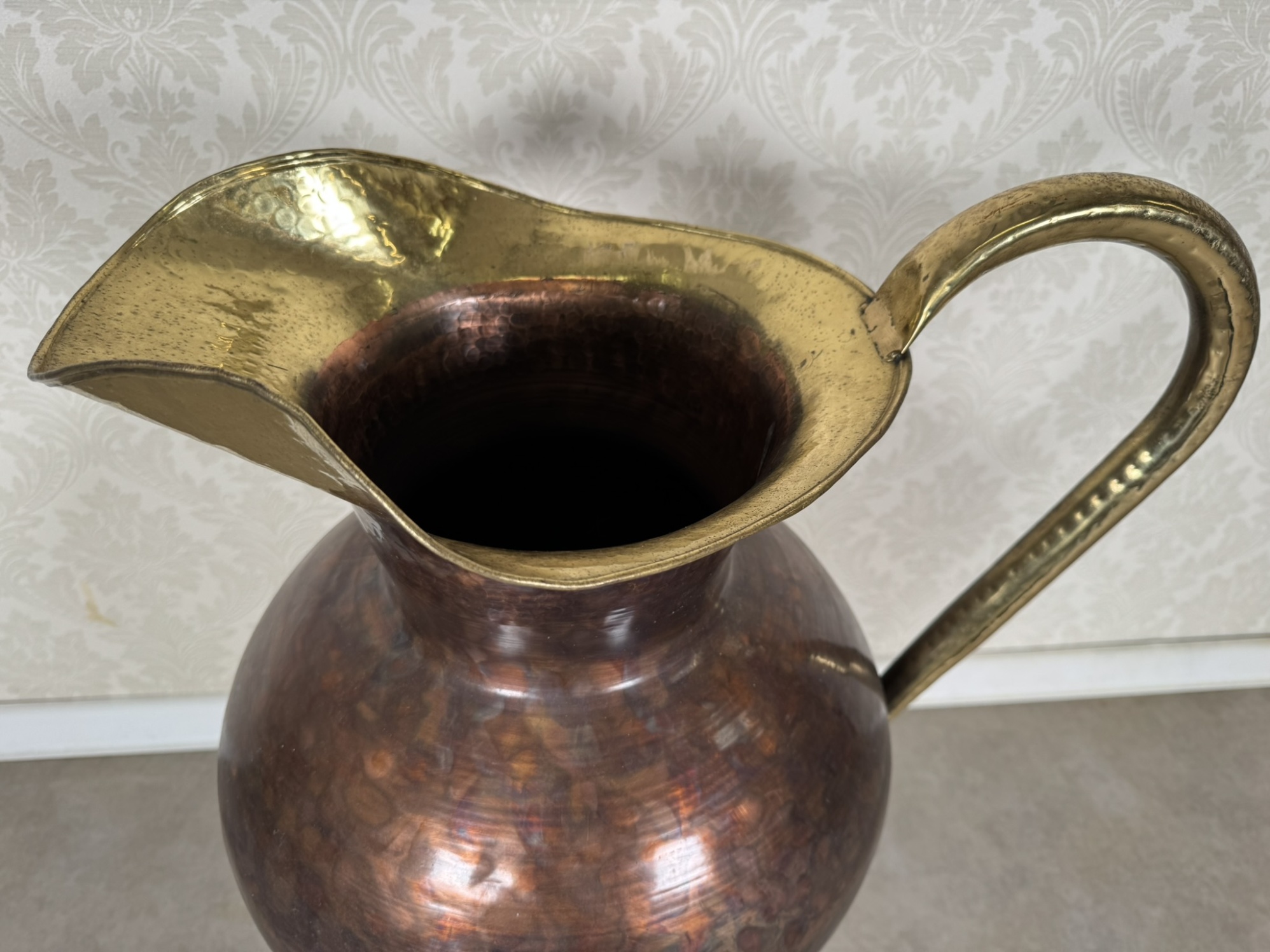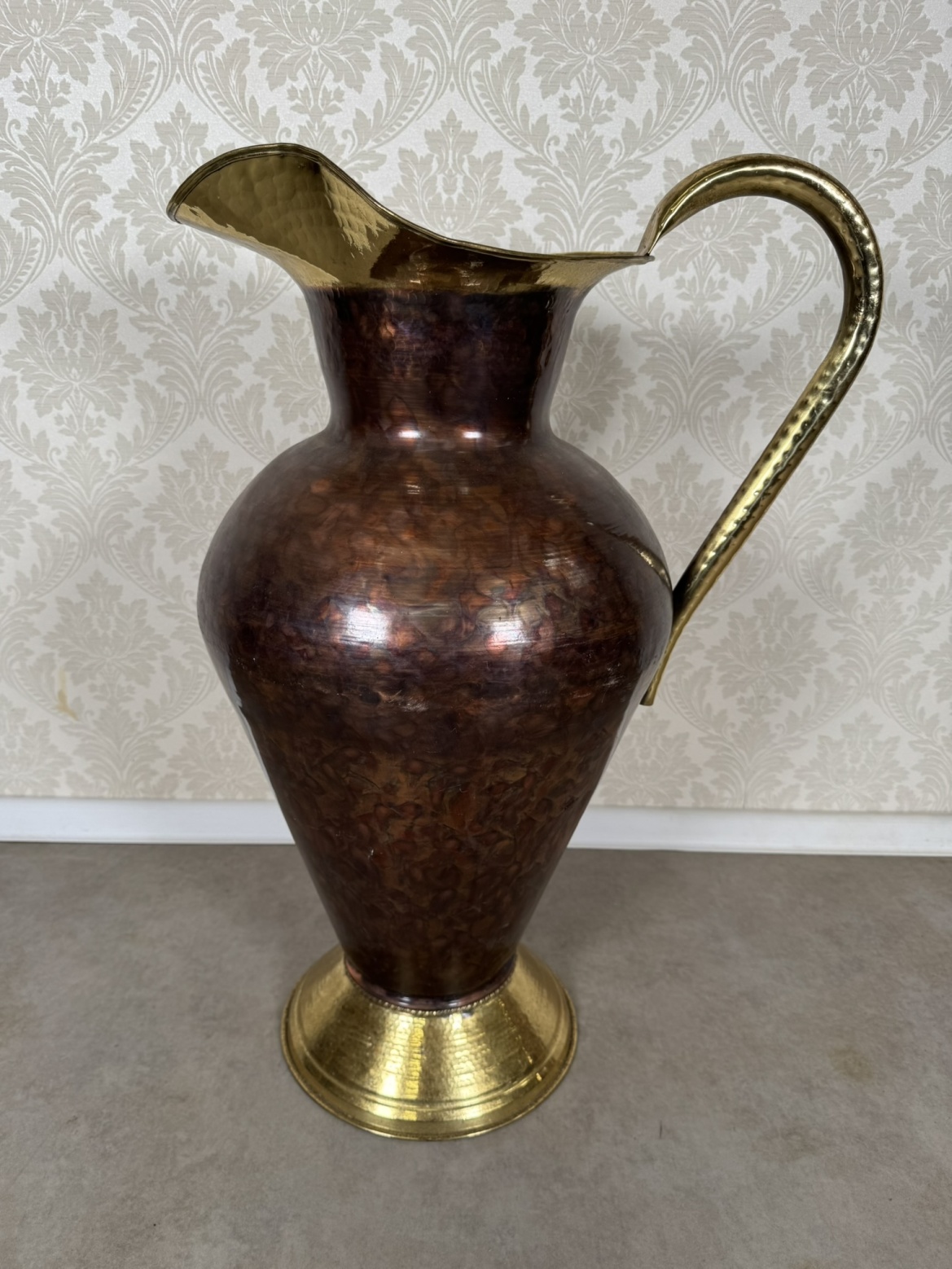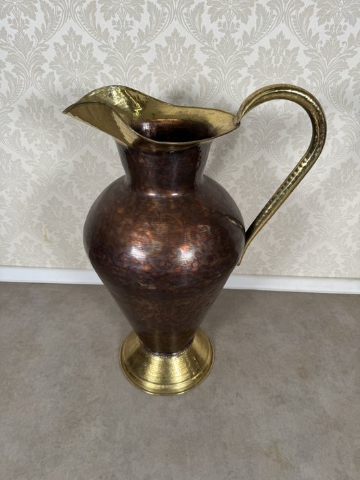 Džbán z tepané mědi s leskle mosazným hrdlem, podstavcem a robustním zdobeným uchem. Vysoká kuželovitá forma s výrazným kontrastem barev a materiálů vytváří dekorativní dojem.4 380 Kč