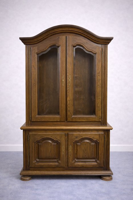 Vitrína s prosklenými horními dvířky a plnými dolními dvířky. Je zdobena jemnými vyřezávanými detaily a stojí na pevných nožkách. Venkovský styl.