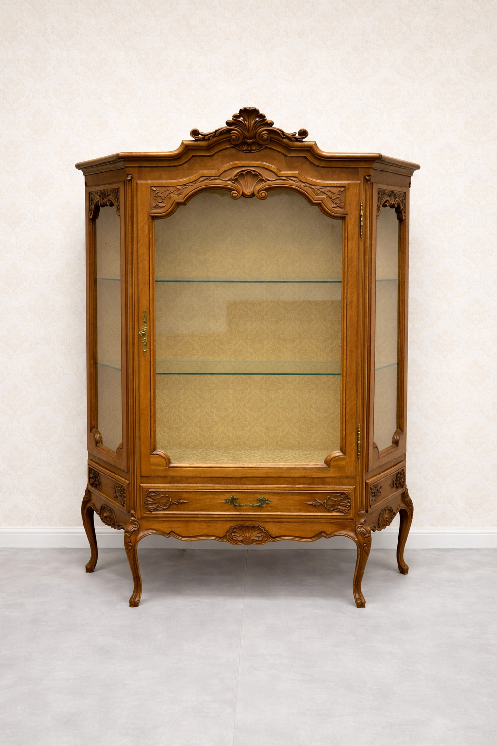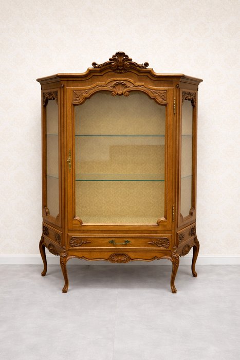 Tato luxusní vitrína z masivního dřeva vyniká svou jemnou řezbou a ladnými liniemi charakteristickými pro styl Ludvíka XV. Zakřivené nohy, zdobné detaily a jemná intarzie dodávají tomuto kusu noblesní vzhled. Skleněné panely po stranách i vpředu umožňují dokonalou prezentaci vystavených předmětů. Ve spodní části se nachází praktická zásuvka poskytující dodatečný úložný prostor.